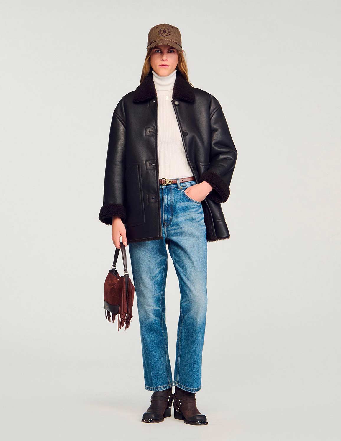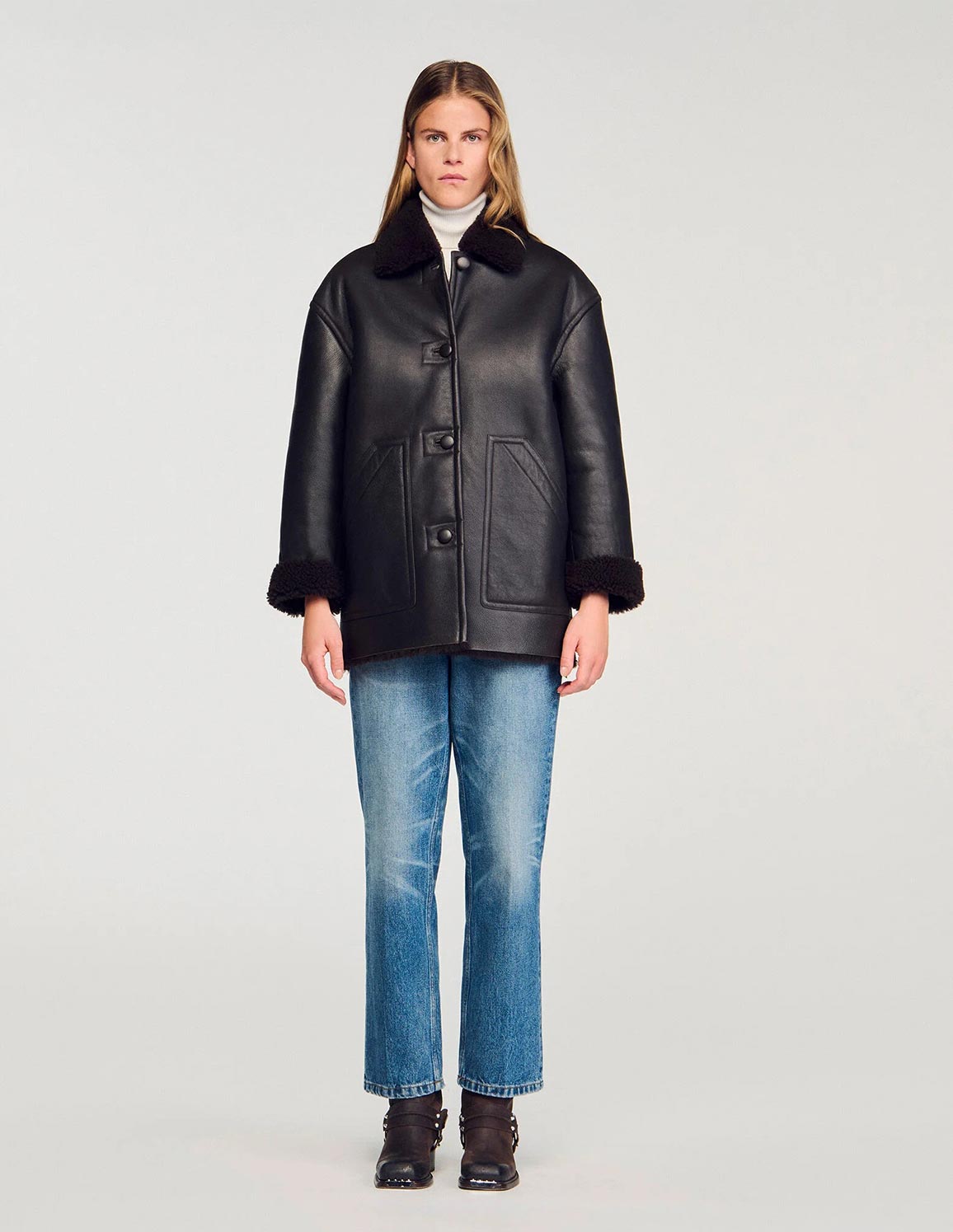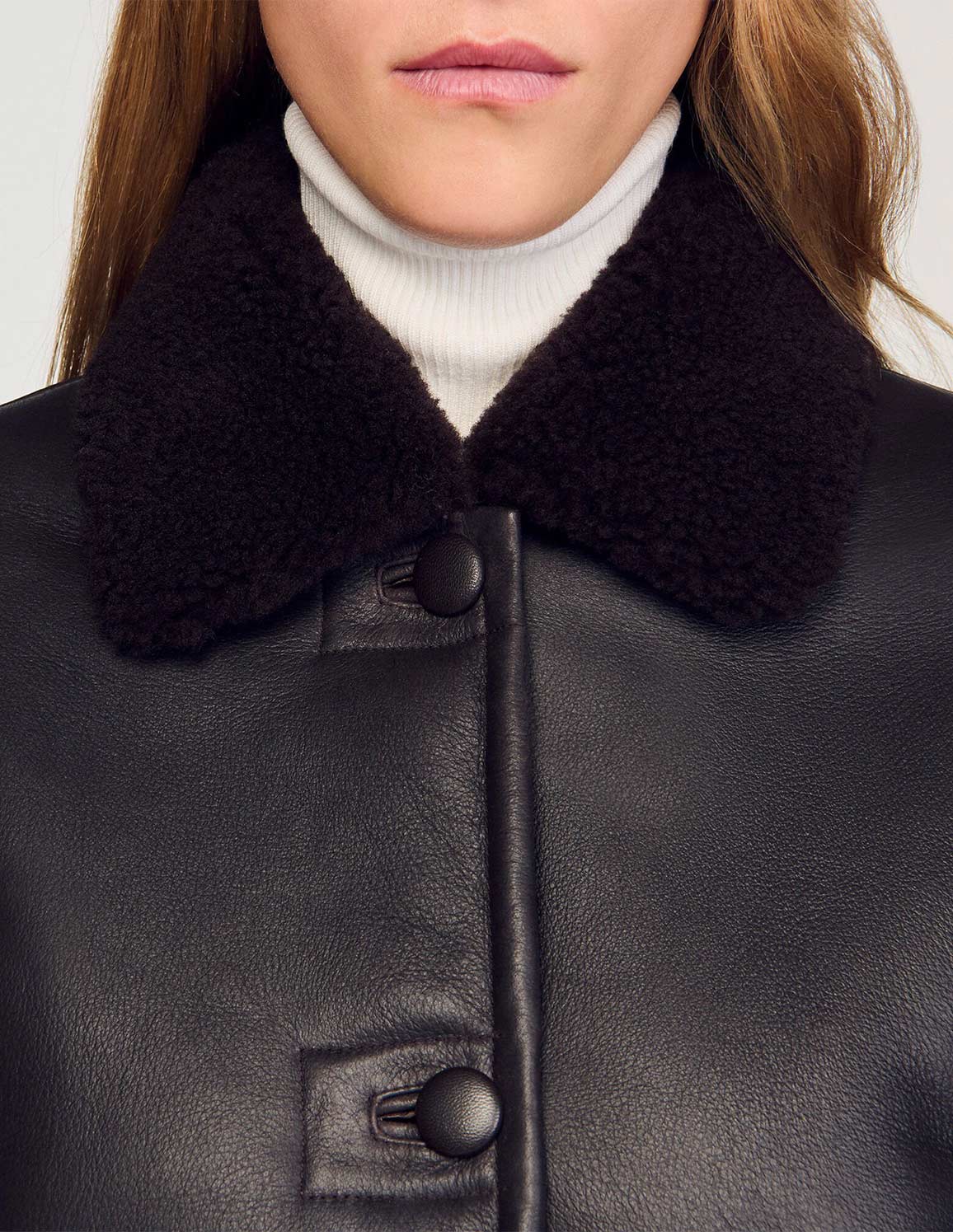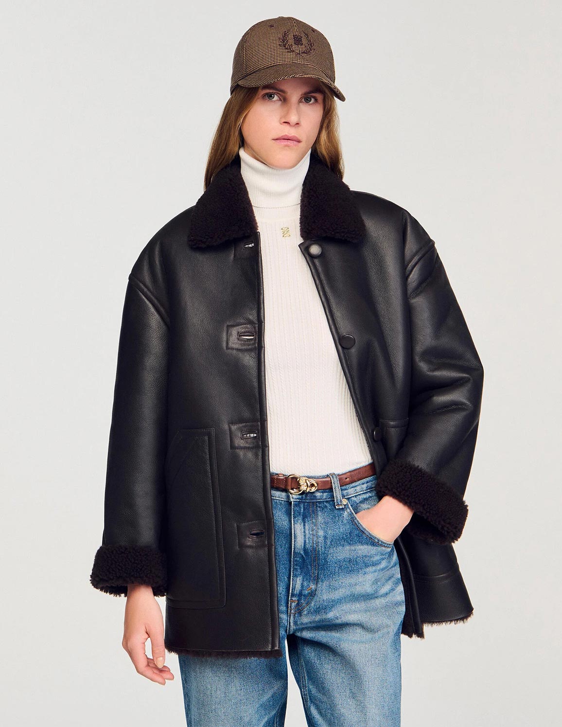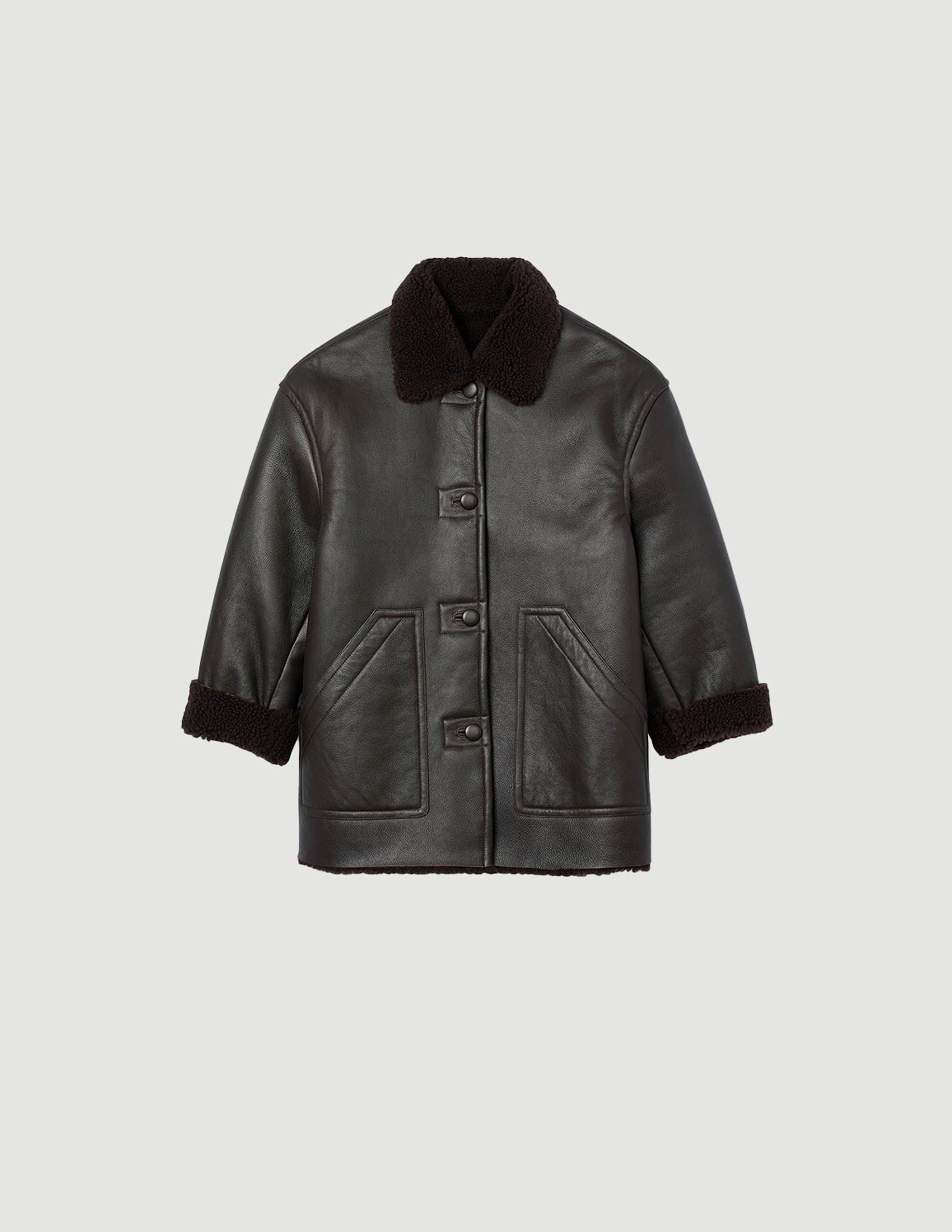 • Shearling coat with fur-lined interior and collar, with sleeves and covered button fastening.