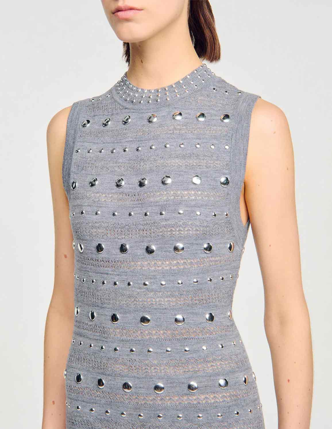 • Sleeveless maxi dress in stretch pointelle knit with round neck, ruffled hem and silver metal studs.