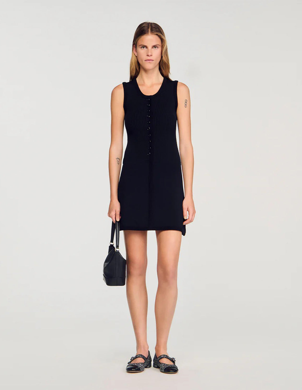 • Short rib-knit dress with a round neck and tone-on-tone press-stud fastening.