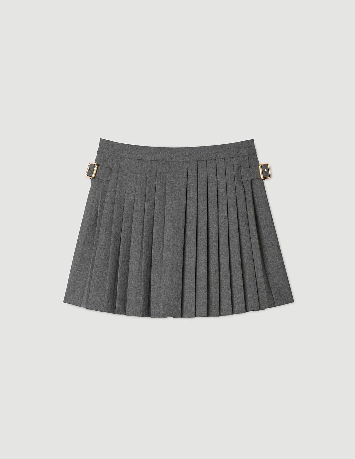 • Virgin wool skort with pleats, featuring metal buckles on the sides and a back zip fastening.