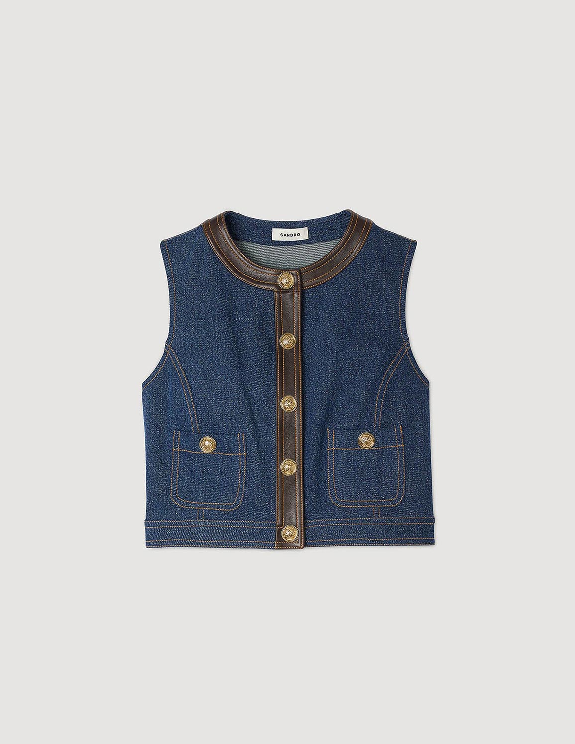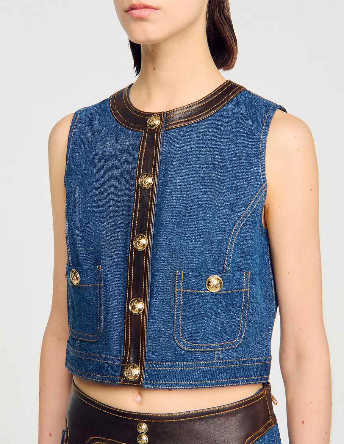 • Cropped denim top with contrasting leather trim at the neckline and placket, with buttoned patch pockets and a button fastening.