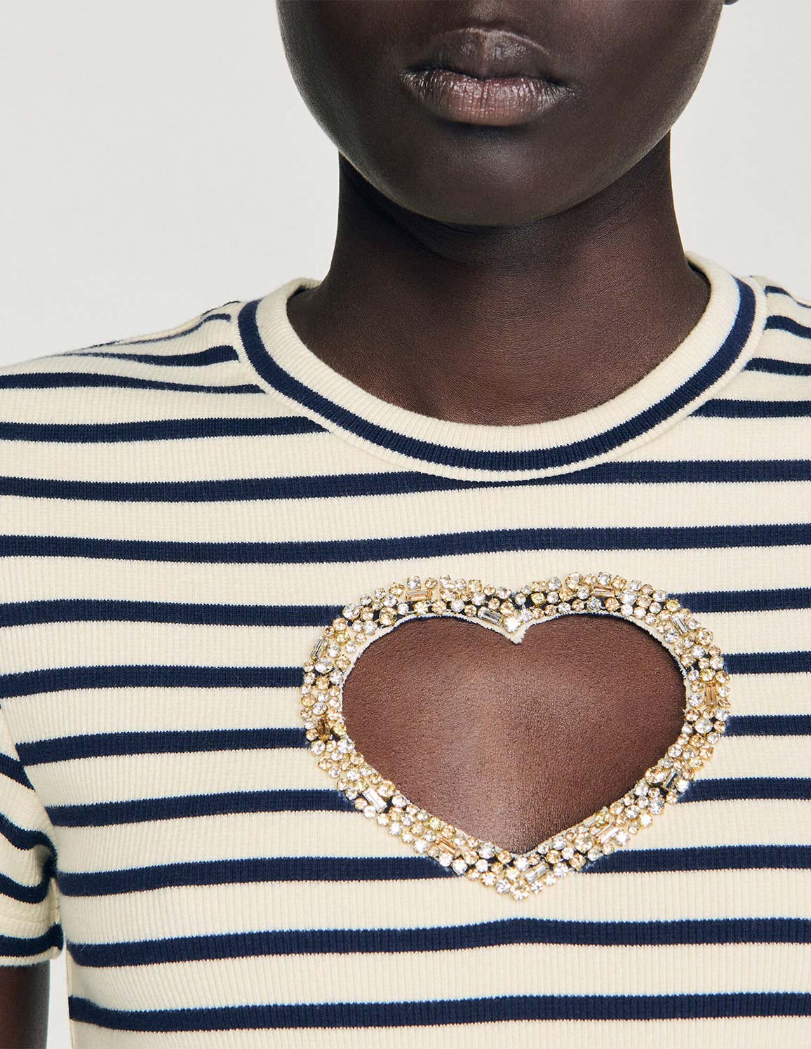 • Striped T-shirt with round neck and short sleeves, featuring an openwork heart with rhinestones