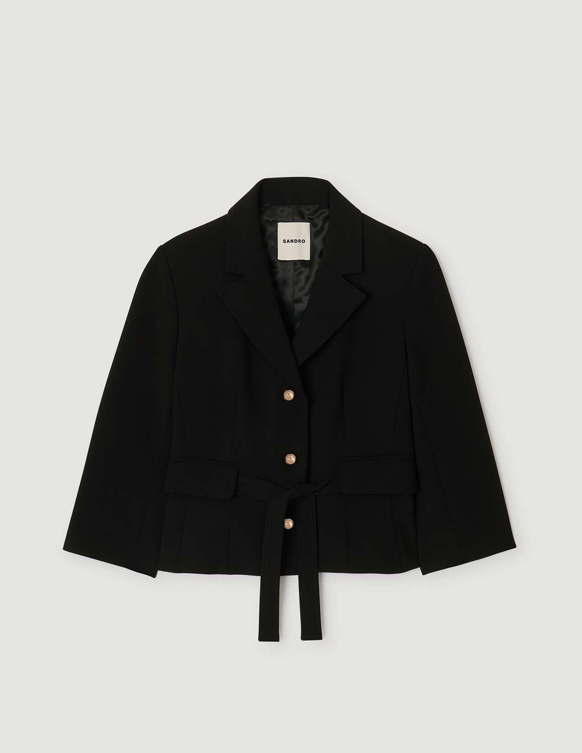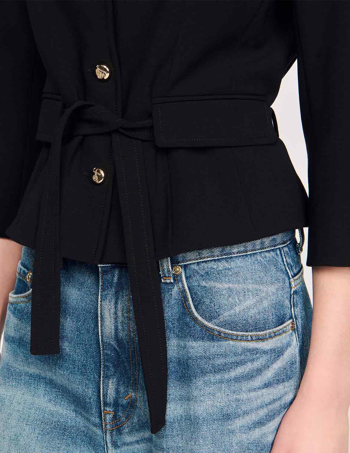 • Short belted jacket with a topstitched lapel collar, long sleeves, and welt flap pockets.
