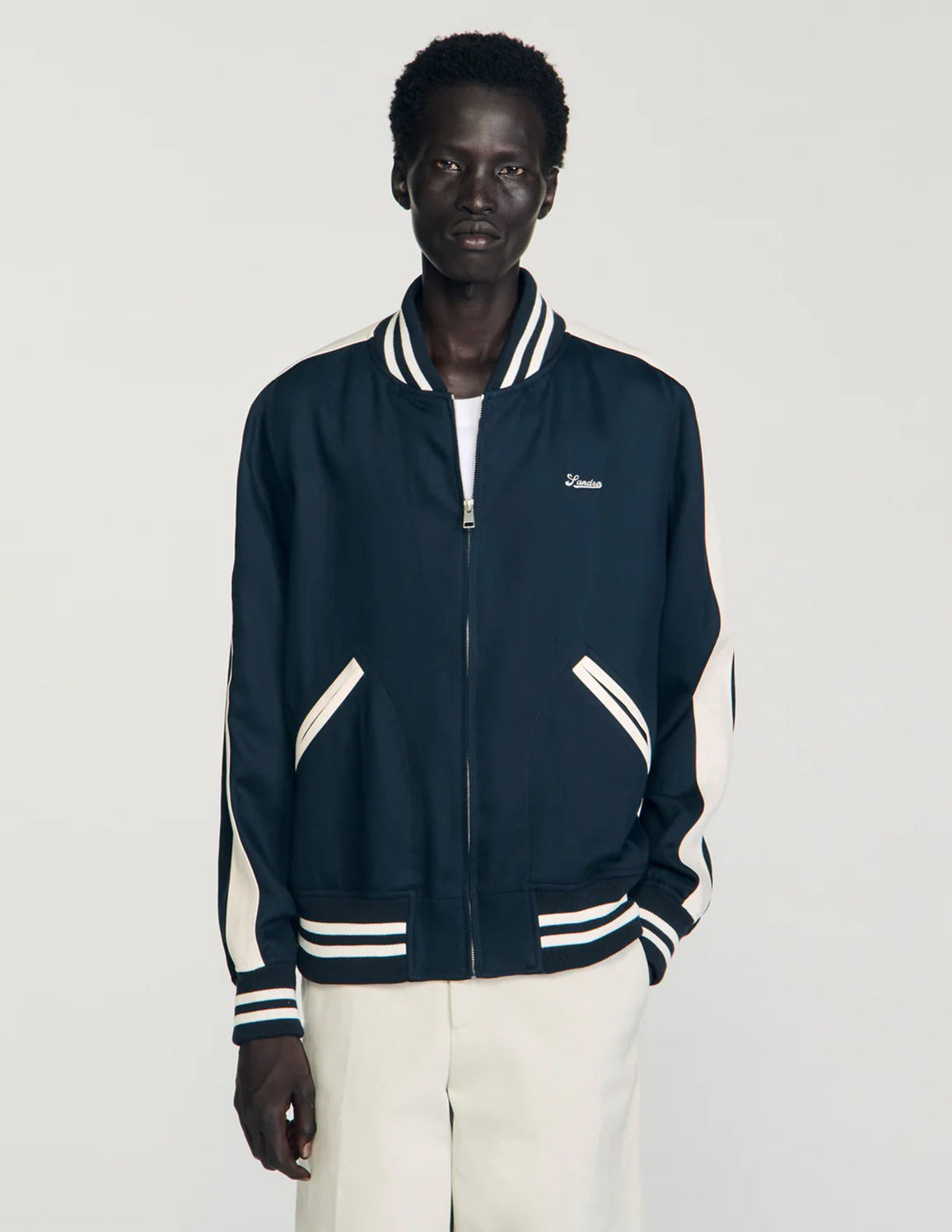 • College-style varsity jacket with contrast stripes, zip fastening, long sleeves and signature embroidery on the chest.