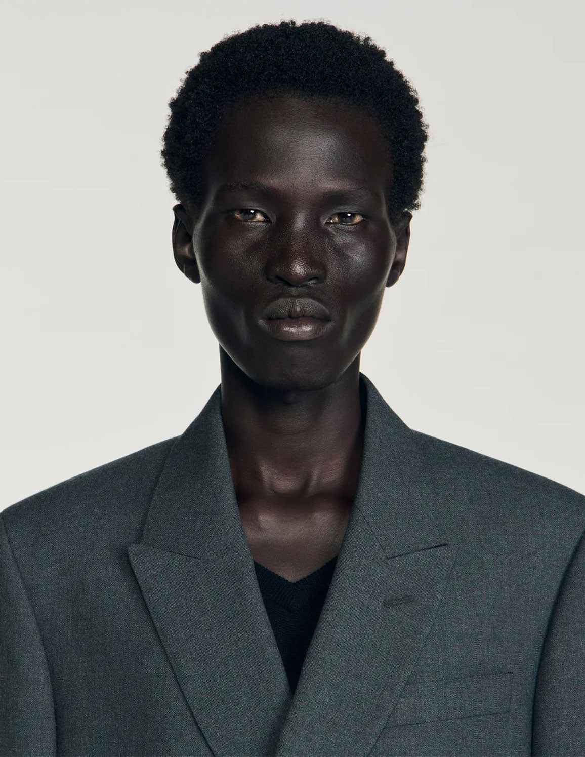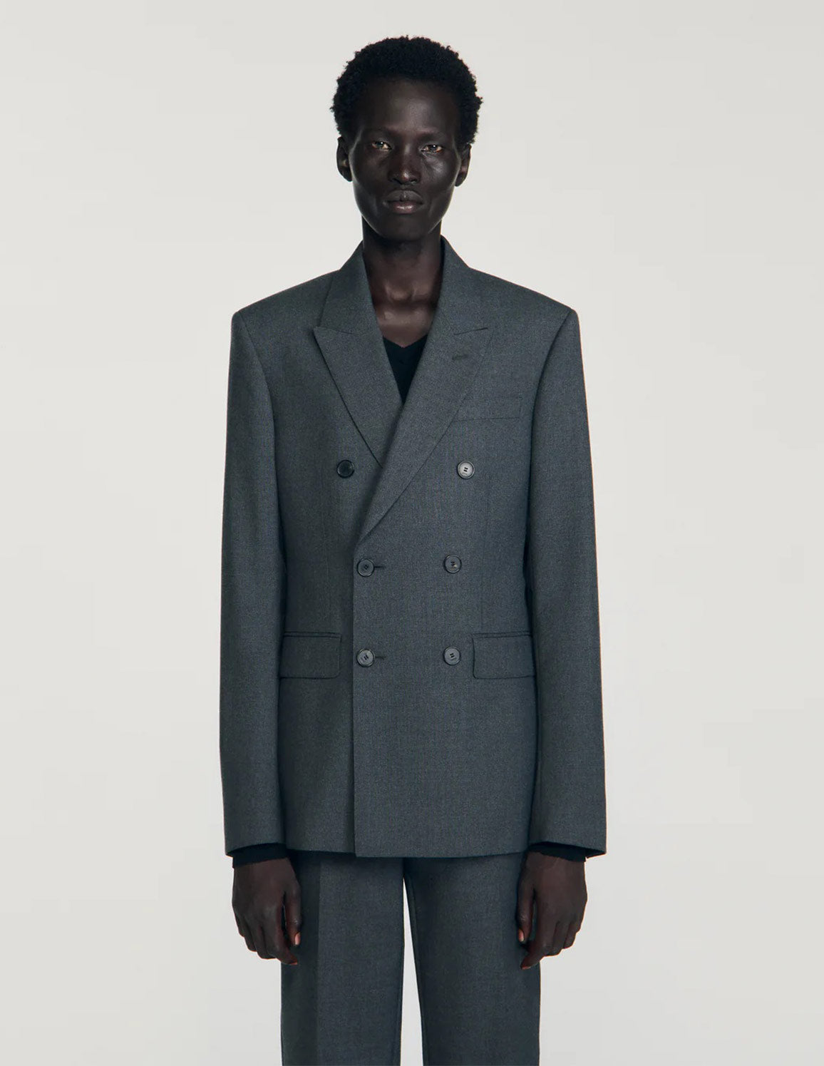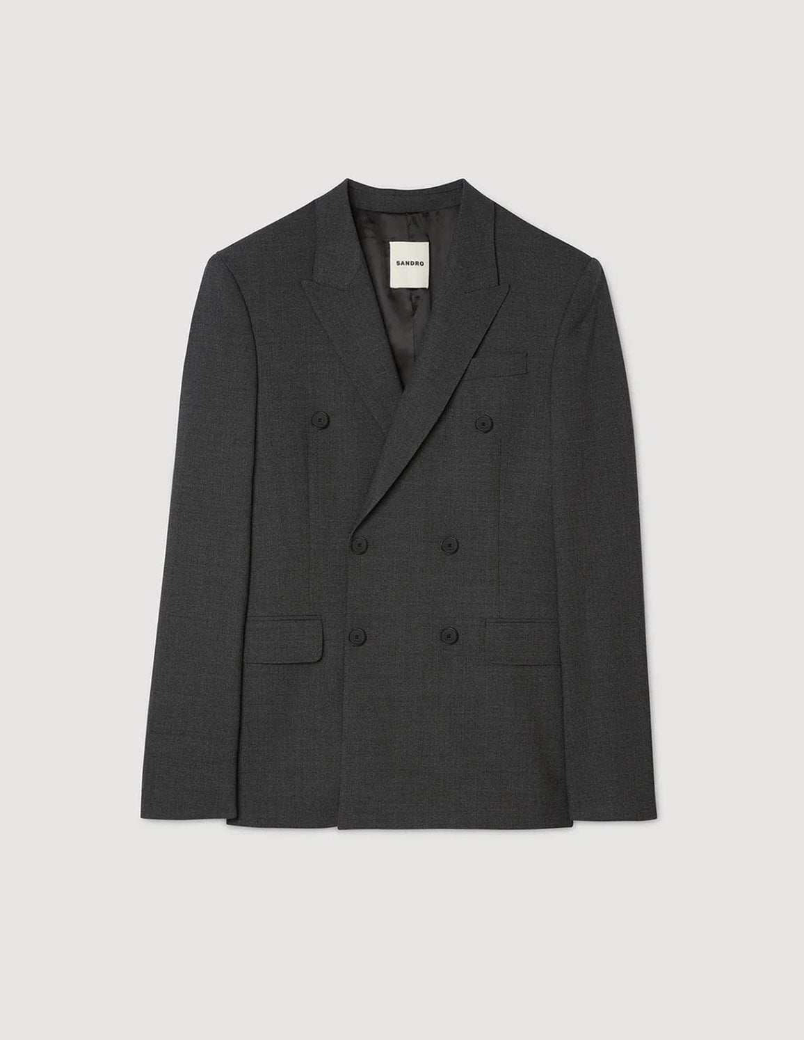 • Virgin wool suit jacket with a classic cut, featuring a tailored collar, long sleeves, double-breasted with 6 buttons and flap pockets.