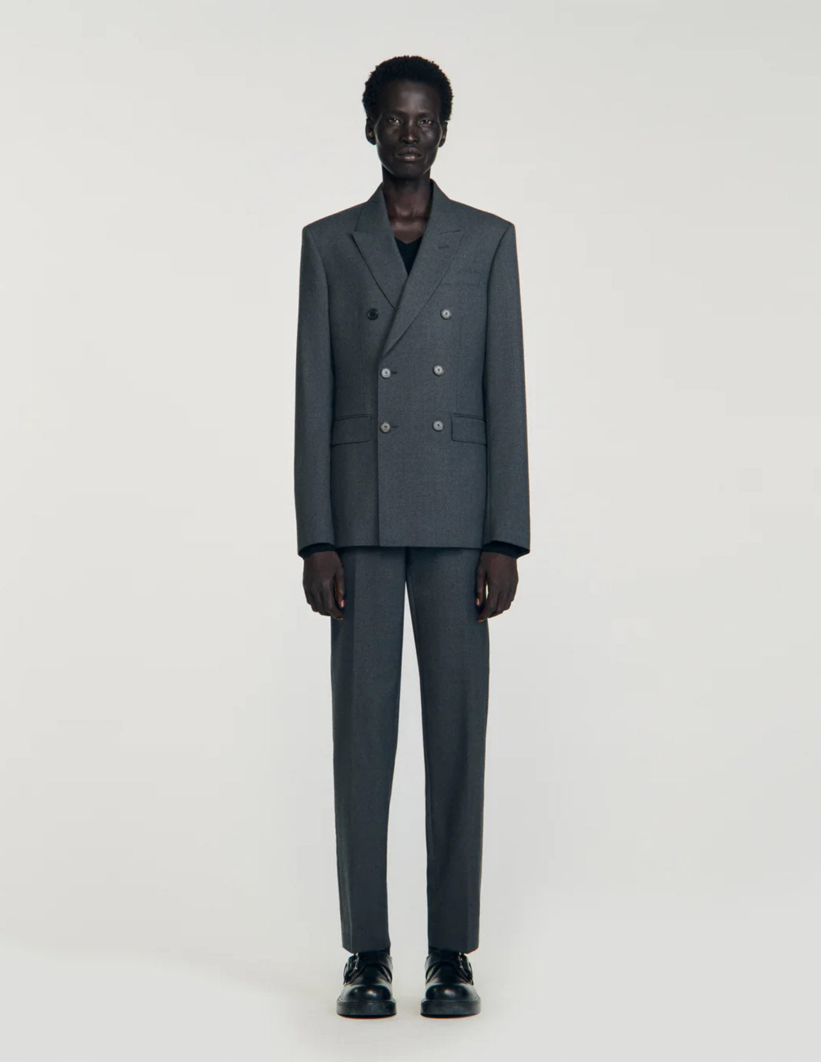 • SANDRO - Men's Croise Amf Double-Breasted Suit Jacket Heather Charcoa