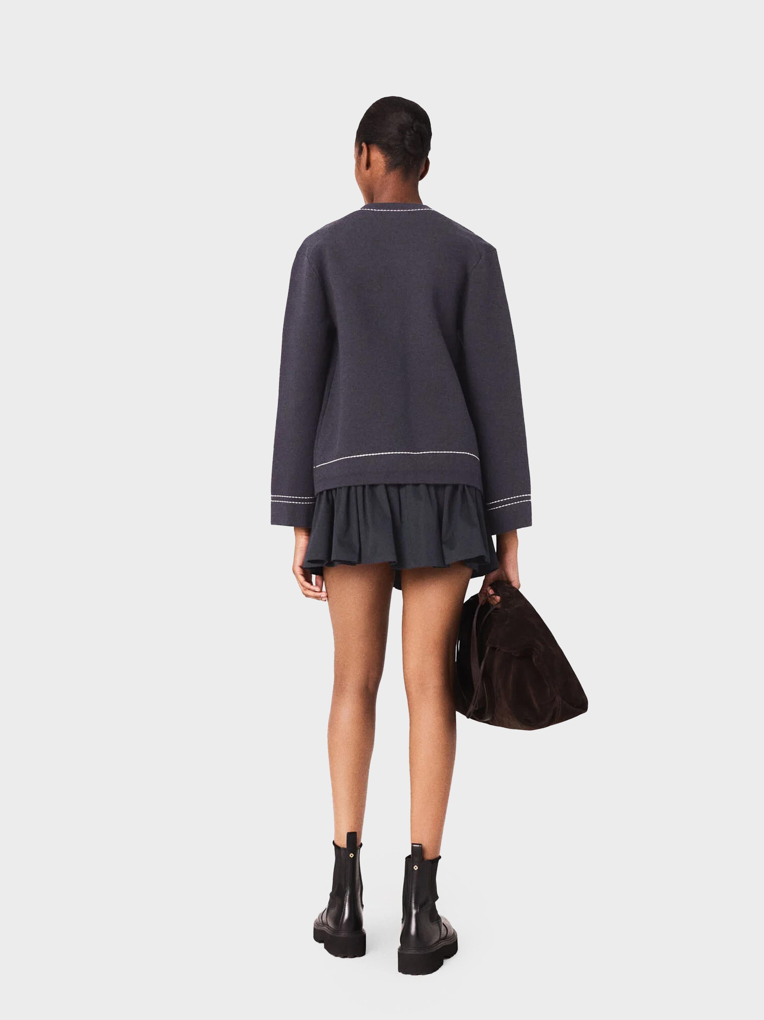 • Preppy and chic, this cardigan elegantly elongates the silhouette and focuses on couture details, such as contrasting topstitching and signature buttons.