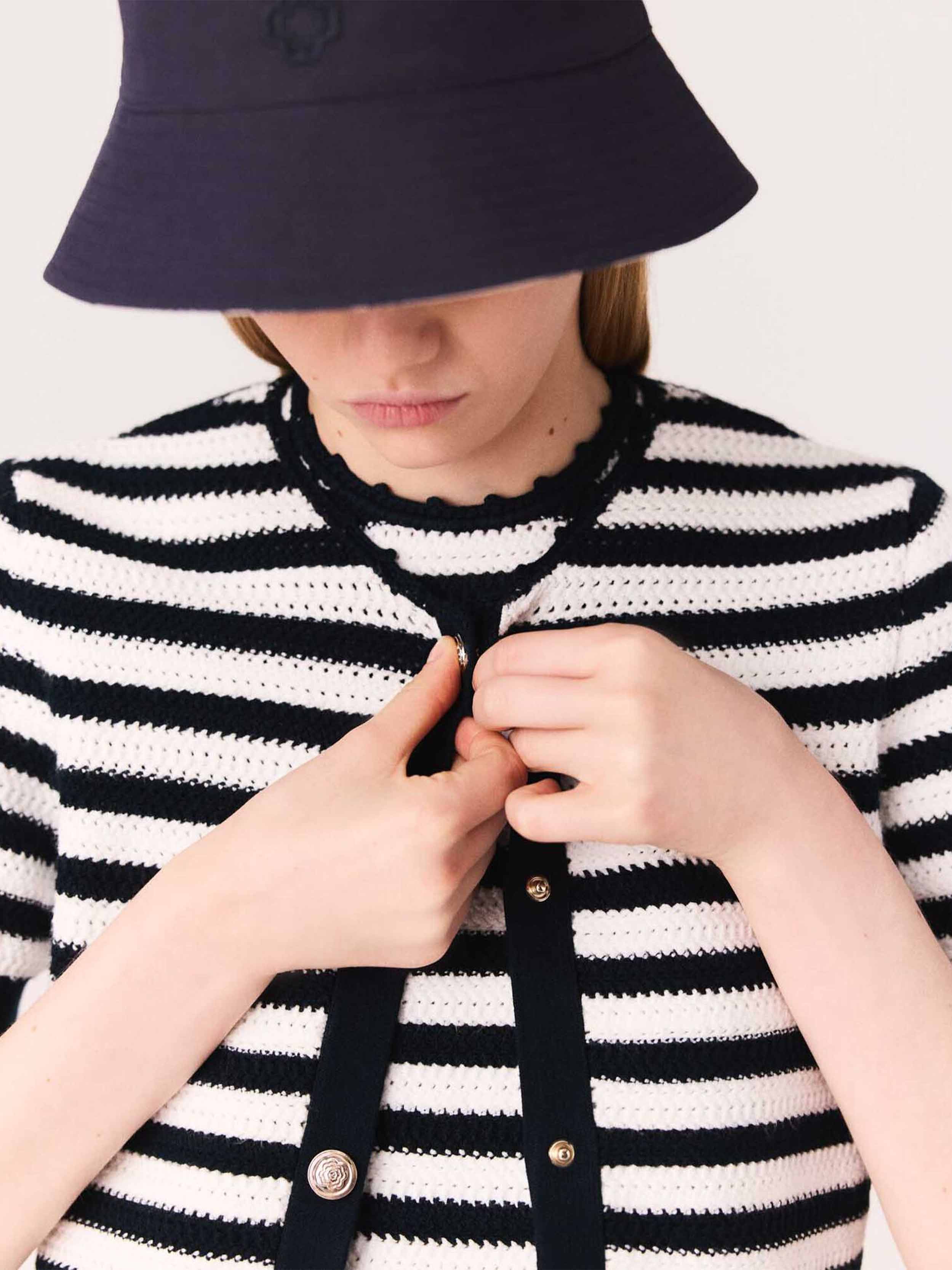 • This two-tone striped crochet cardigan stylishly revisits the Breton look. The round neck, short sleeves and ribbed finishes create a striking silhouette.