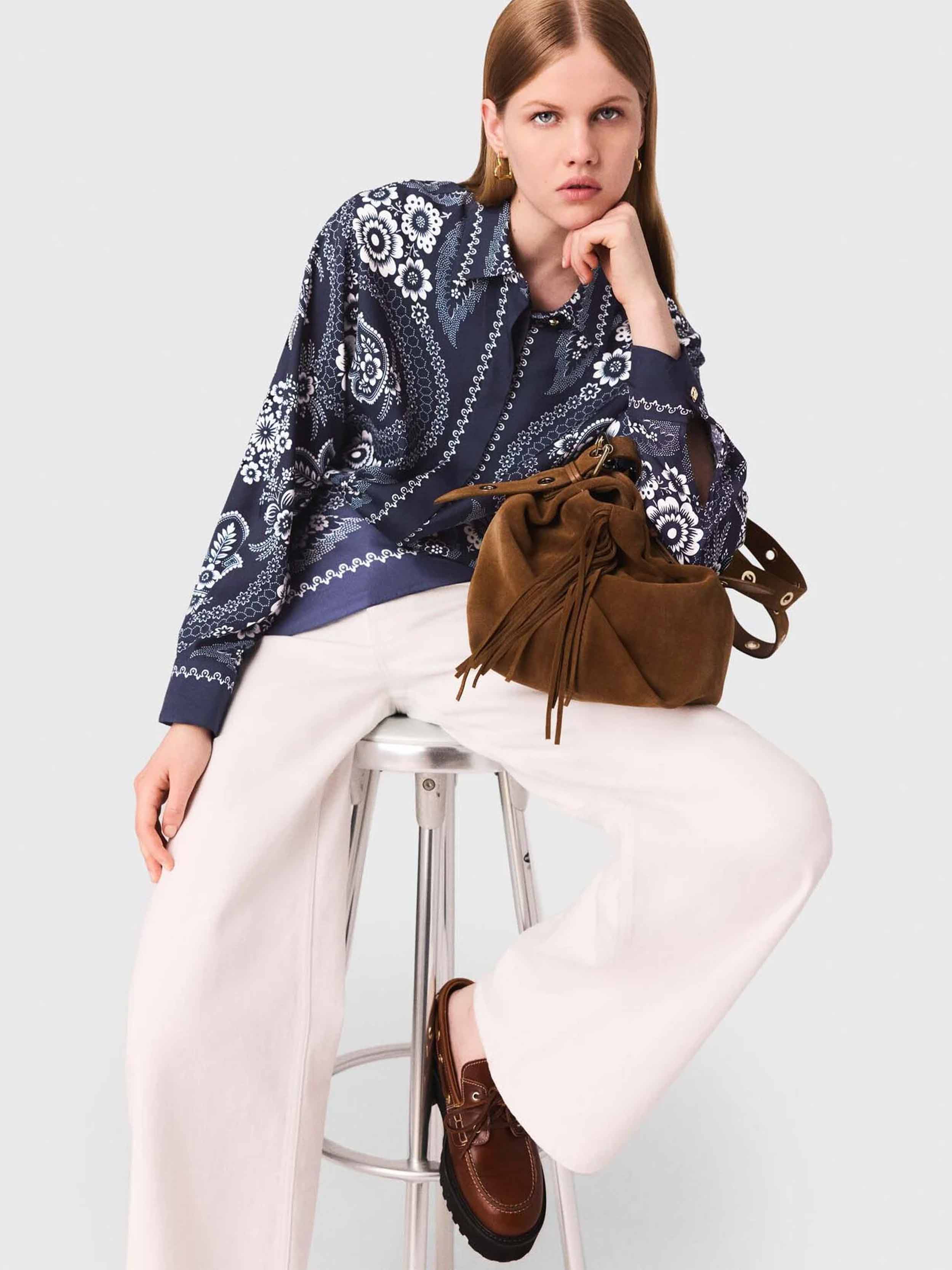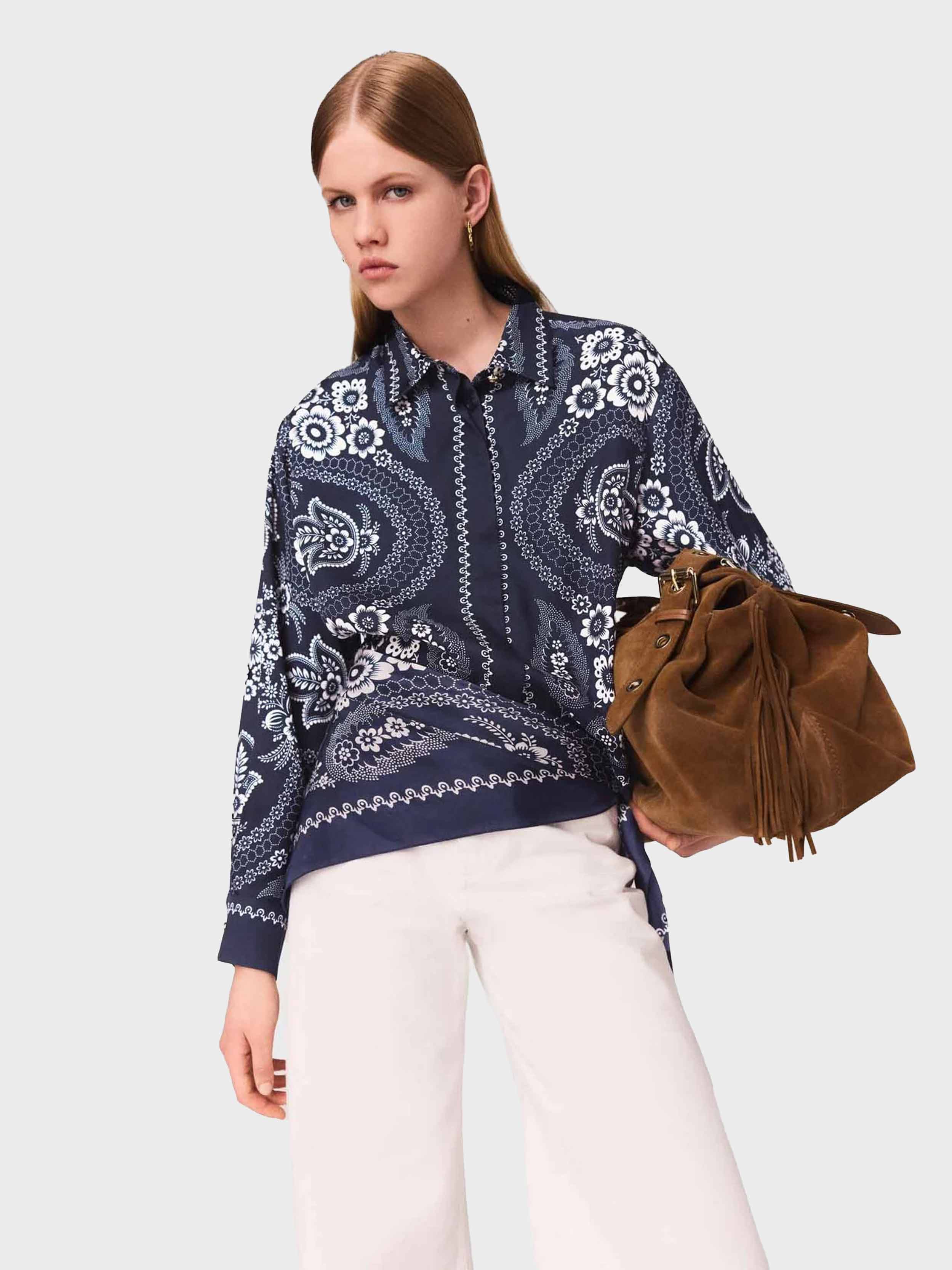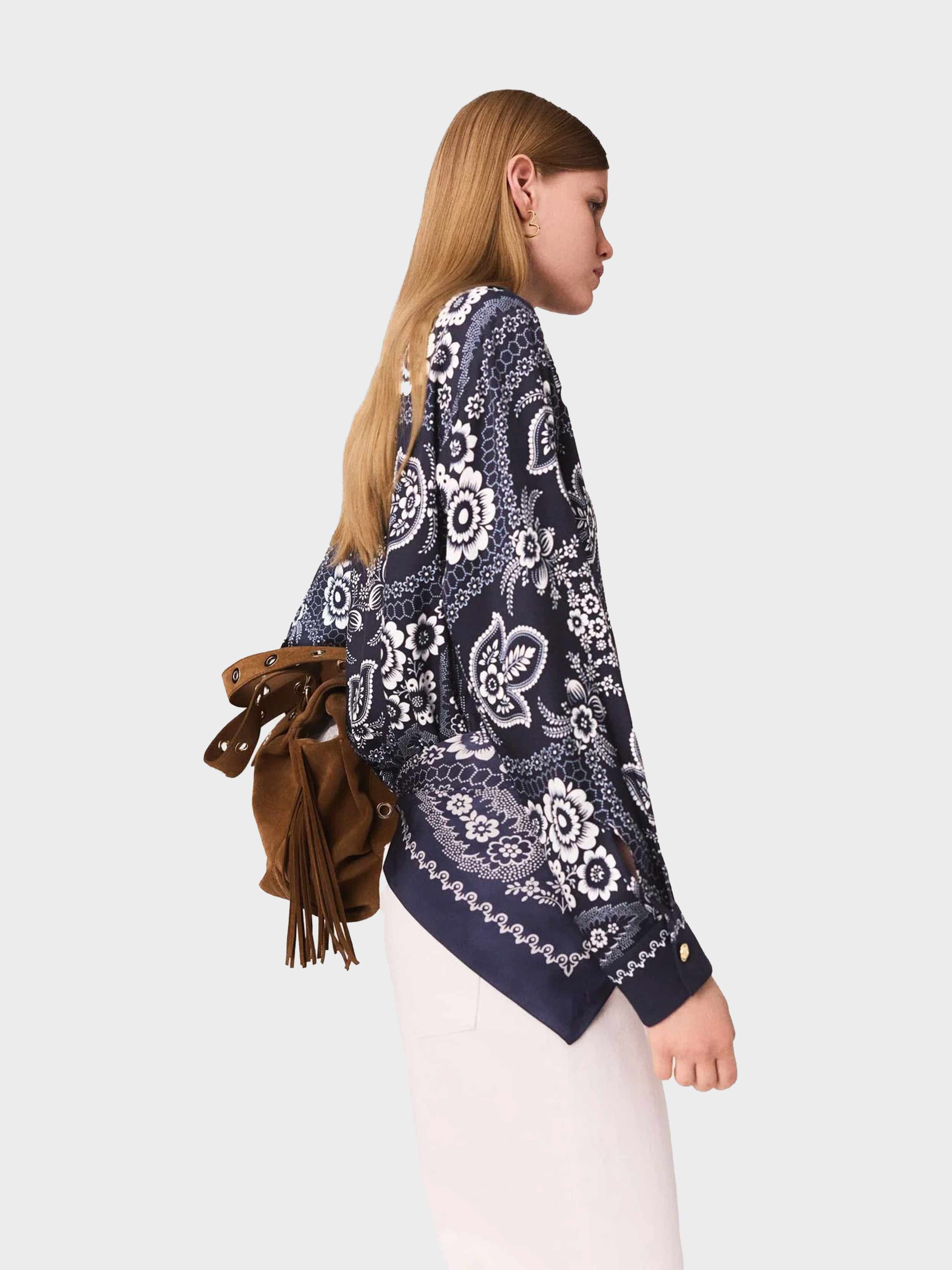 • This fluid, satin shirt adorned with a floral print inspired by the paisley pattern stands out as an elegant and timeless piece in the collection. Featuring a shirt collar with a decorative button and long sleeves with buttoned cuffs, it has a longer cut at the back and a button fastening with a covered placket.