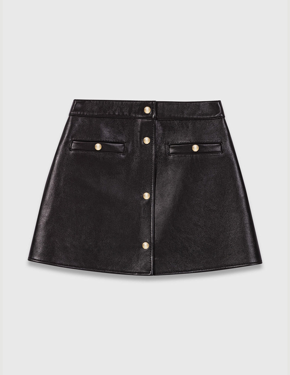 • A statement piece with retro-modern charm: this short leather skirt embodies the season's graphic boldness. With its straight lines and assertive minimalism, it reveals exquisite finishes: gold buttons. The look is structured, with supple leather that follows your every move.