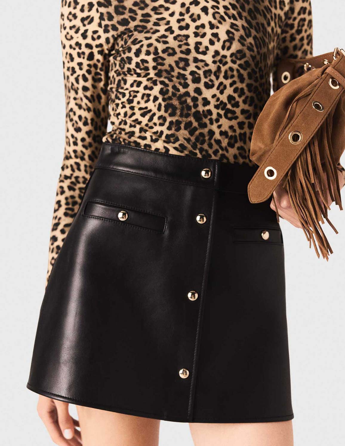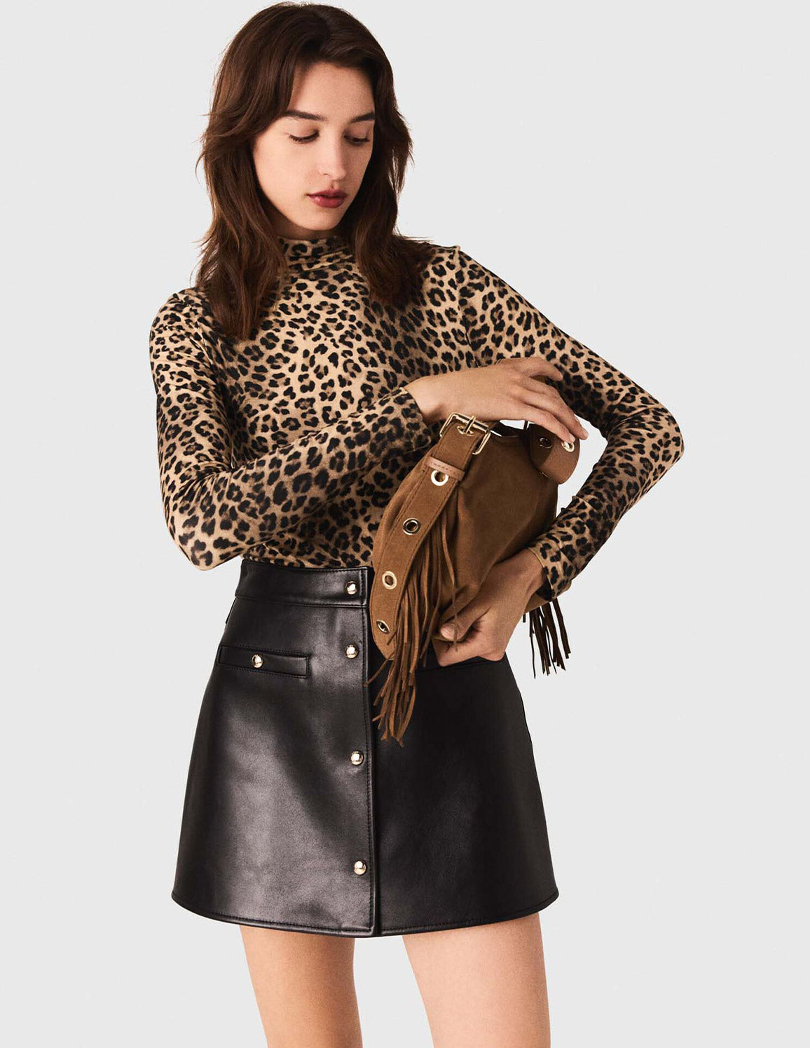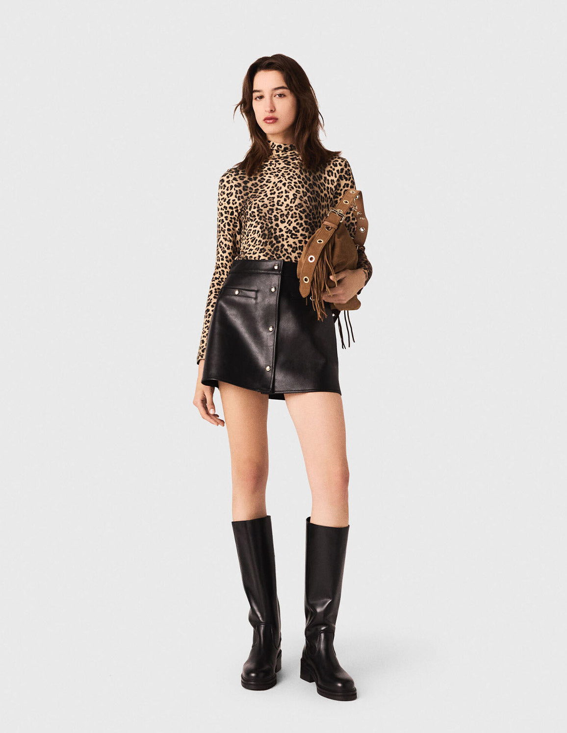 • Wear it with a leopard-print top to bring the whole look to life, along with high black boots with wide heels and a signature fringed bag.