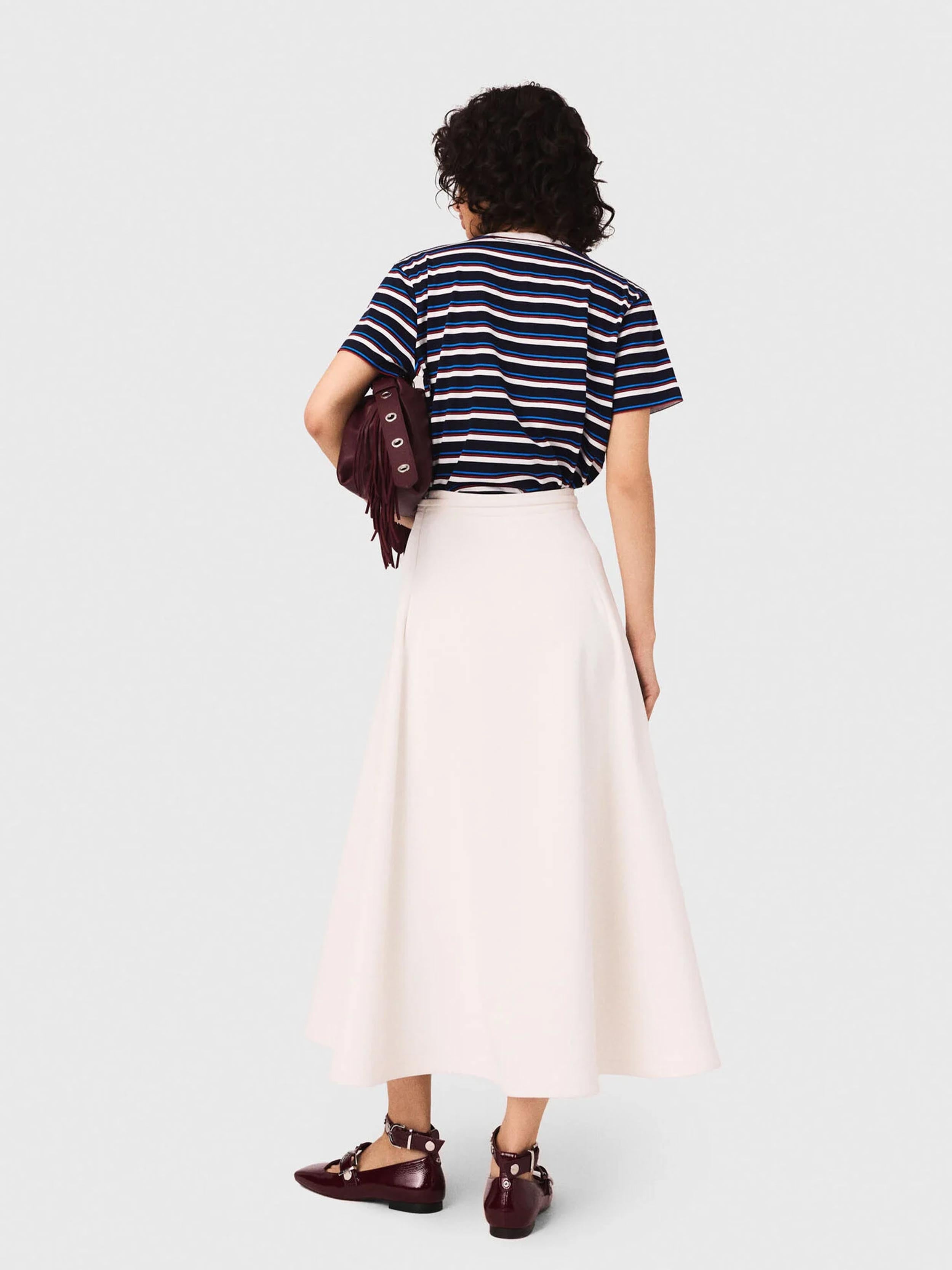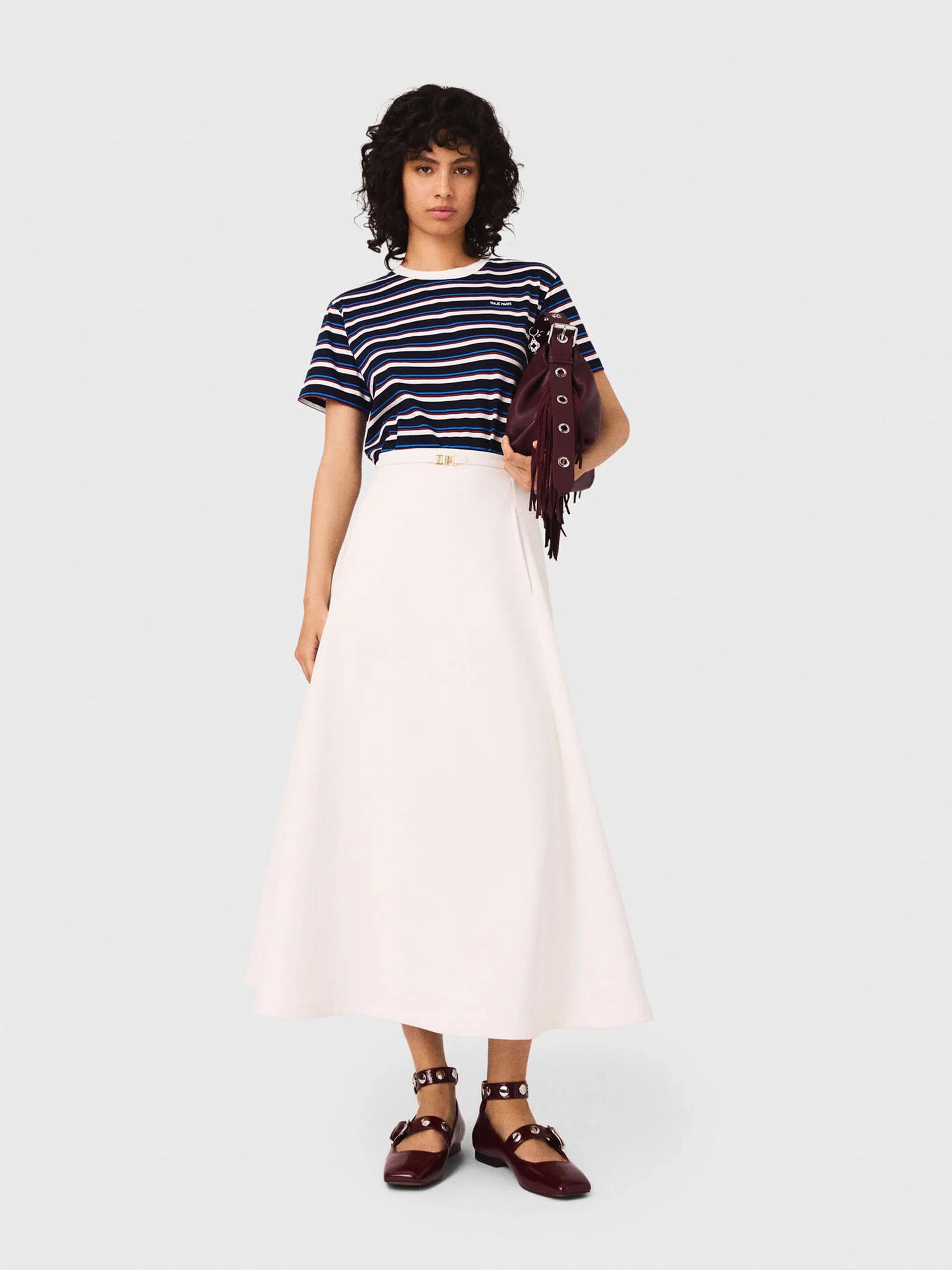 • This long skirt exudes lightness with its delicately flared cut that enhances the silhouette, and its removable Clover belt that precisely accentuates the waist.