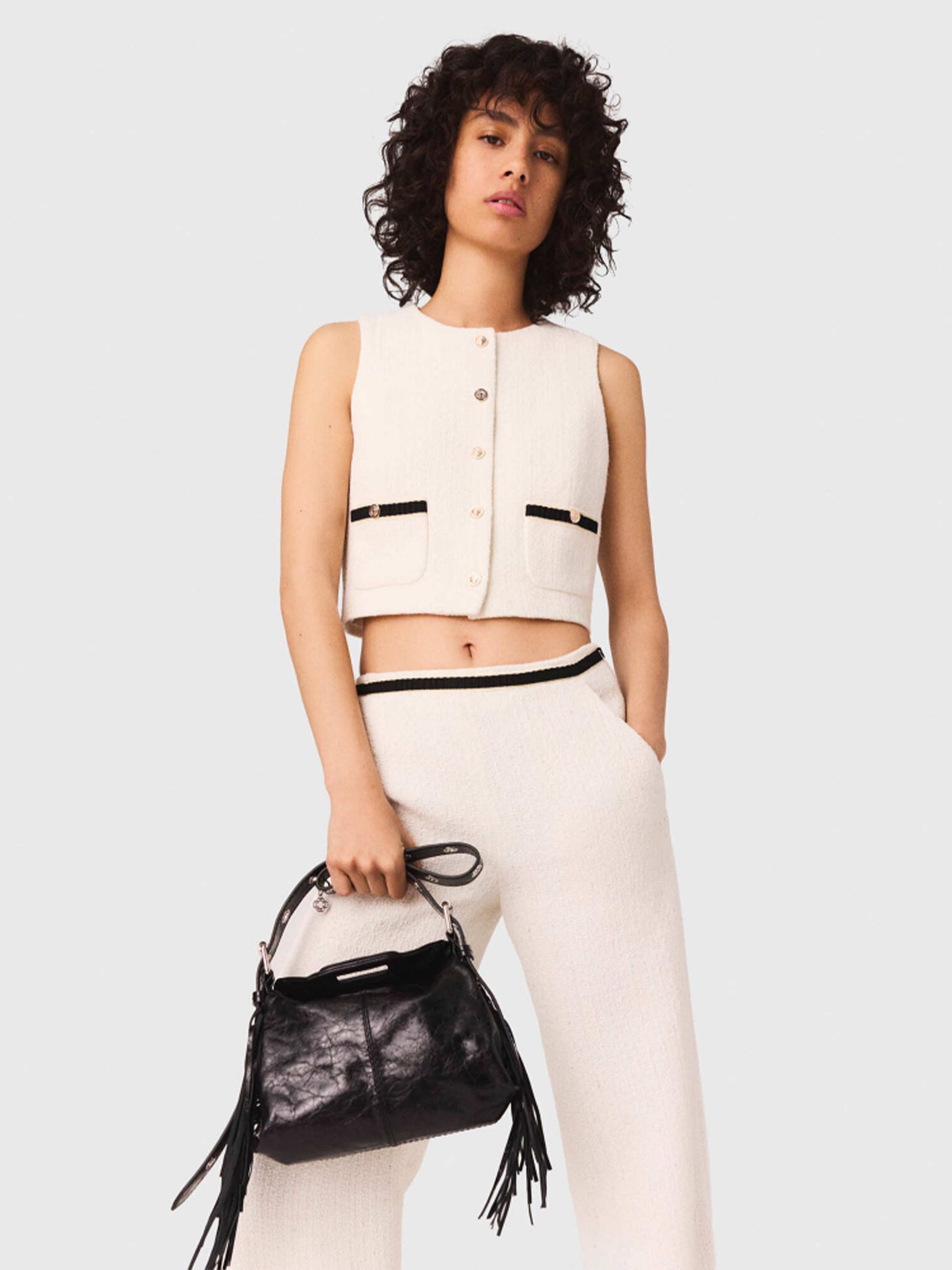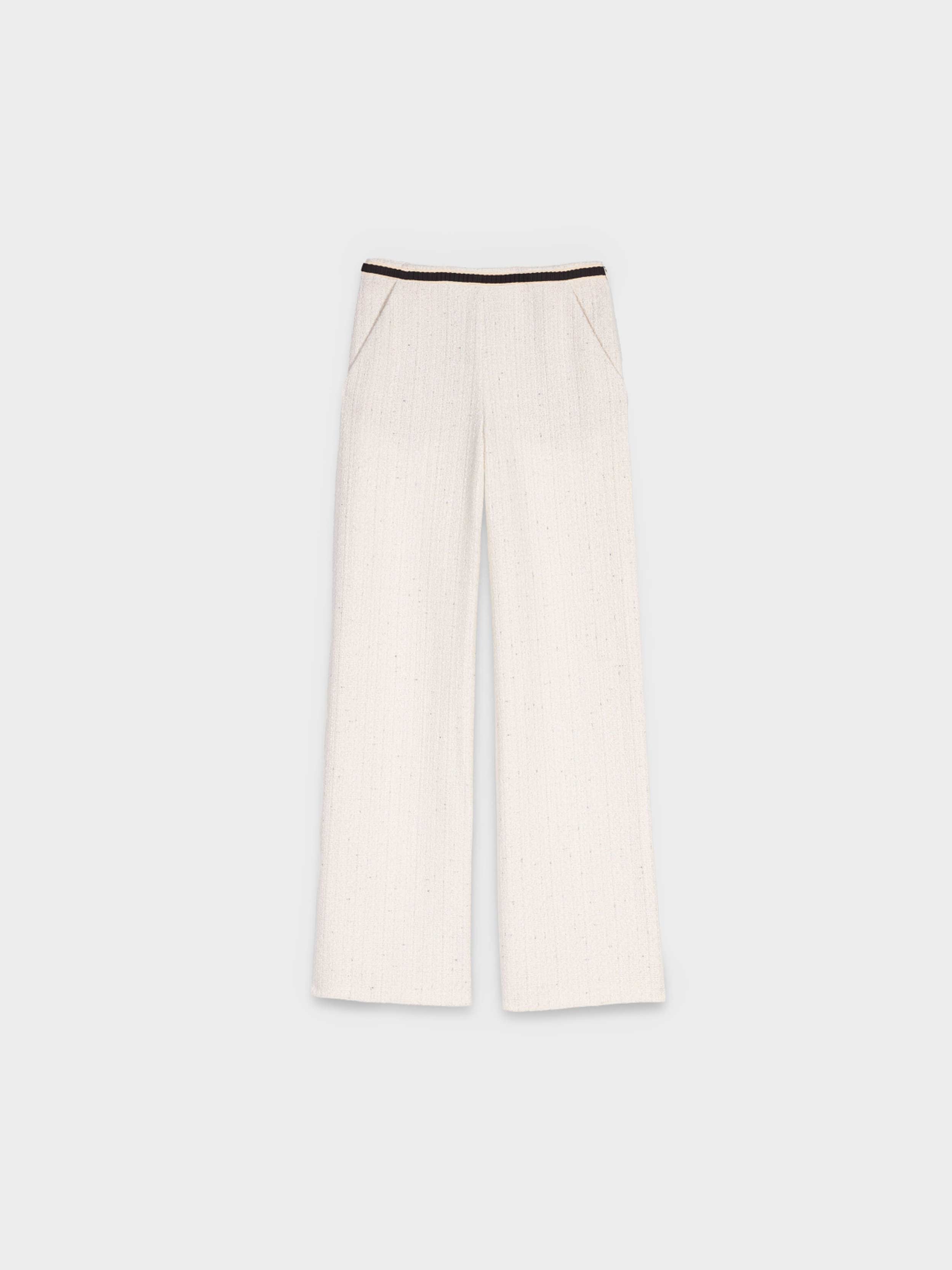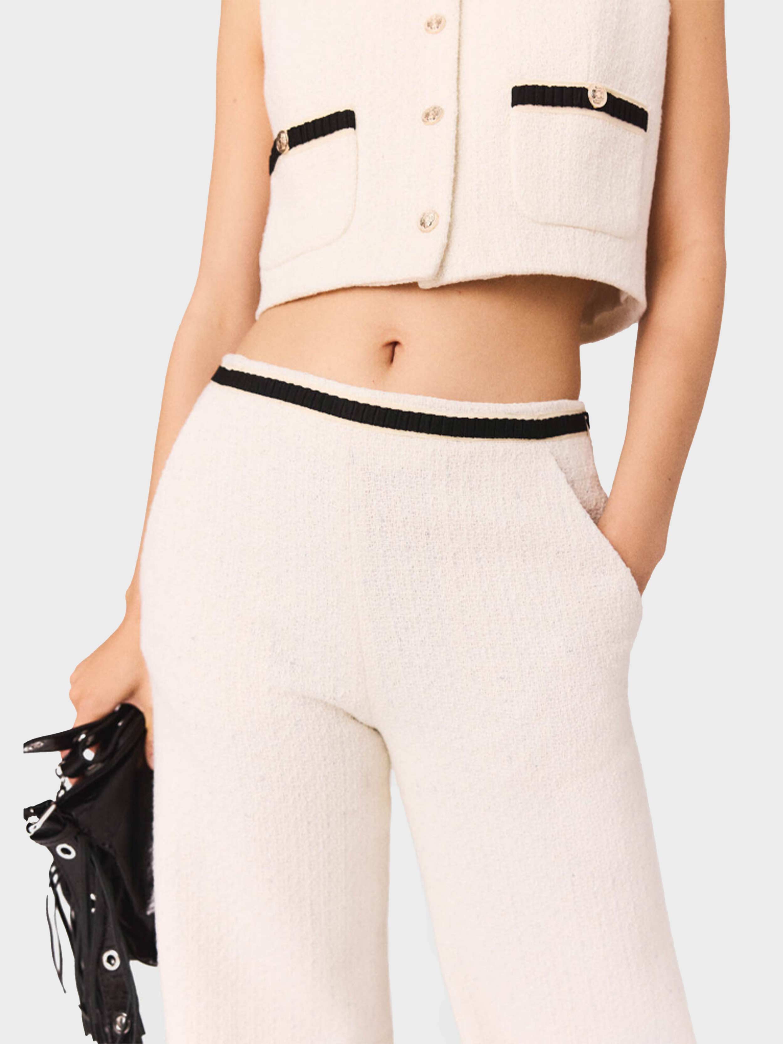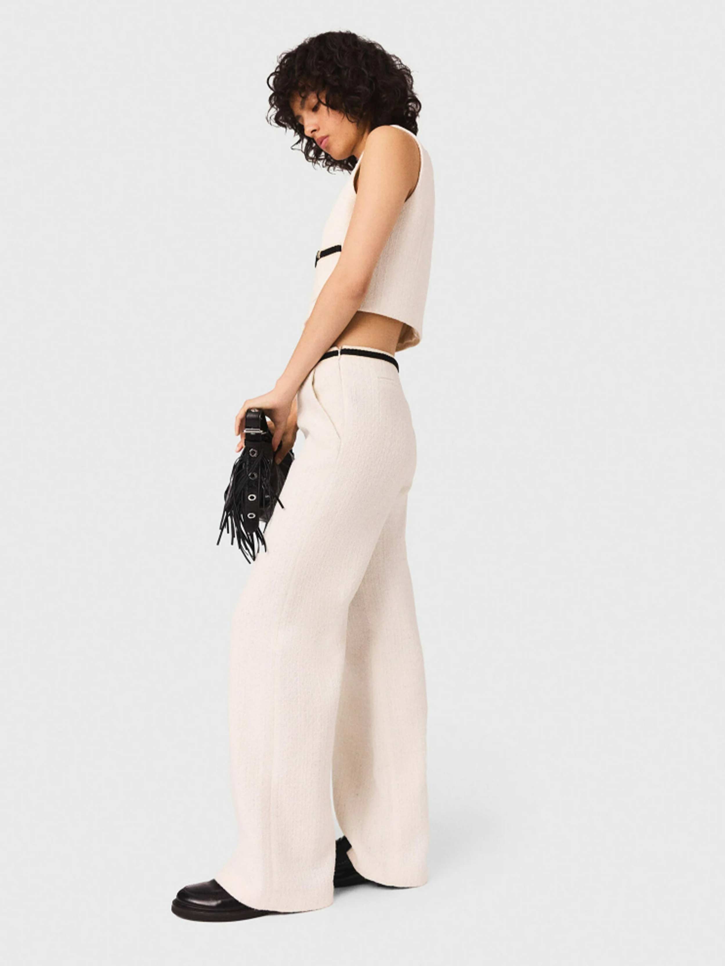 • Chic and stylish, these tweed-effect trousers are distinguished by their contrasting waistband. With a side zip fastening and two pockets, they have a straight cut. Wear them with the matching top to create an elegant ensemble, completed with a signature fringed bag and loafers for a look that's both modern and relaxed.