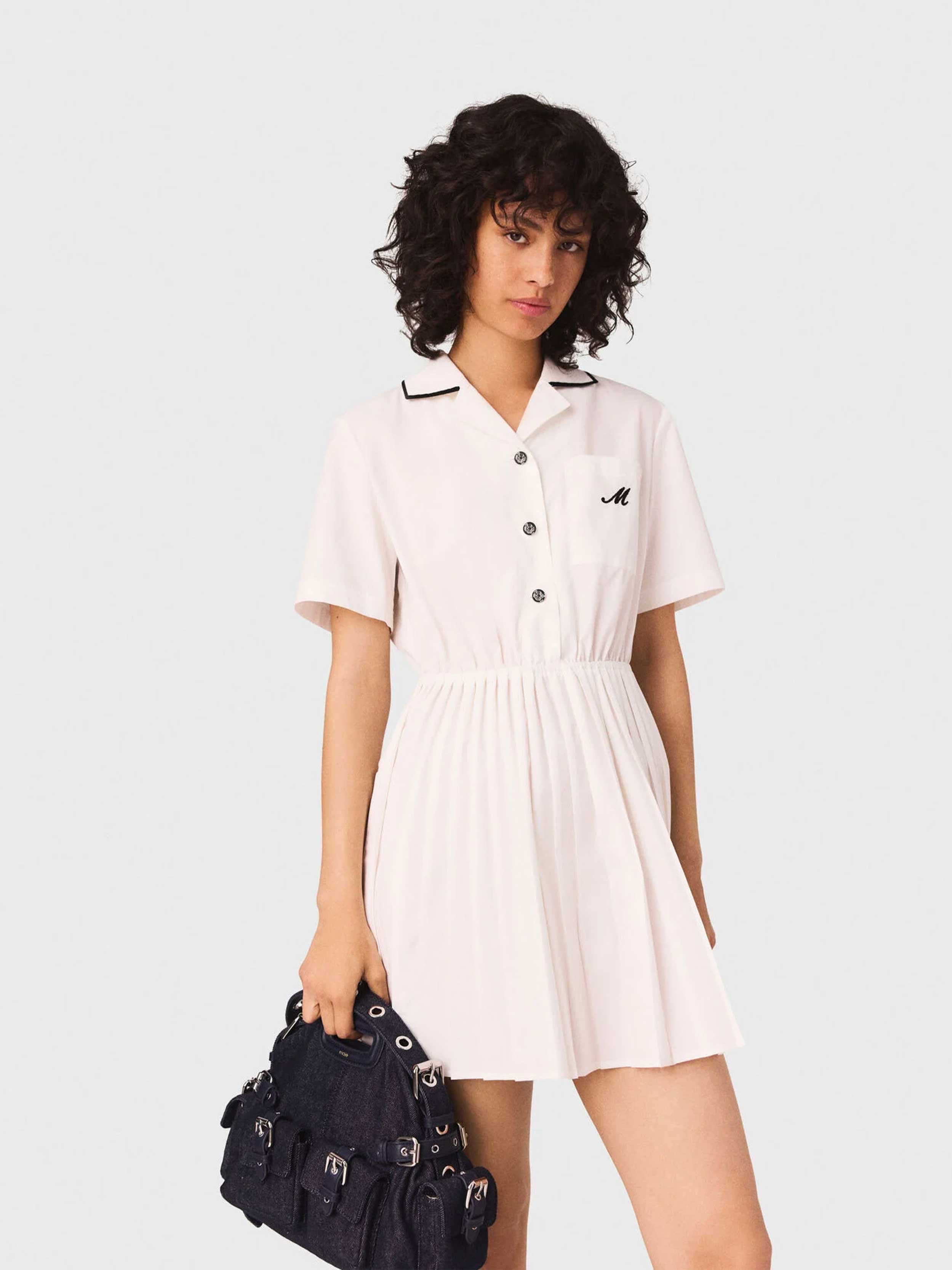 • This pleated poplin dress draws inspiration from the retro sports world and combines refined details. Featuring a knit collar with contrast trim and decorative buttons on the top, it reveals a flared pleated skirt at the bottom. The signature detail is a patch pocket with an embroidered M on the chest. A favourite piece, to be styled with leather shoes with chunky soles, high socks, and a signature bag.
