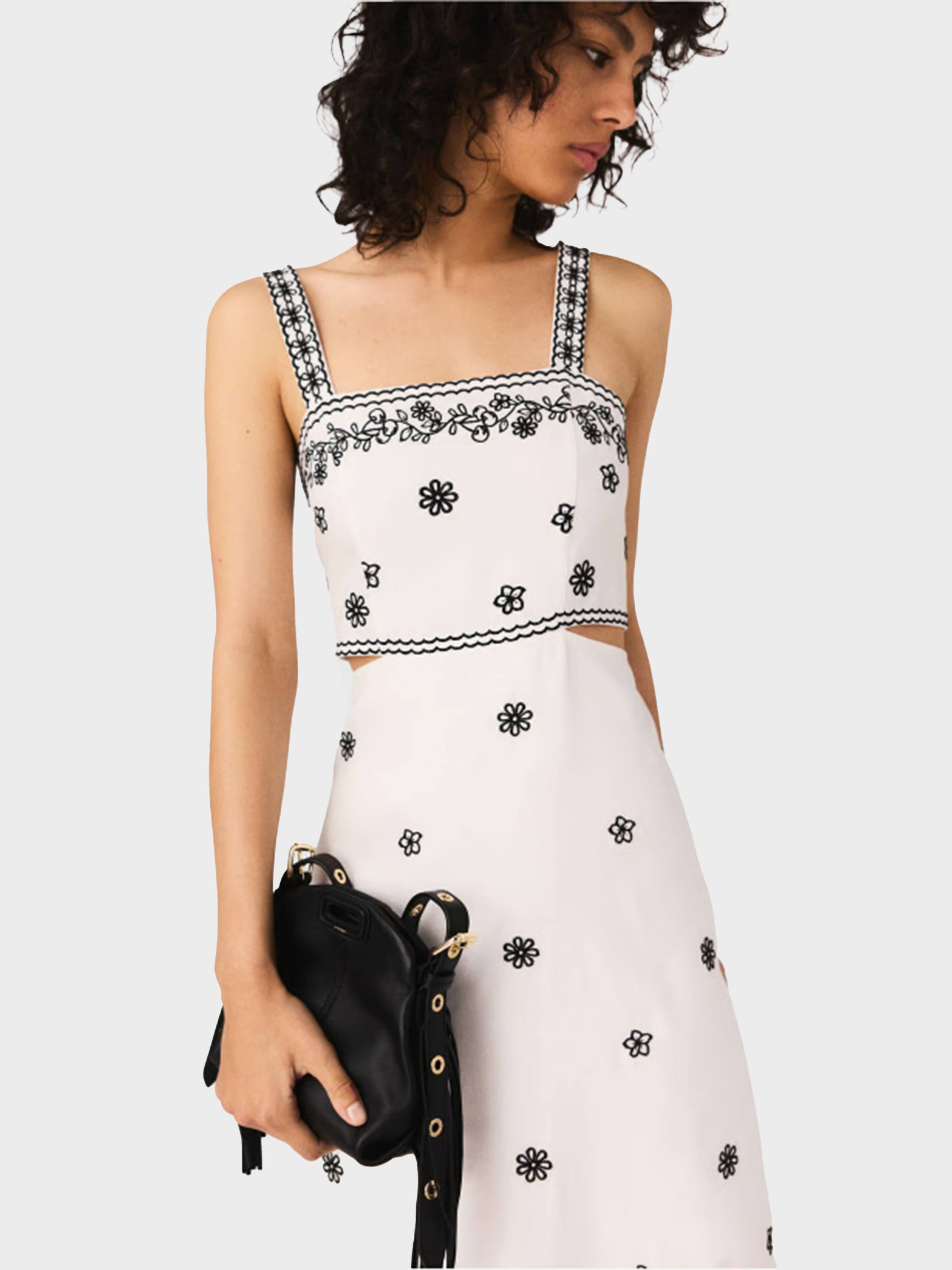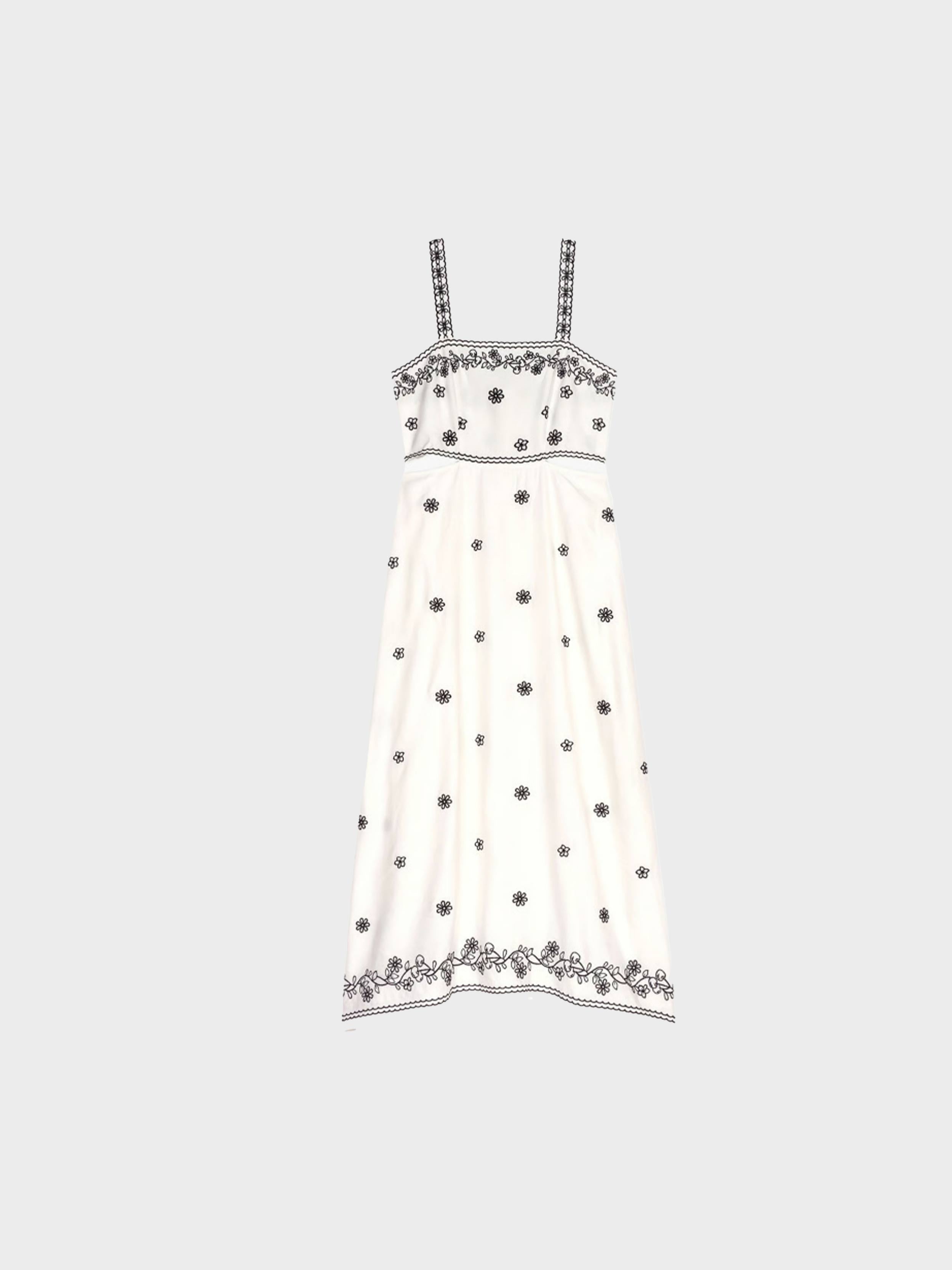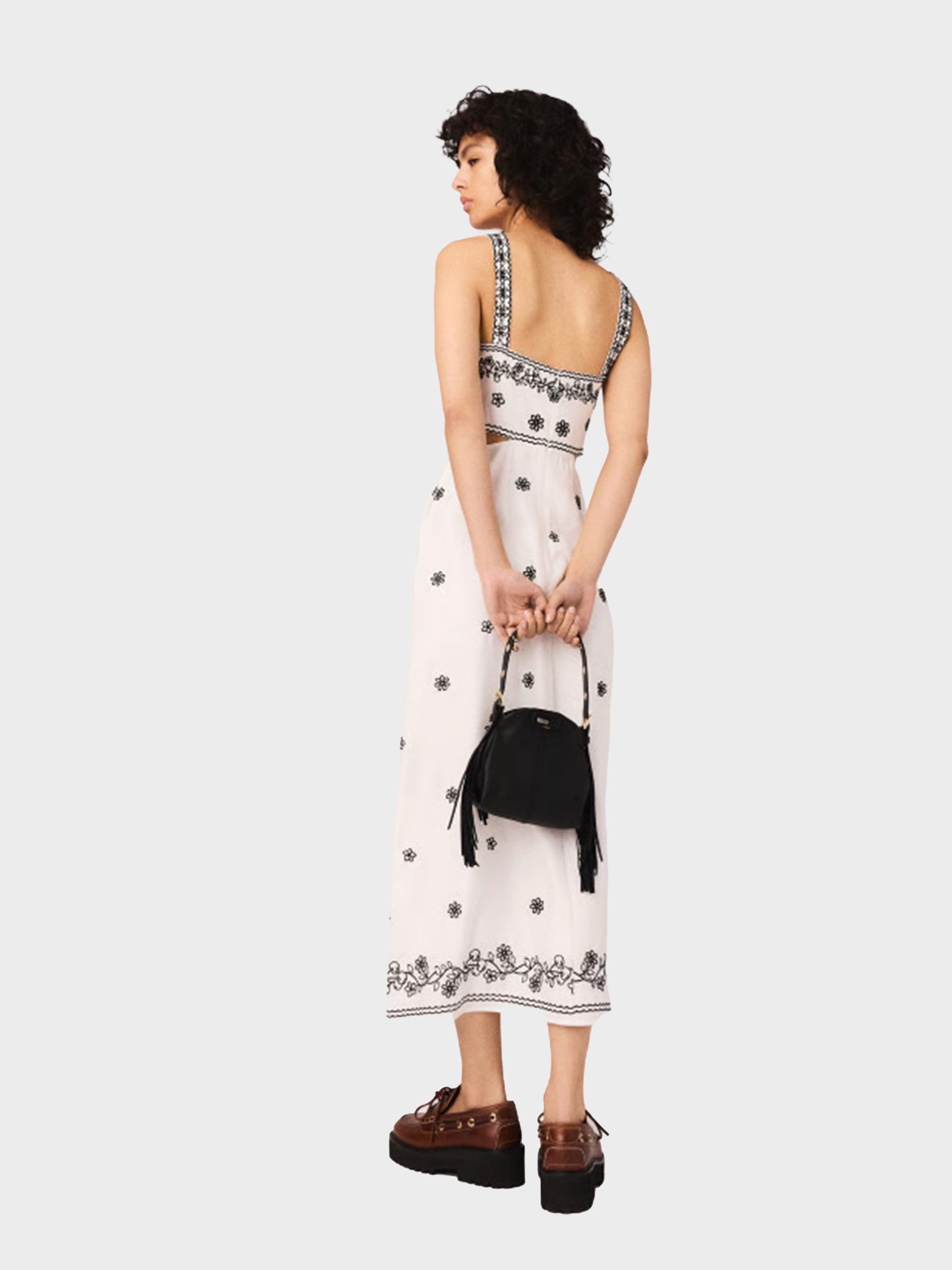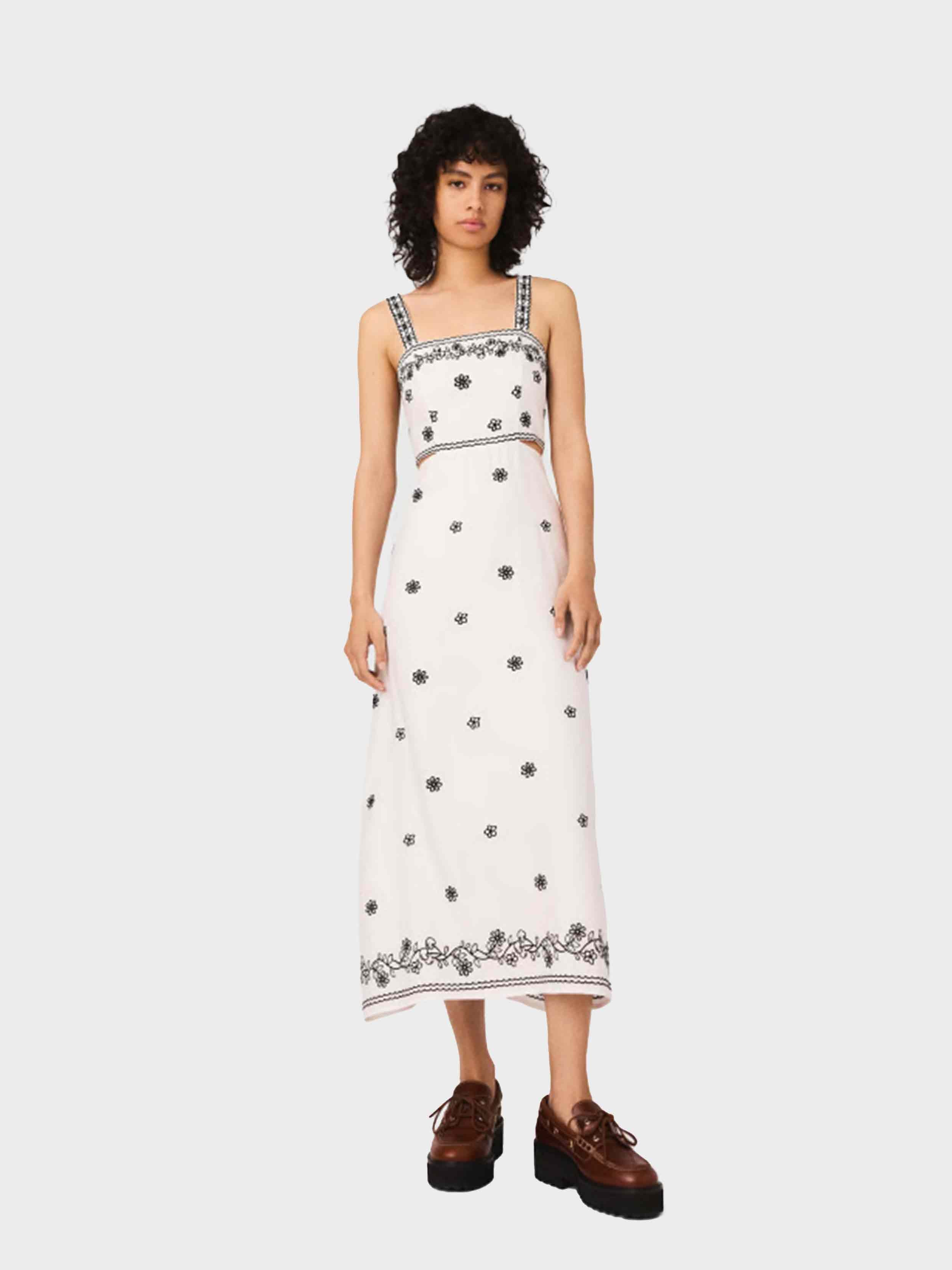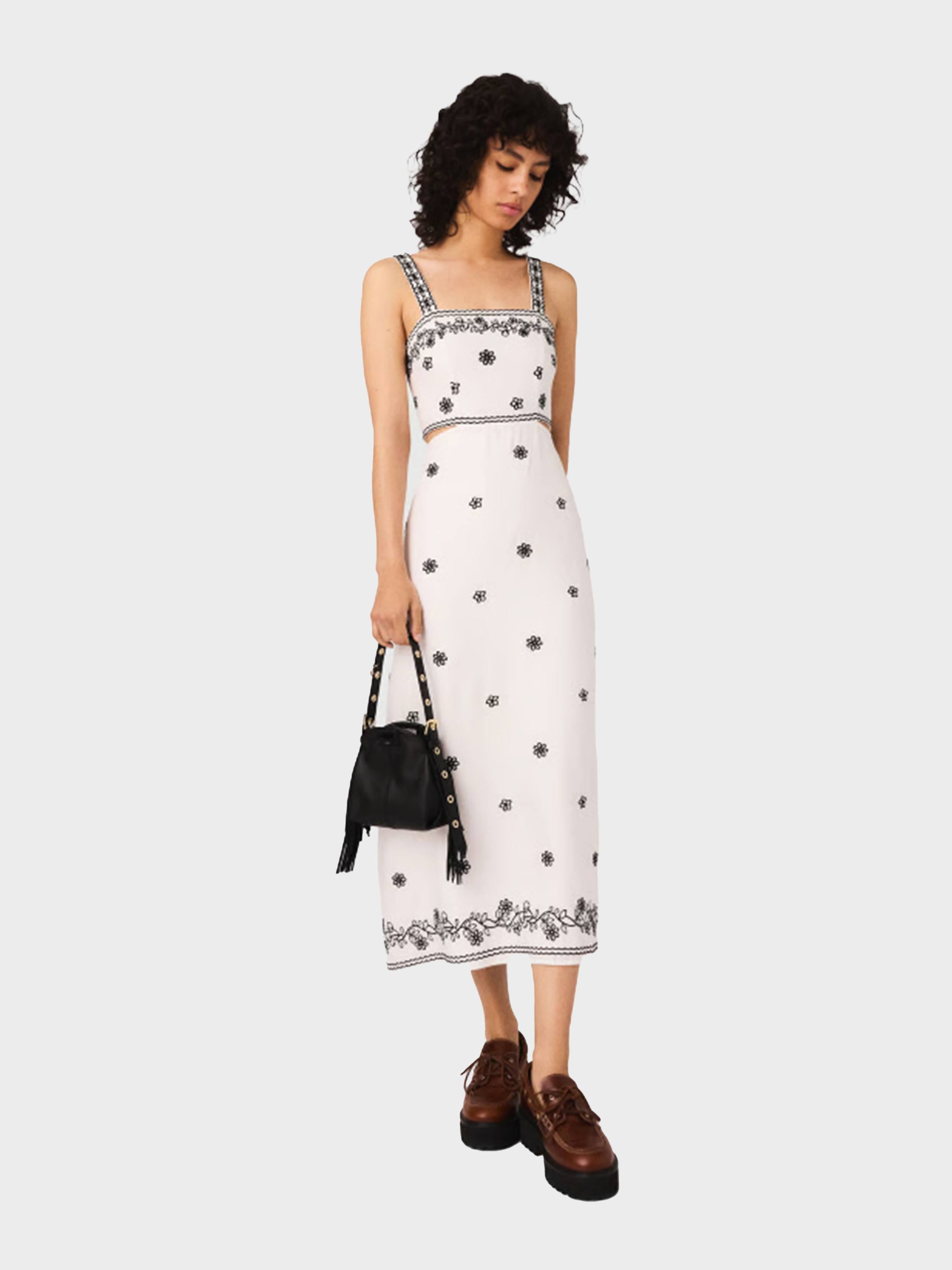 • This long linen dress features hand-assembled contrasting embroidered panels and cut-out sections on the sides. Its straight neckline with thin straps balances a fluid, slightly flared and lined skirt for added comfort. A summer piece to include in your wardrobe.