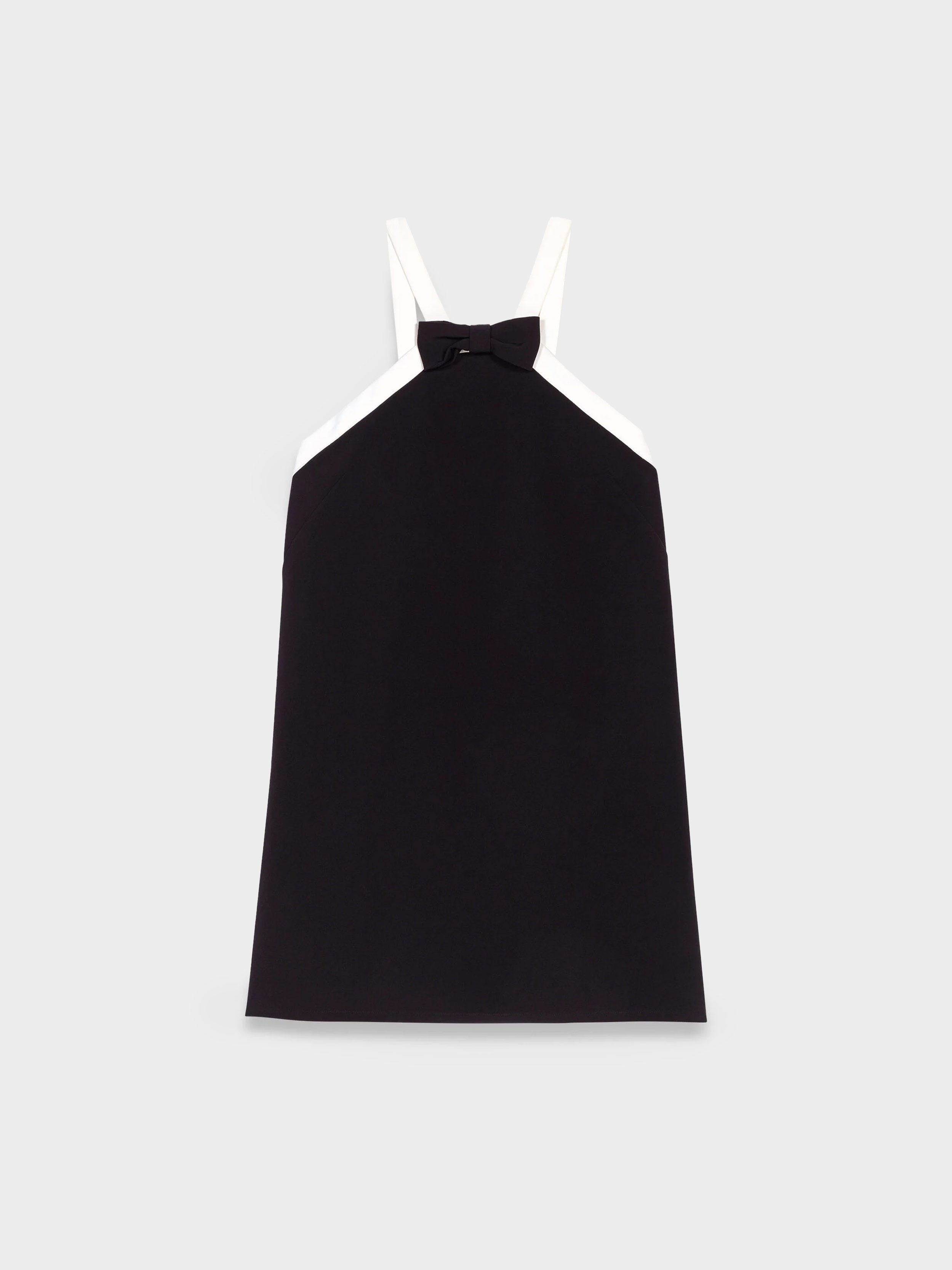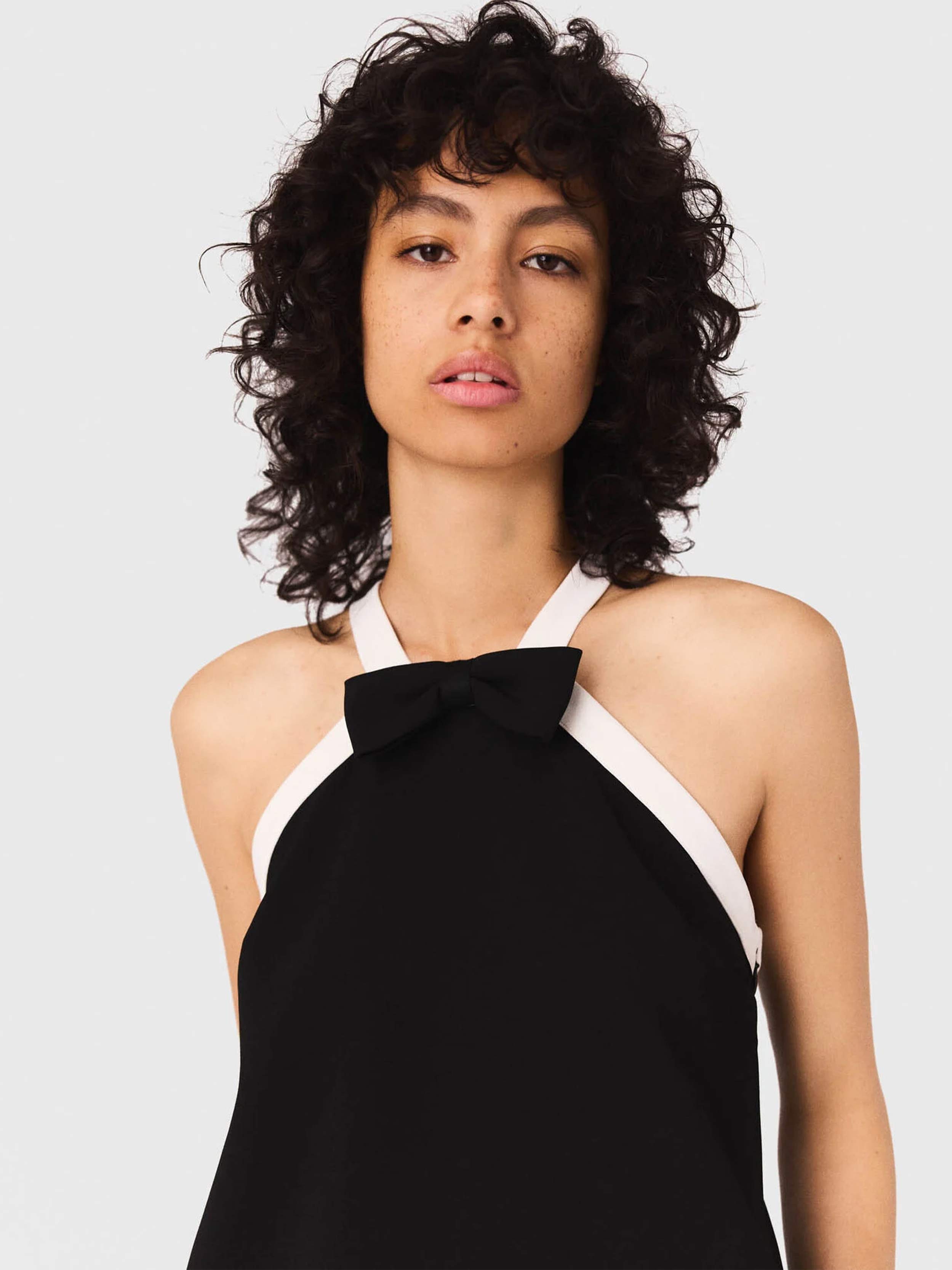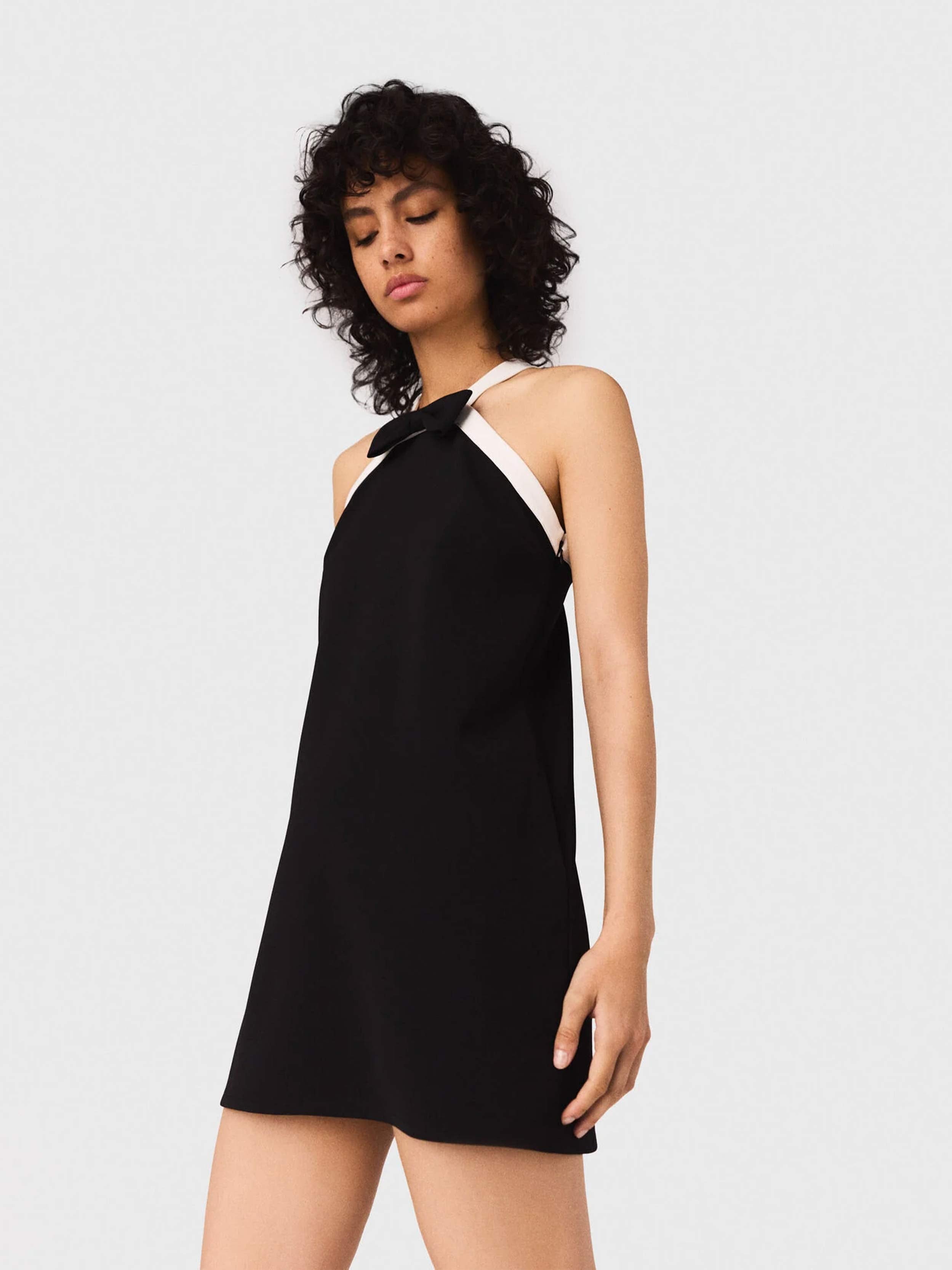 • With its placed bow tie and contrast straps that can be adjusted to your liking, straight or crossed, this short dress elegantly plays with graphic twists.