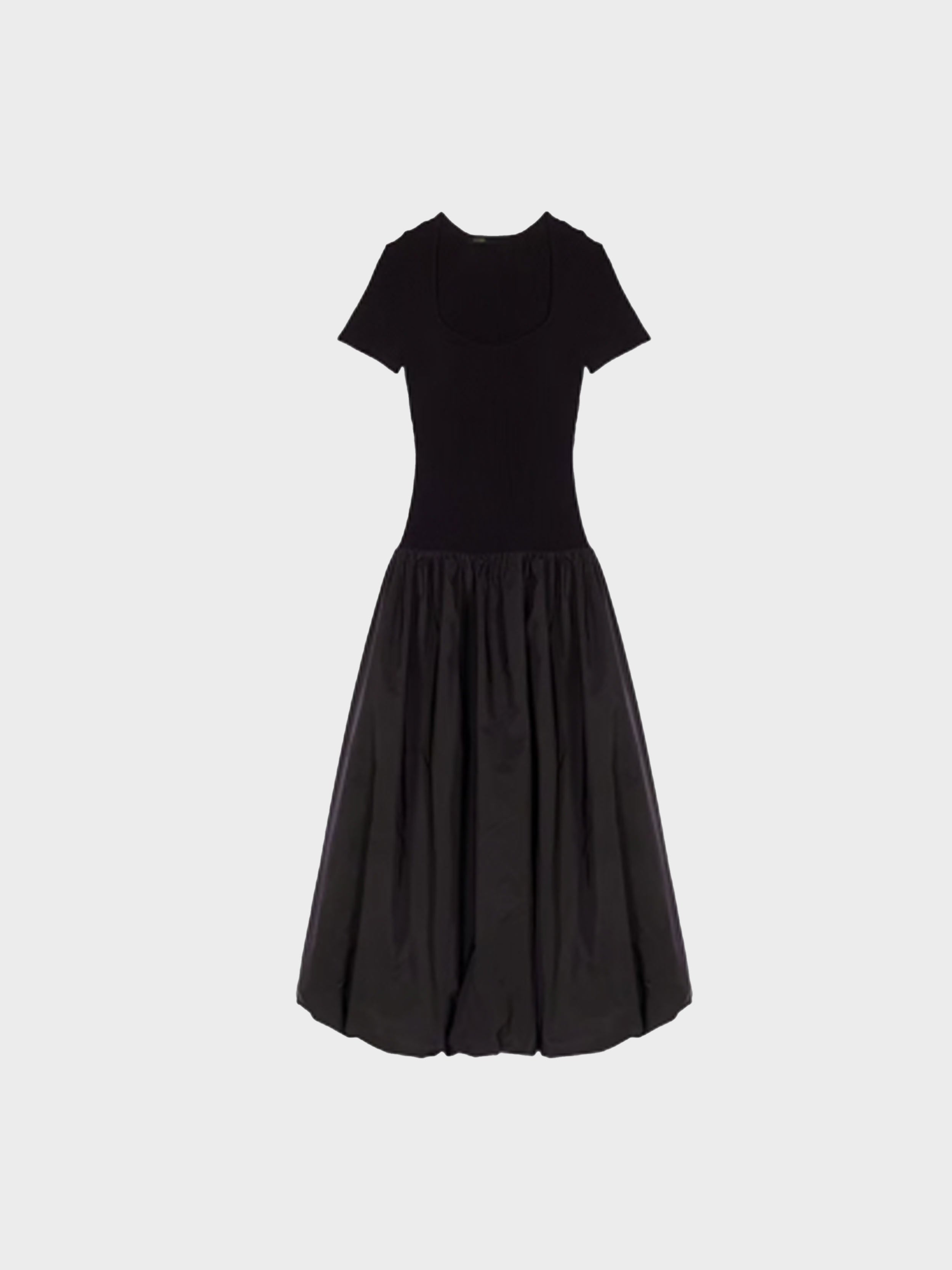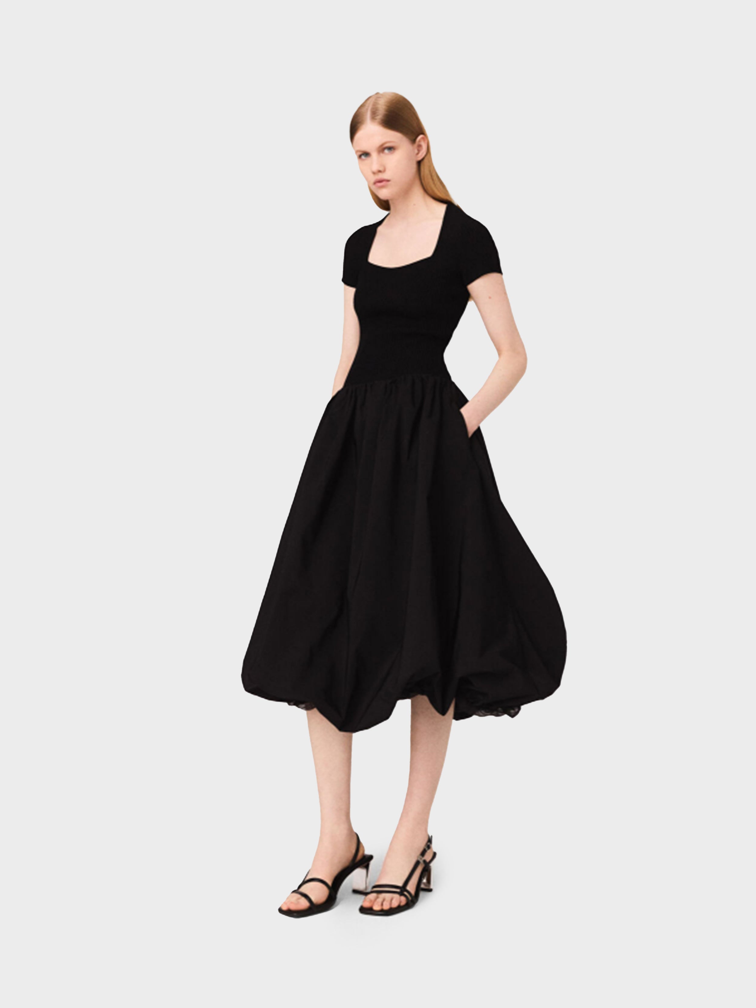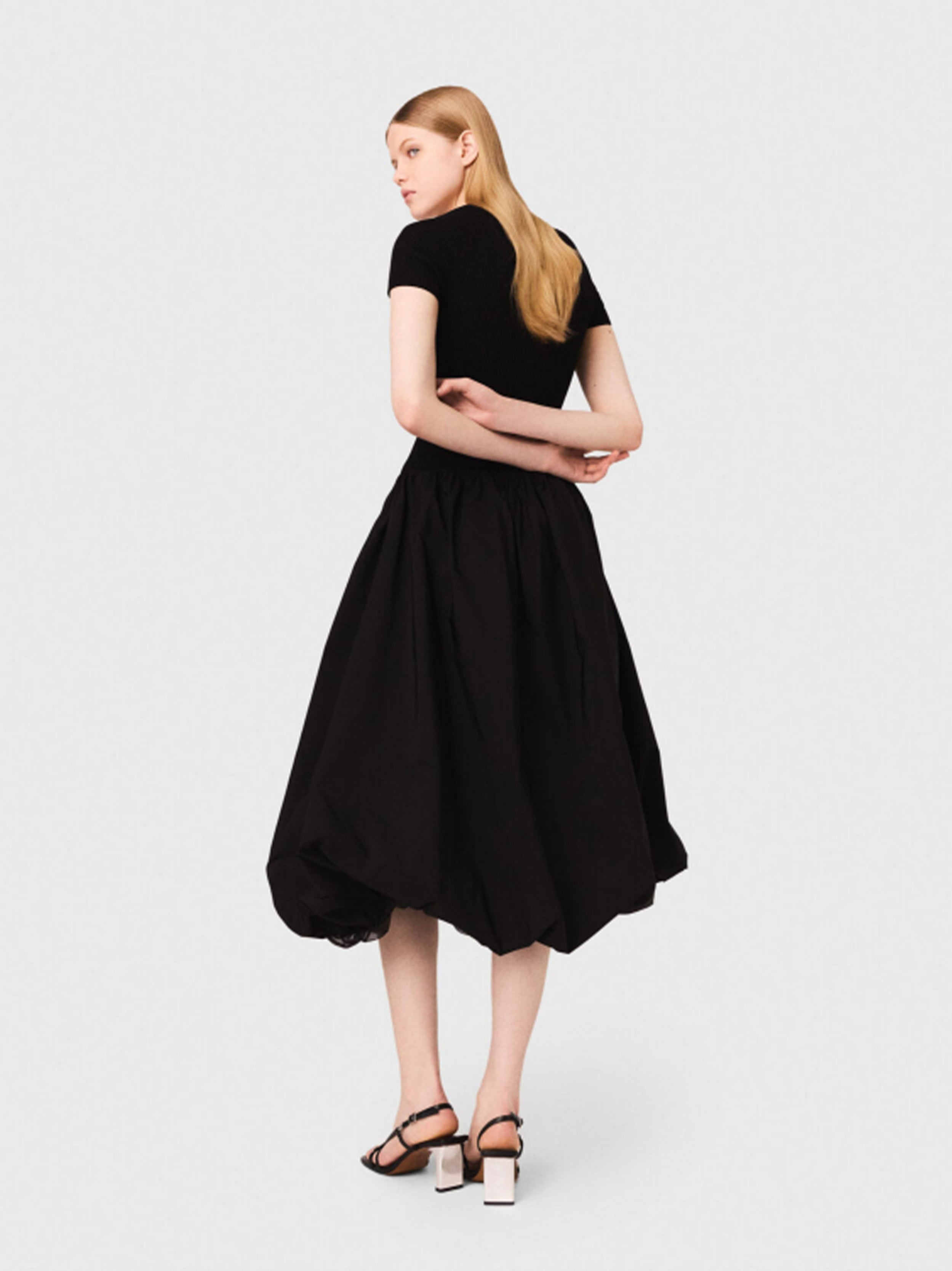 • This season, Maje plays with materials and volumes to offer modern and elegant pieces, perfect for the new term.This long dual-material dress combines the comfort of ribbed knit with the lightness and volume of taffeta. The top with a round neckline and short sleeves ensures a clean silhouette, while the voluminous taffeta skirt with a bubble effect creates a lovely contrast.Ideal for a special event, it draws all the attention with its unique cut. To complete the look, add mirror-heeled sandals and a signature bag for an outfit that is both elegant and bold.