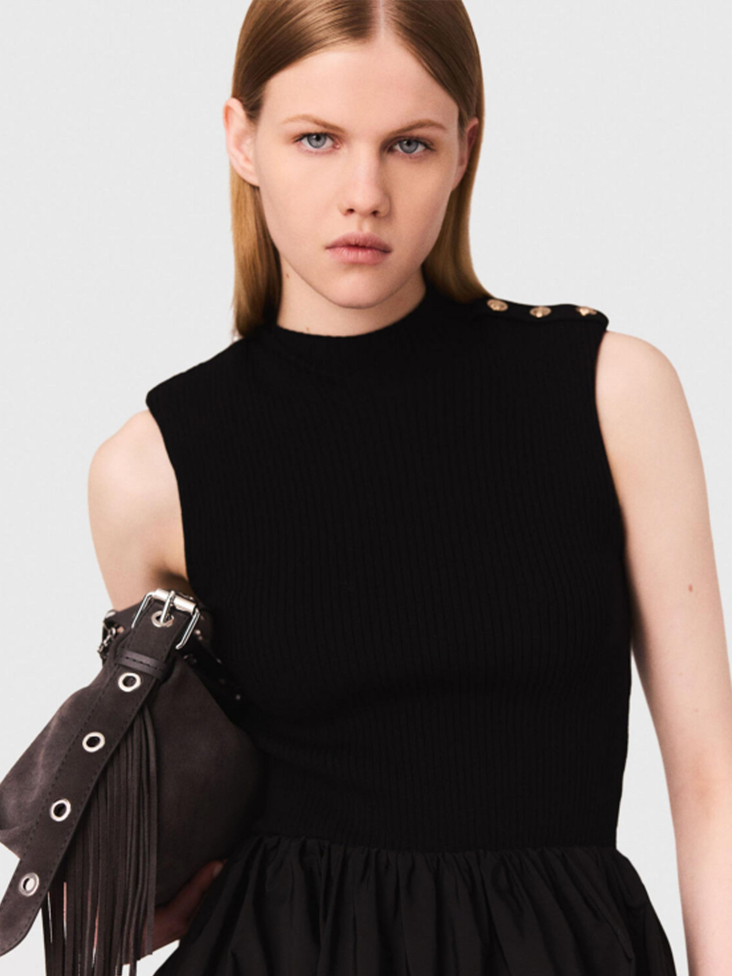 • This short dual-material dress combines the softness and comfort of ribbed knit with the elegance and volume of taffeta. The top with a buttoned shoulder tab adds a touch of sophistication, while the voluminous skirt creates a modern and original bubble effect.