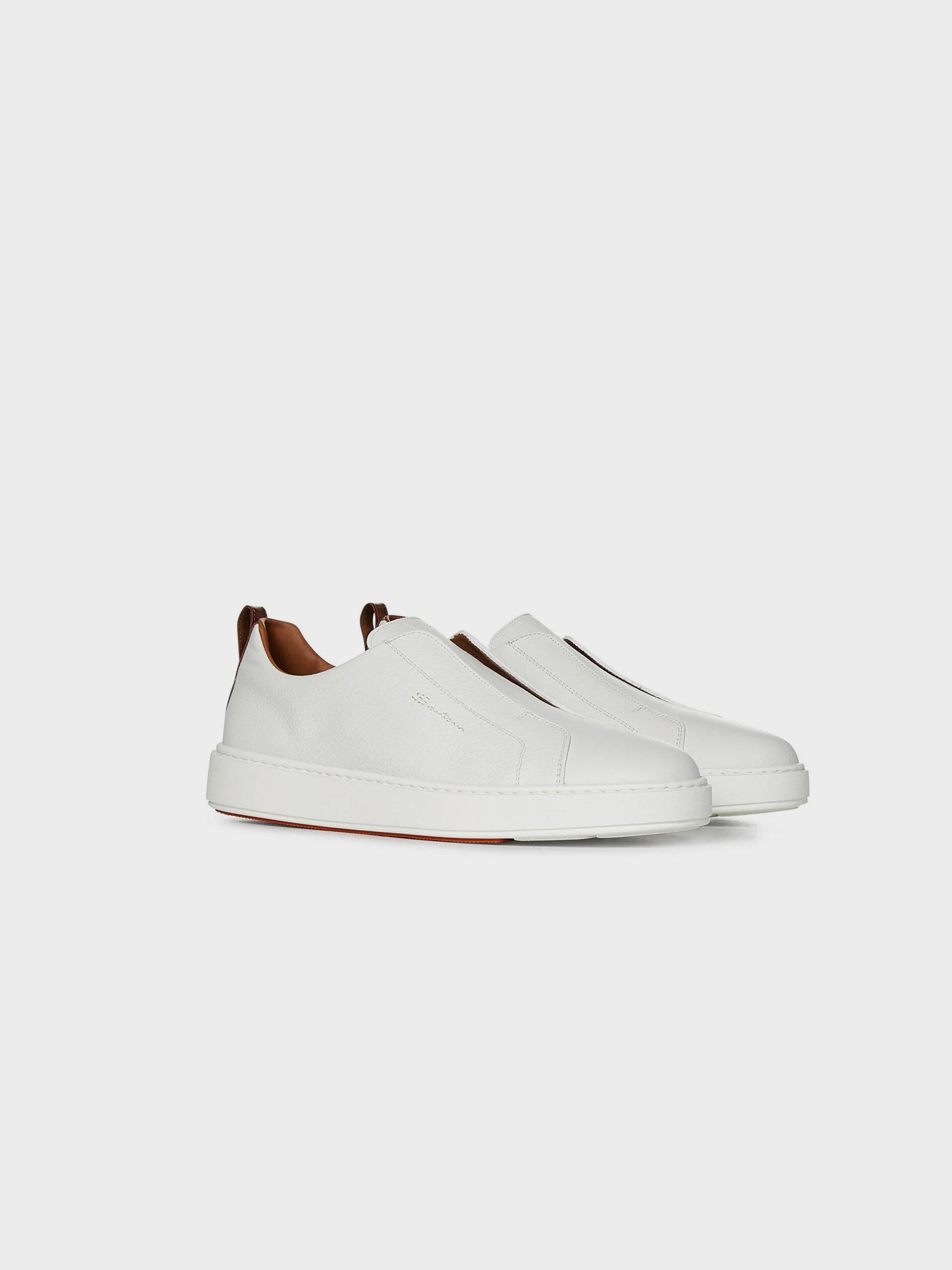 • From the exclusive Santoni sneaker universe, this men's slip-on model represents the perfect blend of sporty elegance and quality craftsmanship. Crafted from tumbled leather, it features a loop and a shaded leather heel detail, demonstrating the brand's tradition of color treatment. The flexible rubber box sole ensures comfort and freedom of movement all day long.
