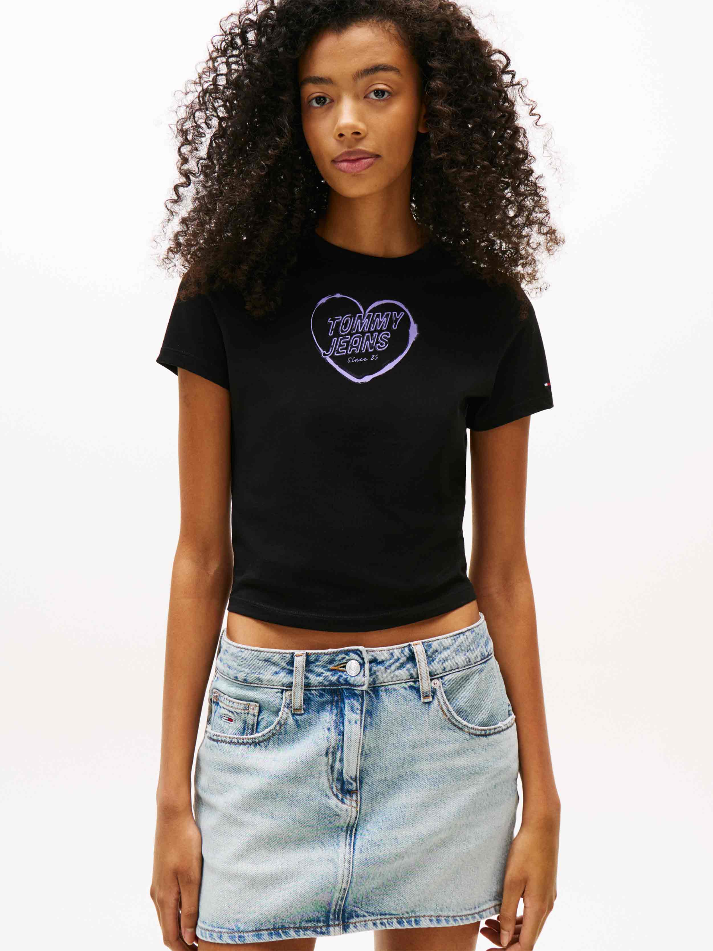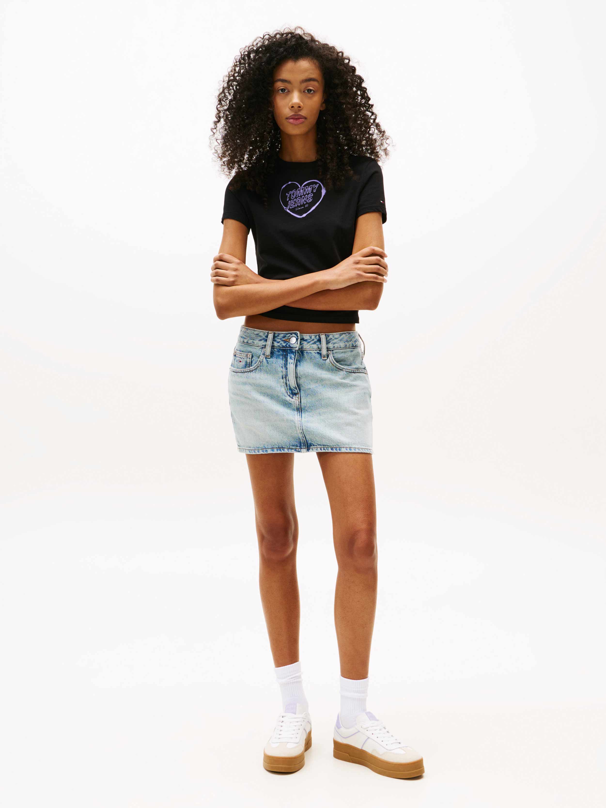 • Add a pop of colour with the Tommy Jeans Slim Heart T-shirt, a slim-fit shirt perfect for casual days. This woman's top blends cool graphic style with classic comfort.