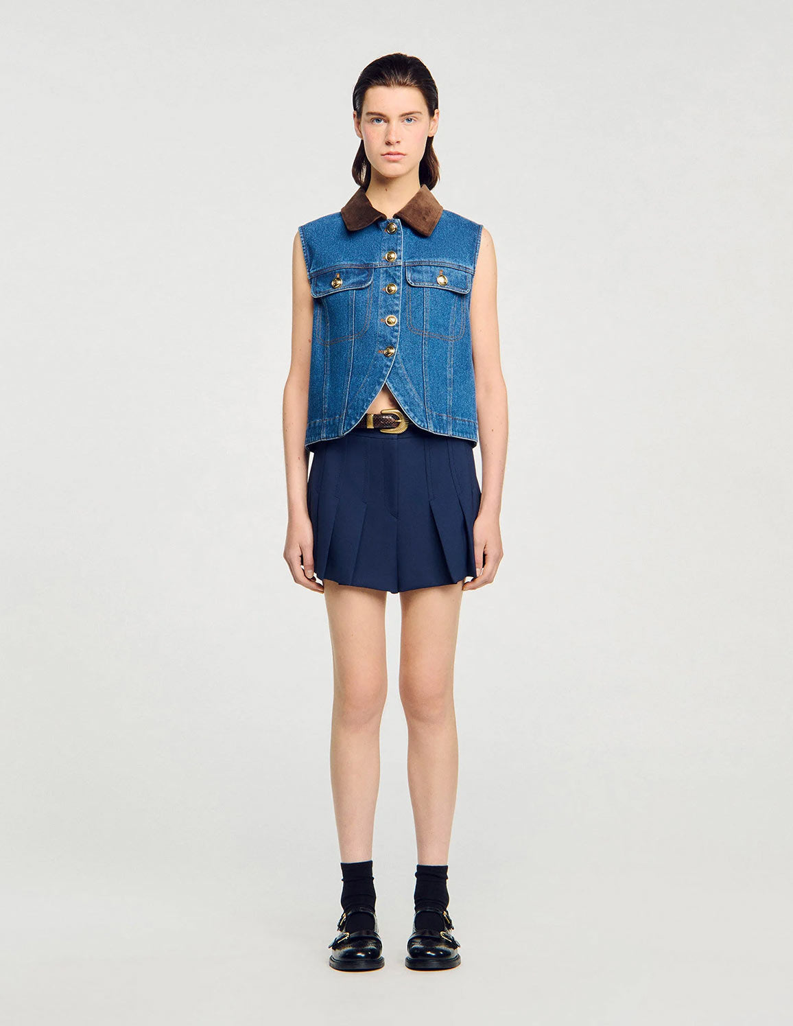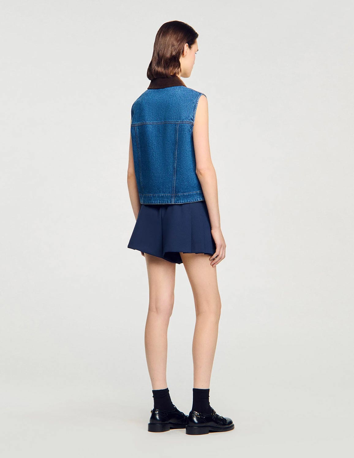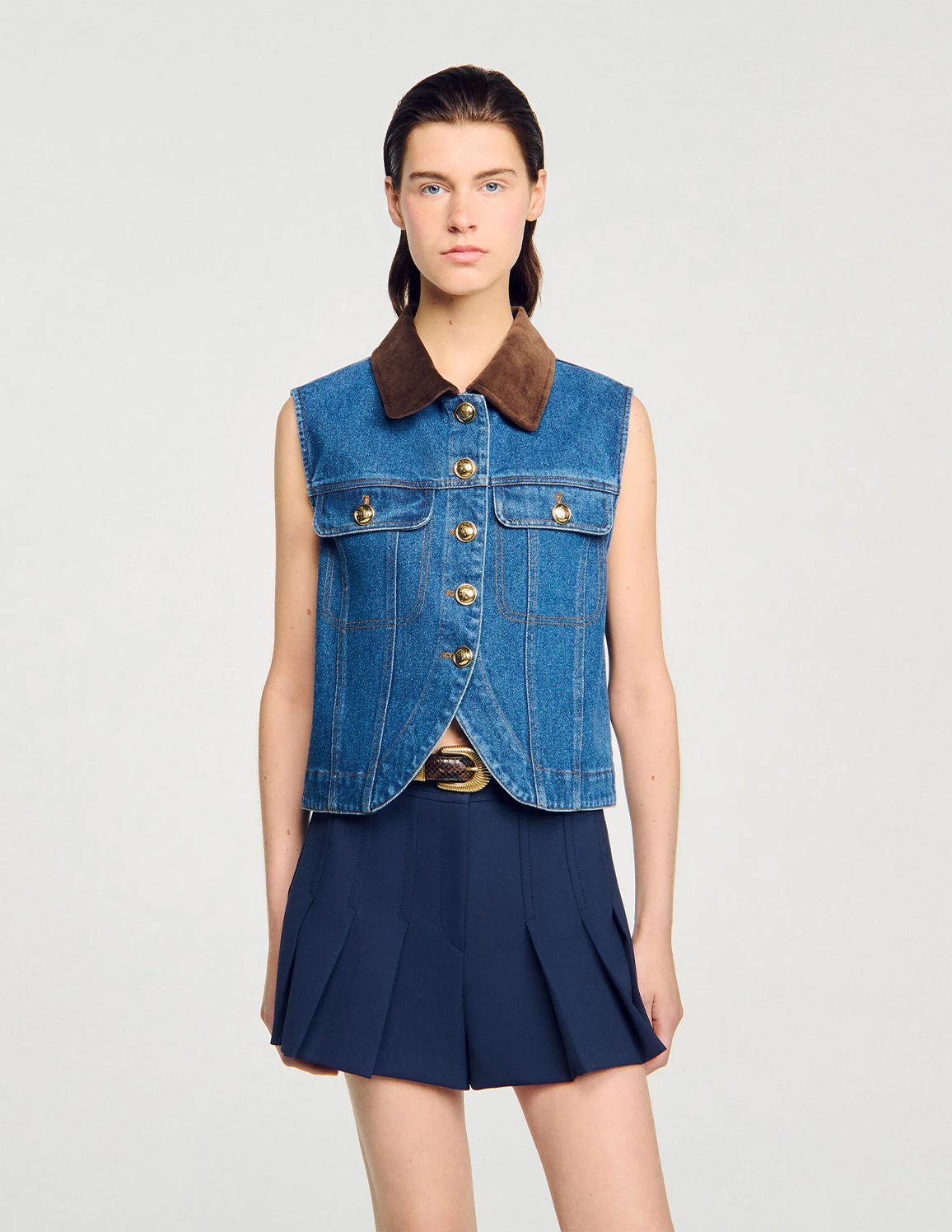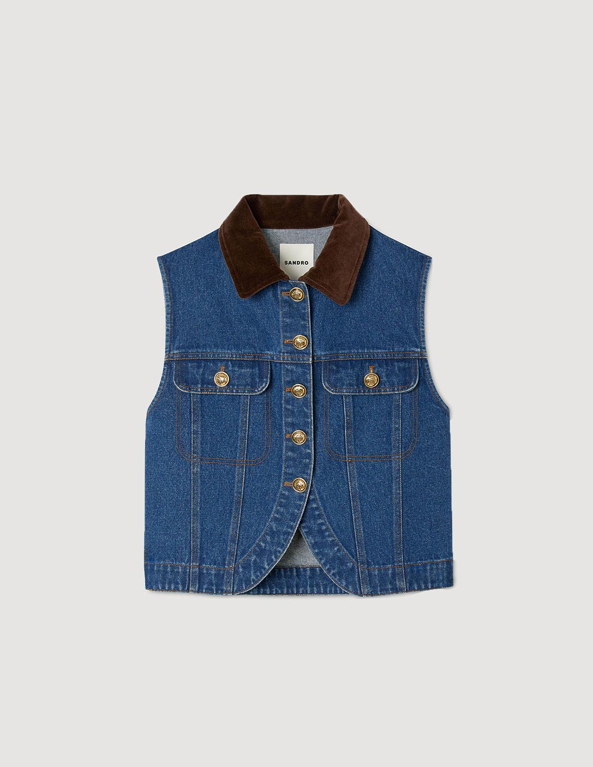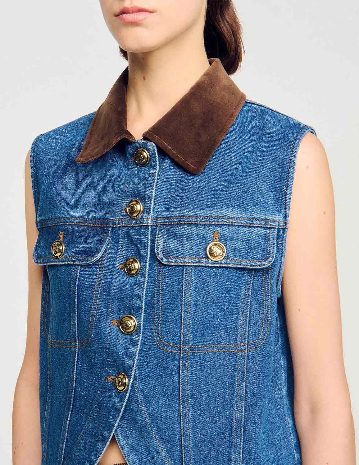 • Faded denim jacket with a worn effect on the hem, sleeveless, with a contrasting velvet shirt collar and topstitched flap pockets with buttons.