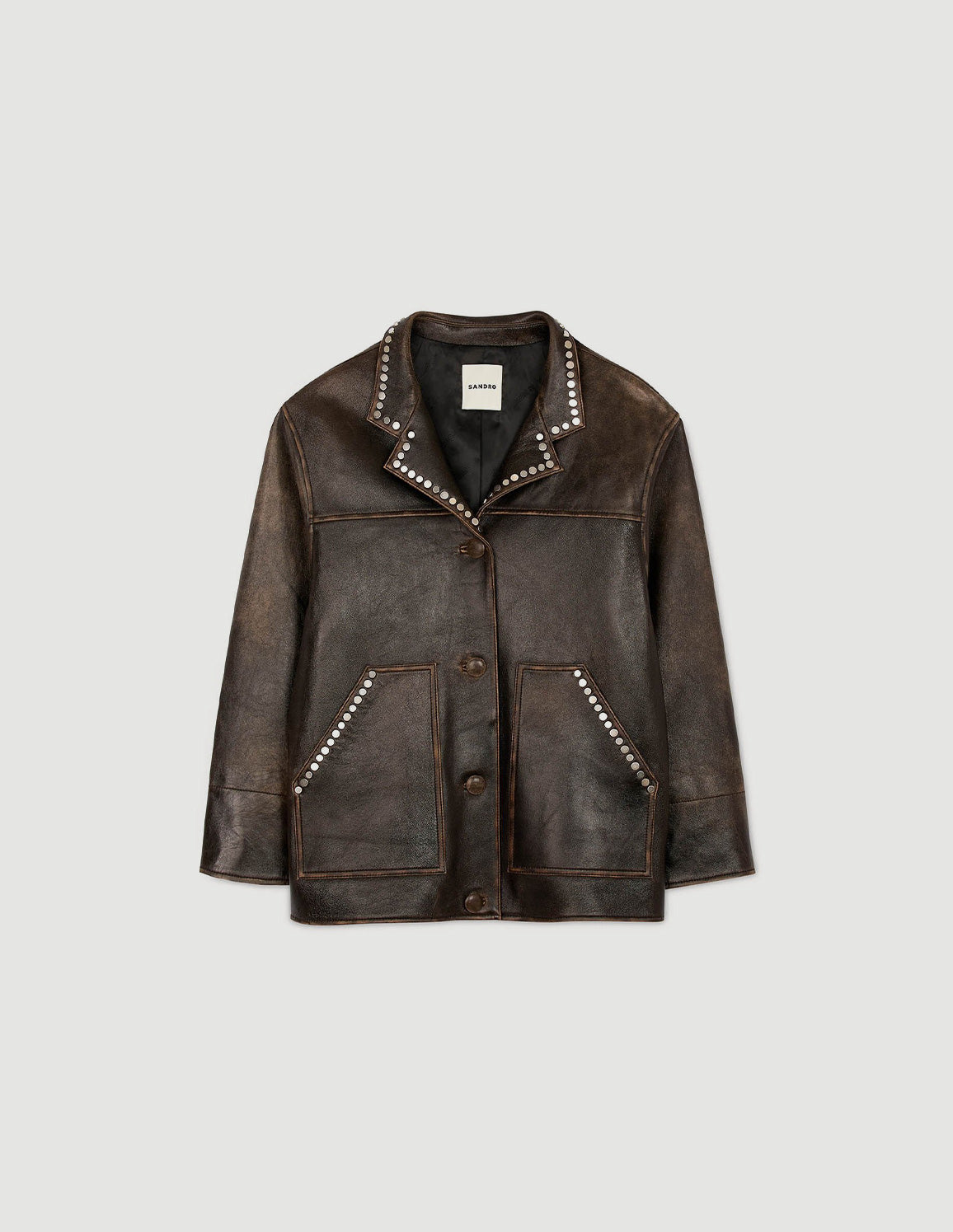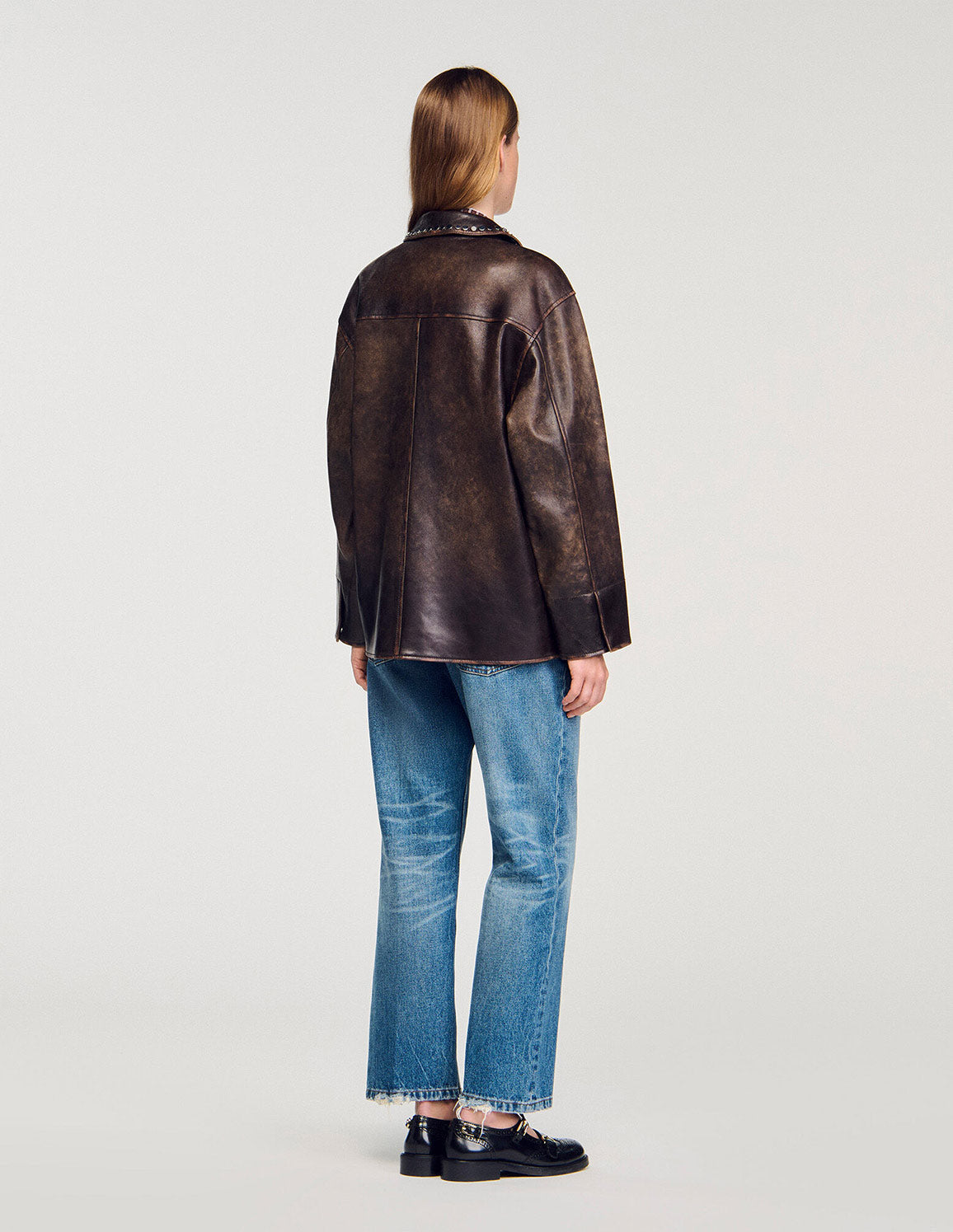 • Oversized distressed leather jacket with lapel collar, embellished with studs on the collar edge and pocket openings, featuring a button placket fastening.