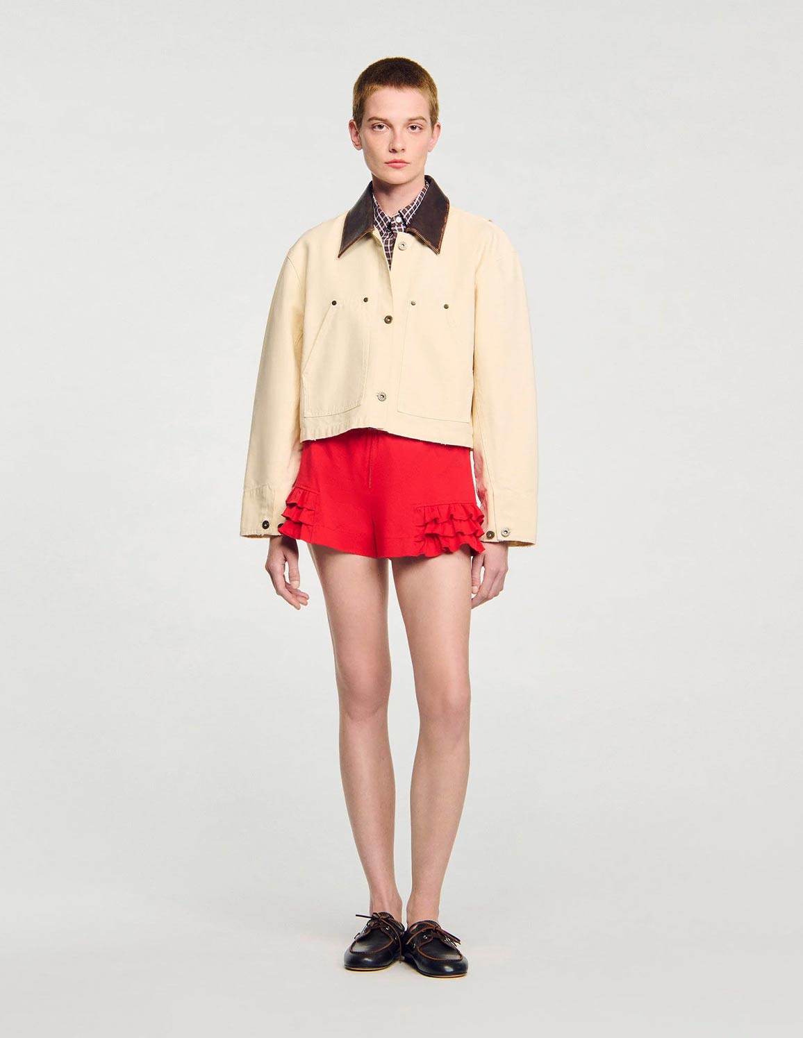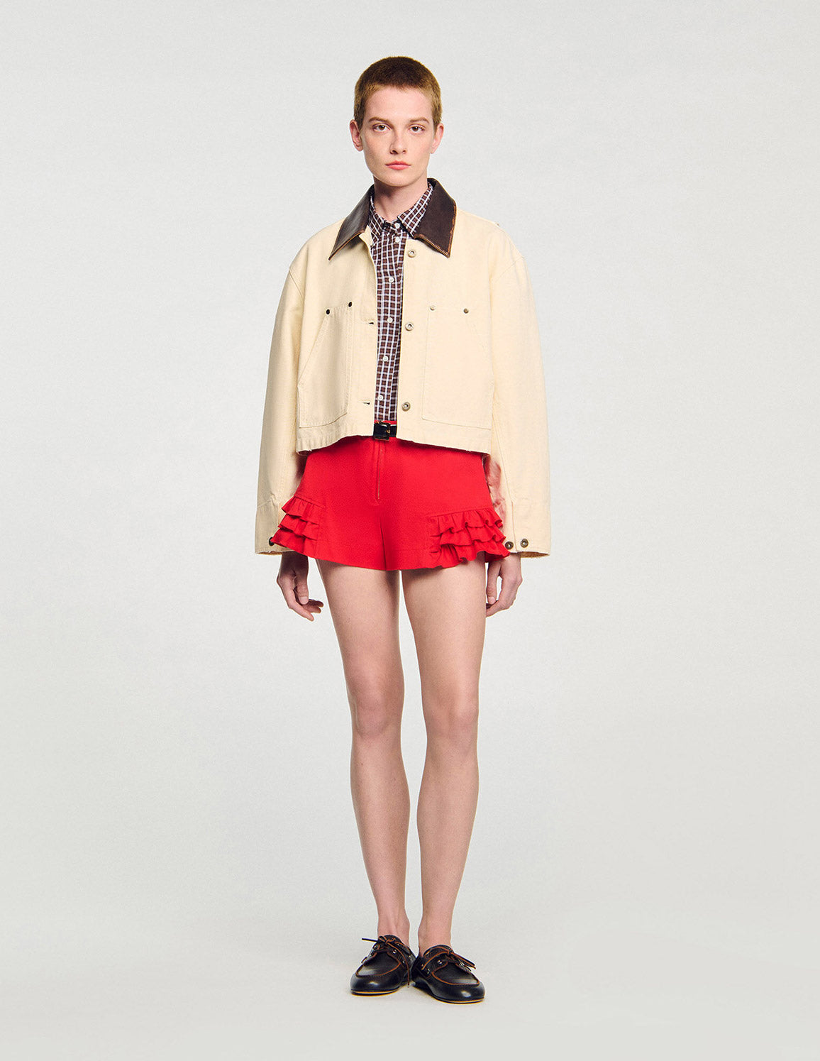 • Workwear cotton jacket with contrasting lamb leather collar, long sleeves with buttoned cuffs, button fastening, and patch pockets with rivets.