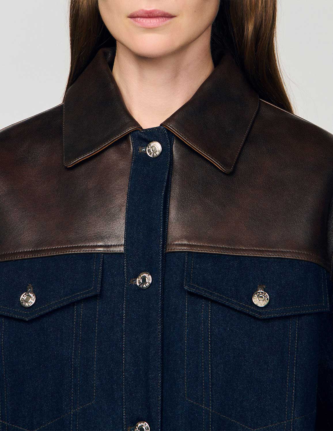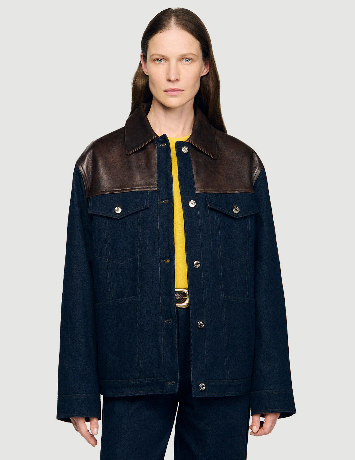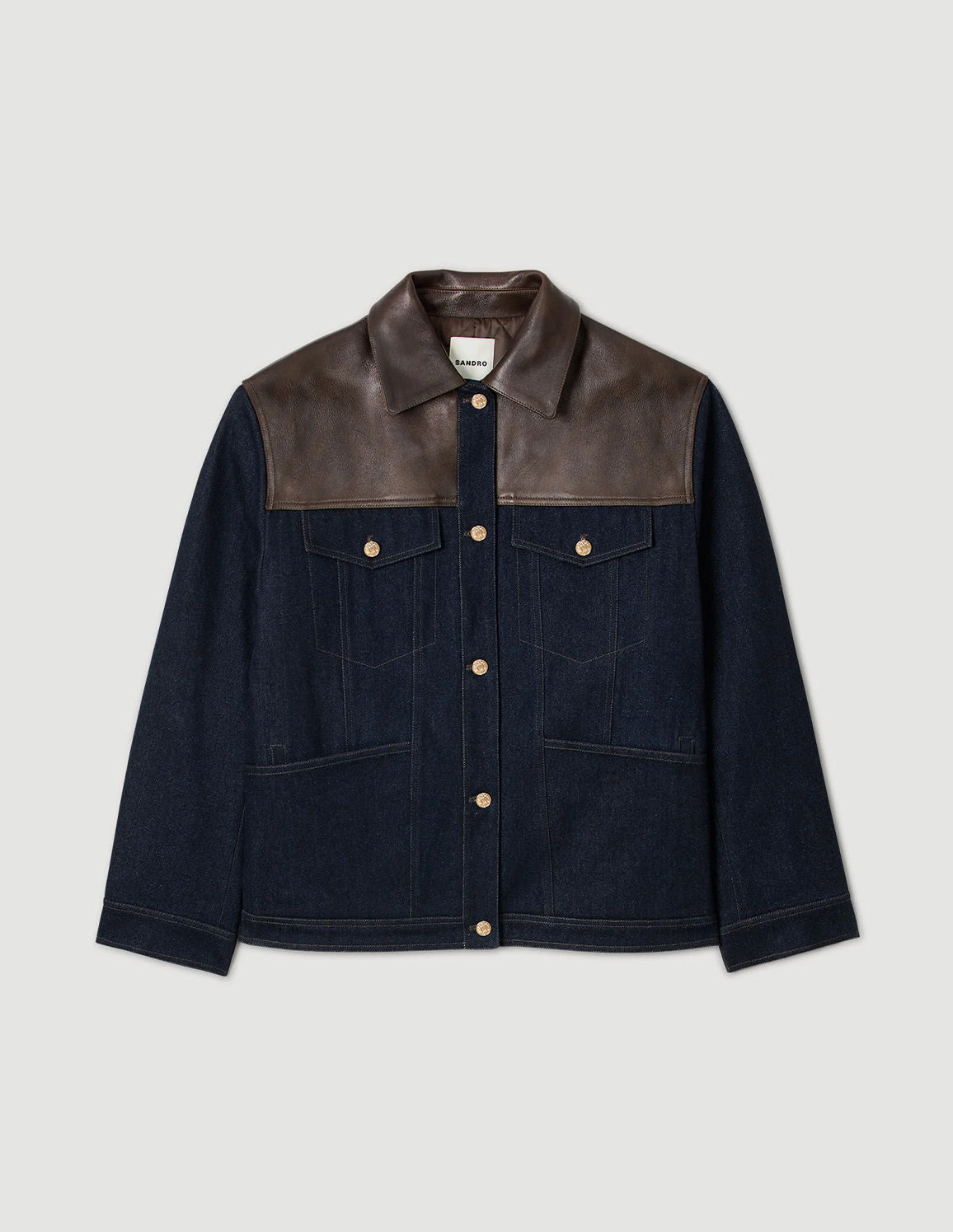 • Quilted jacket in raw denim and contrasting leather, featuring a shirt collar, long sleeves with buttoned slits, and a button placket fastening.