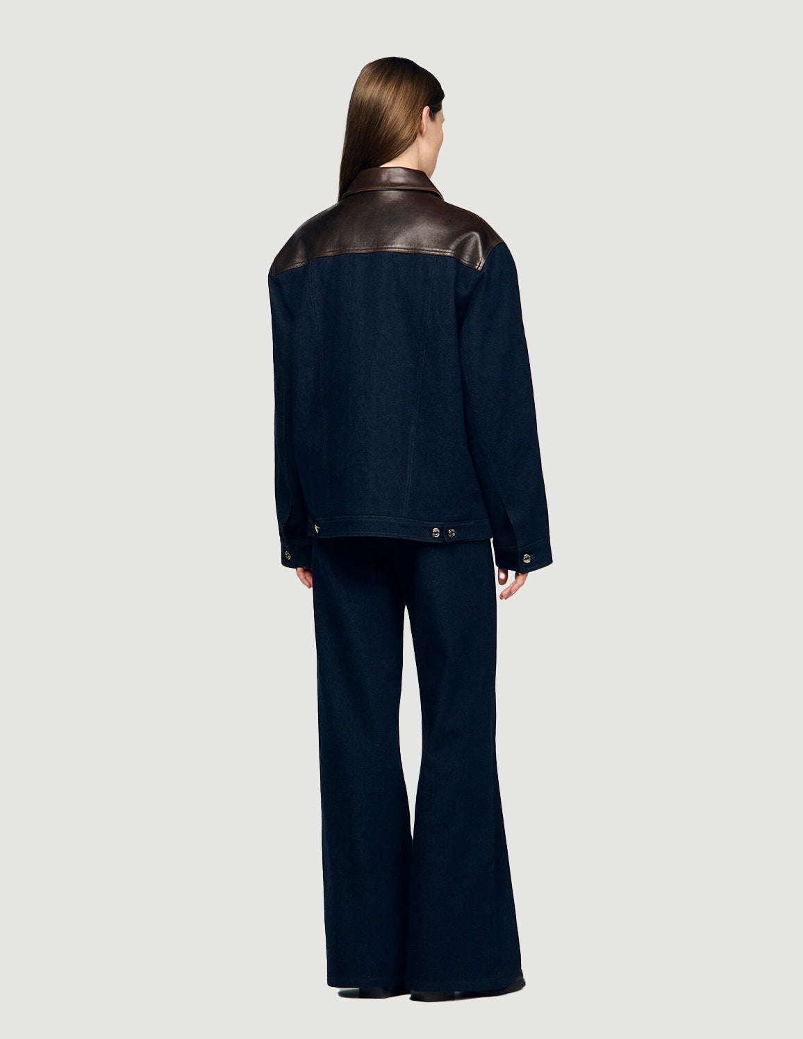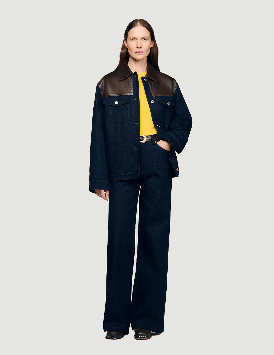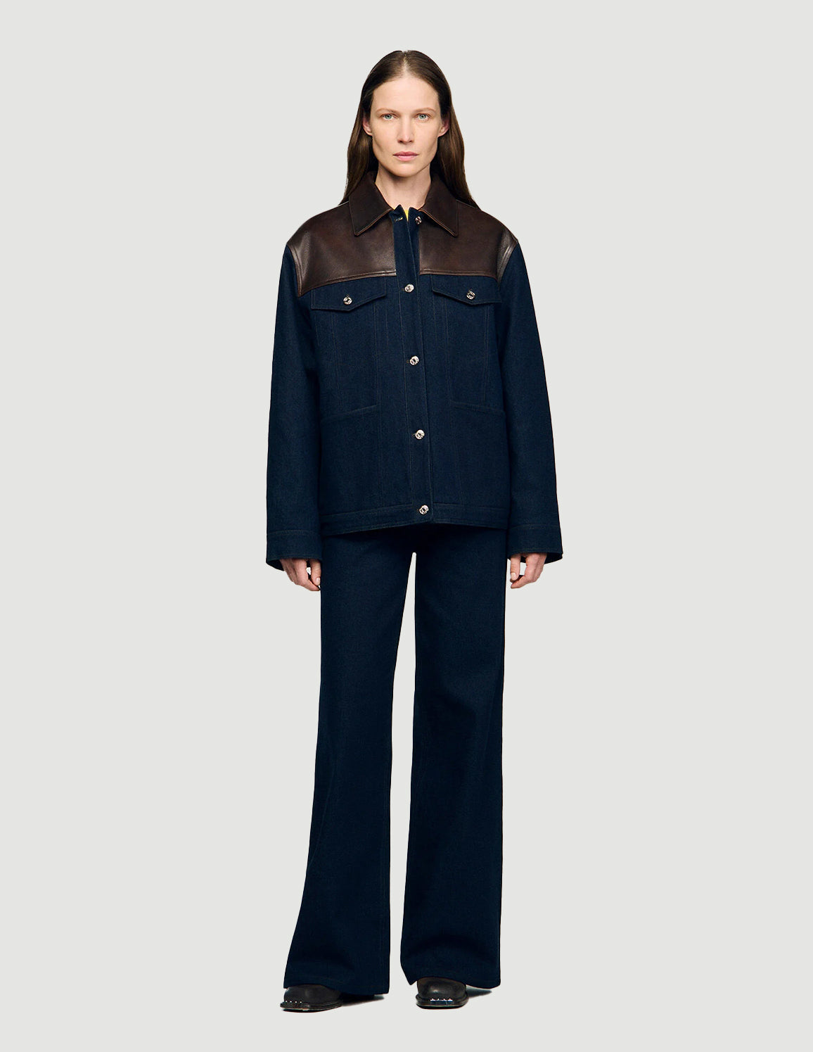 • Quilted jacket in raw denim and contrasting leather, featuring a shirt collar, long sleeves with buttoned slits, and a button placket fastening.