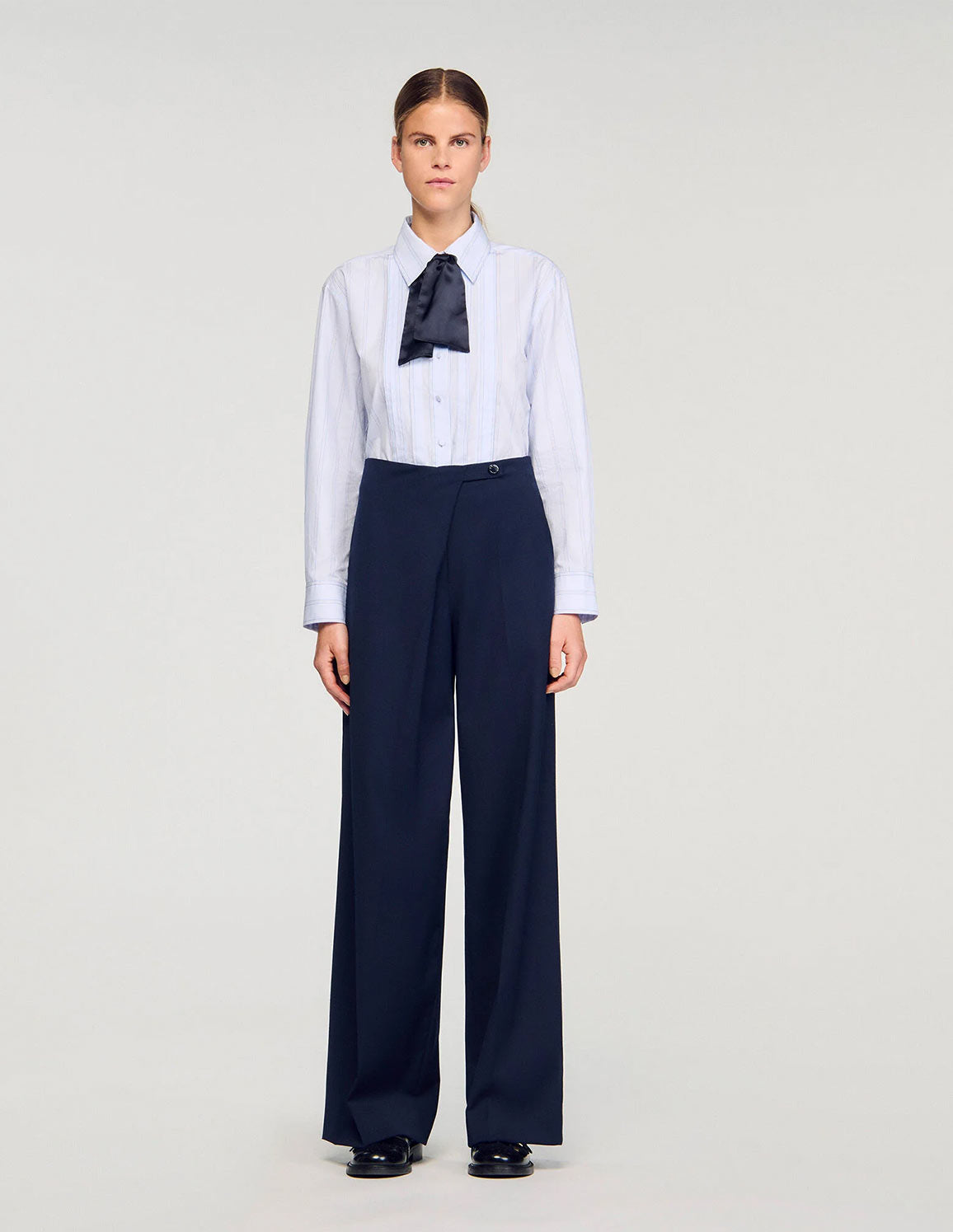 • Wide-leg, straight-fit high-waisted trousers with an asymmetrical front panel and press-stud fastening.