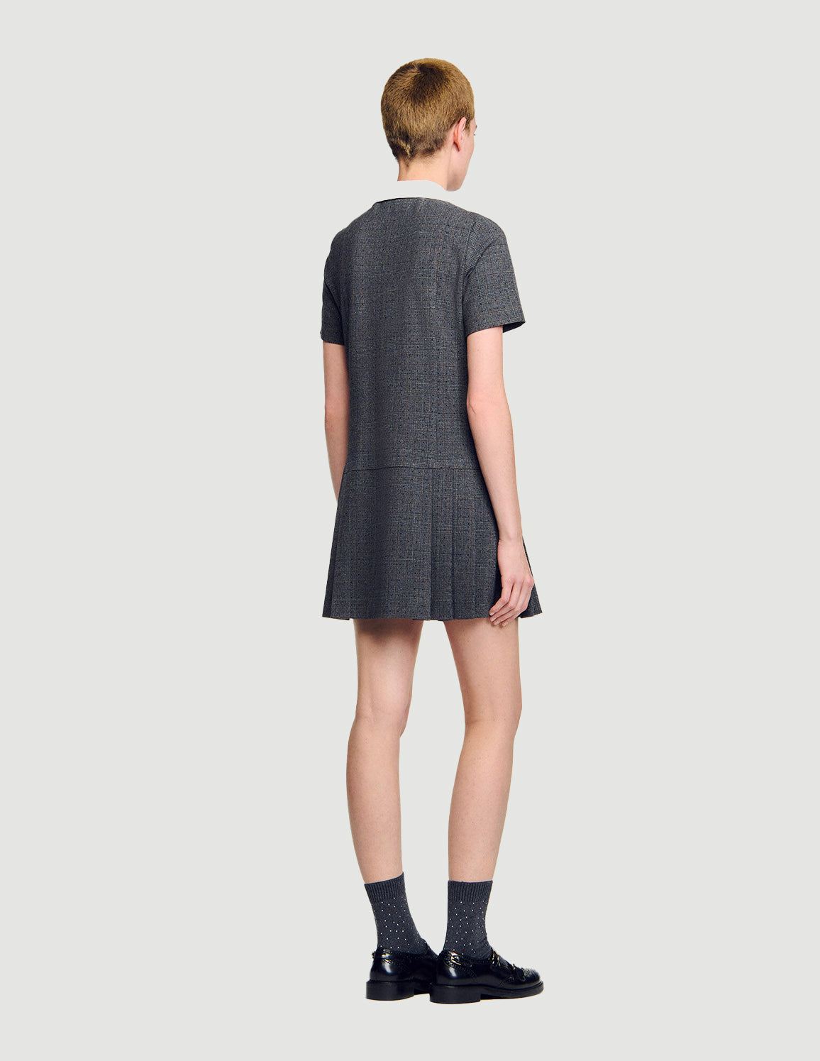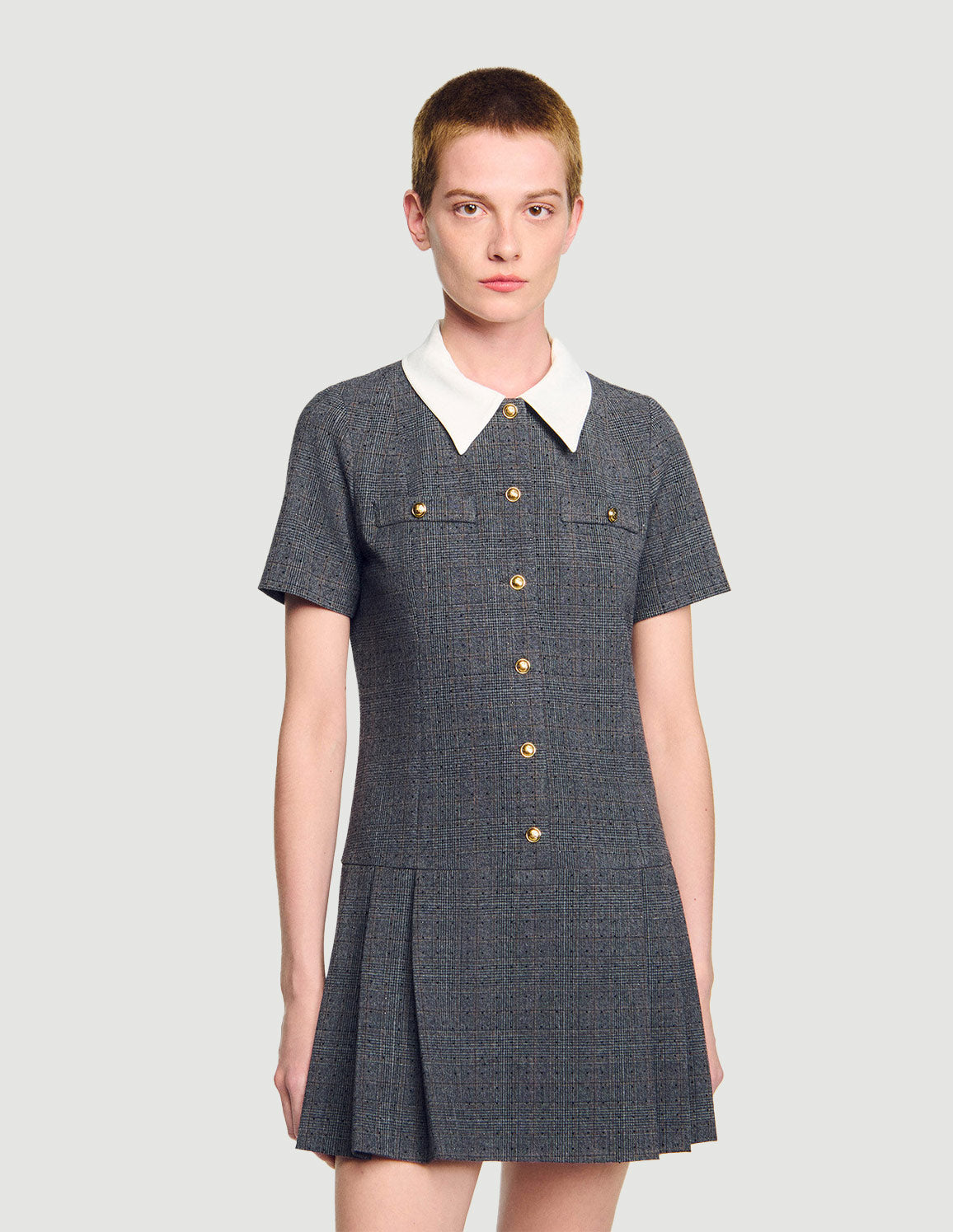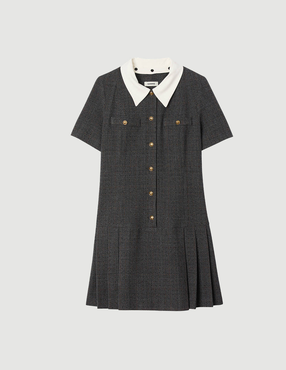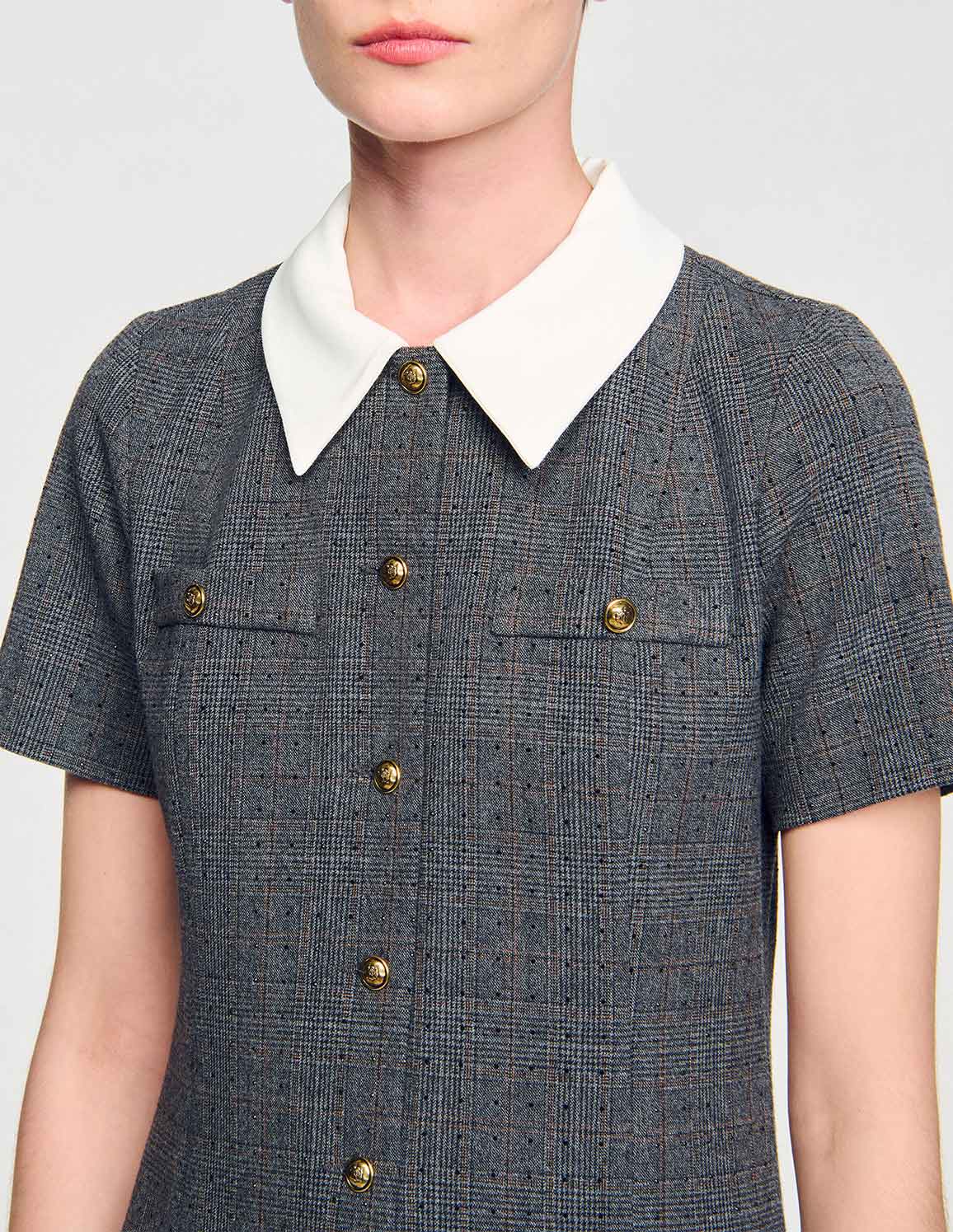 • Short checked dress embellished with rhinestones, featuring short sleeves, a removable contrasting collar and buttoned mock welt pockets at the chest.