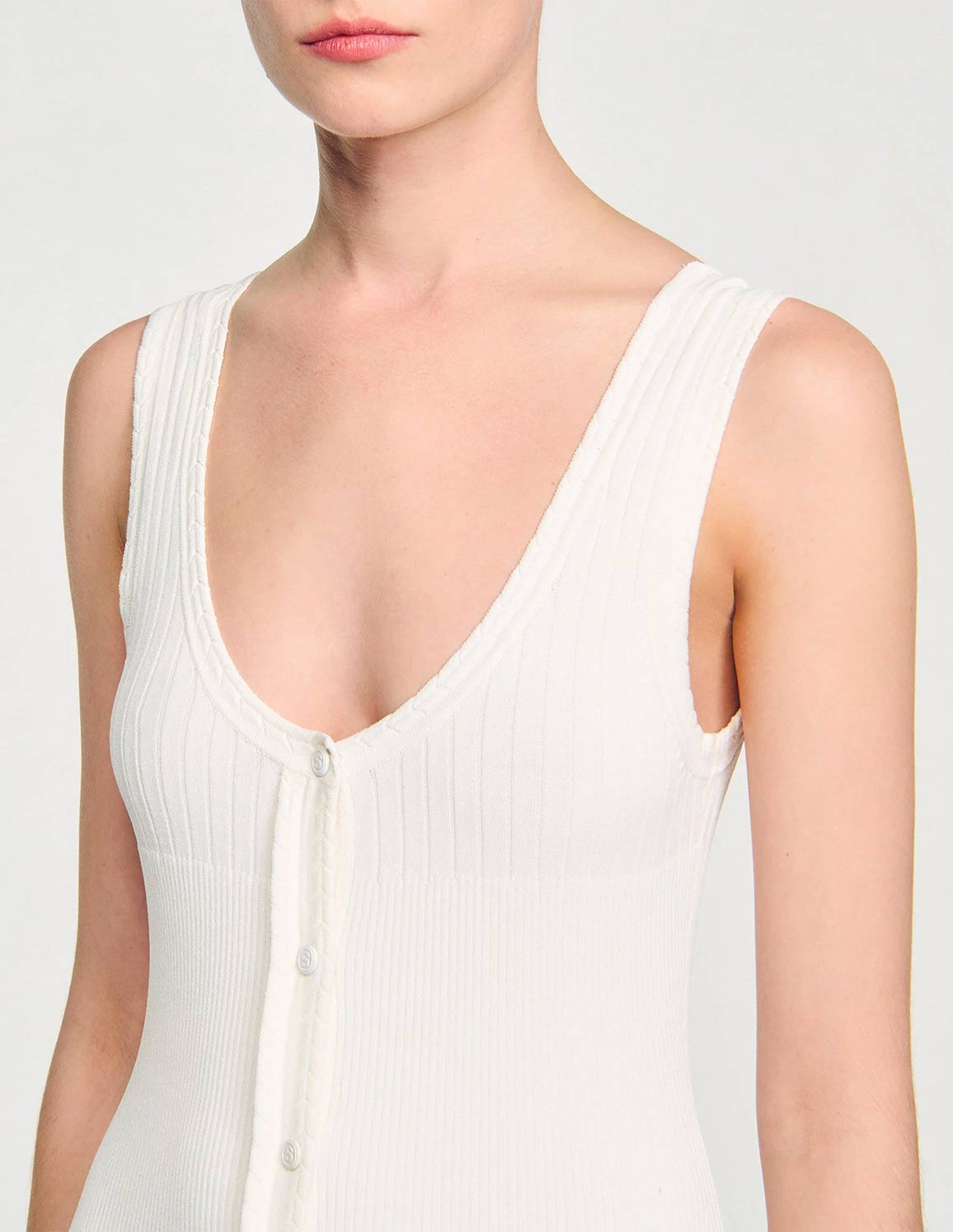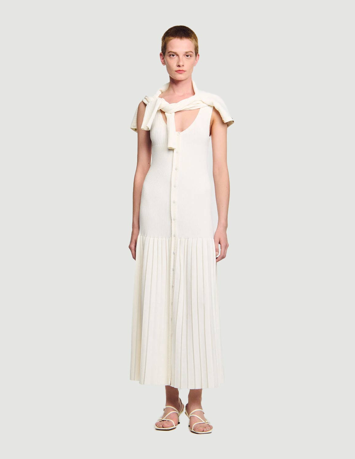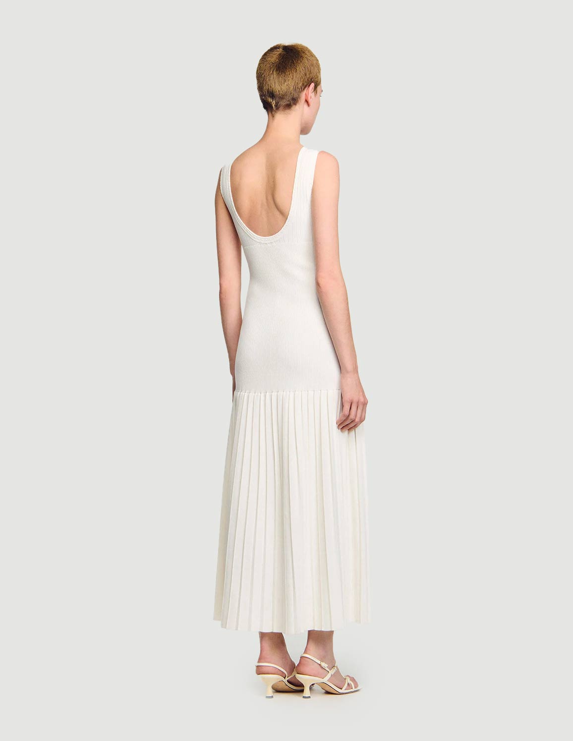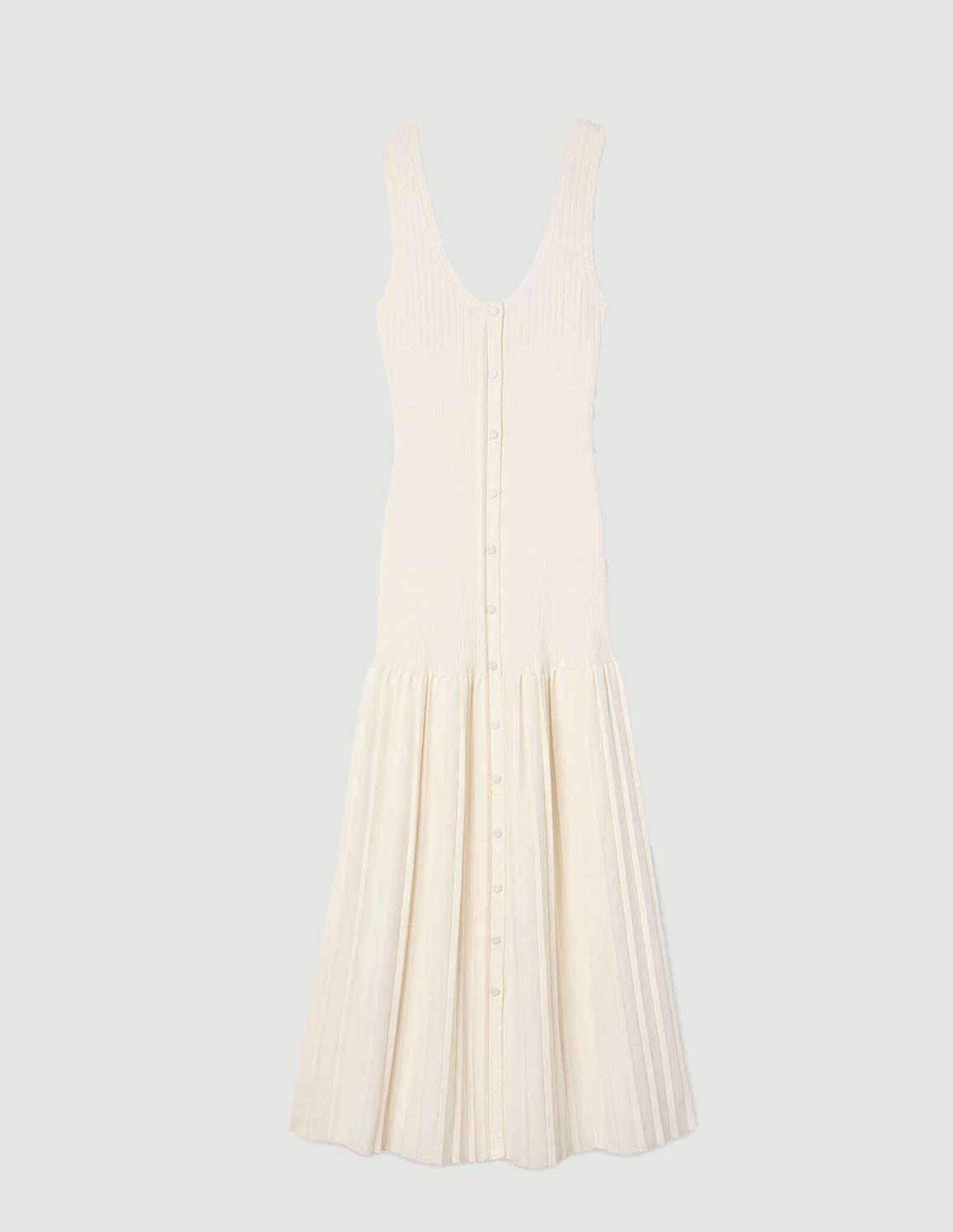 • Long knit dress with straps, a press-stud fastening and a flared pleated-effect skirt.