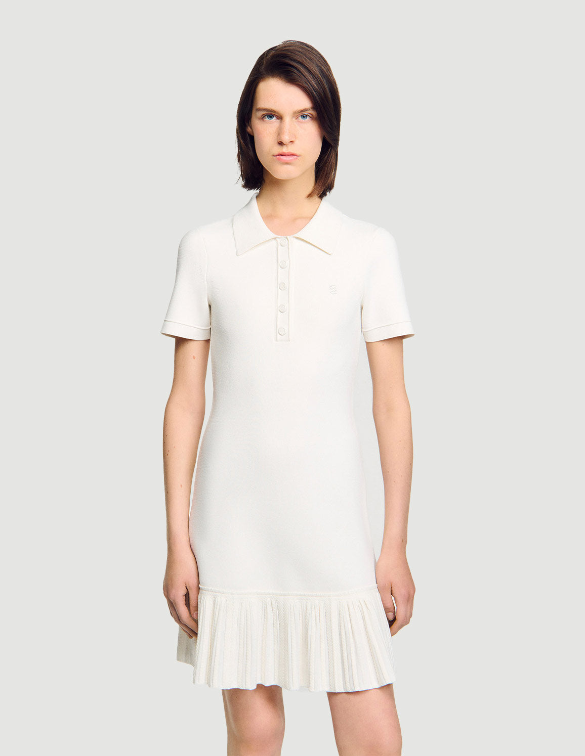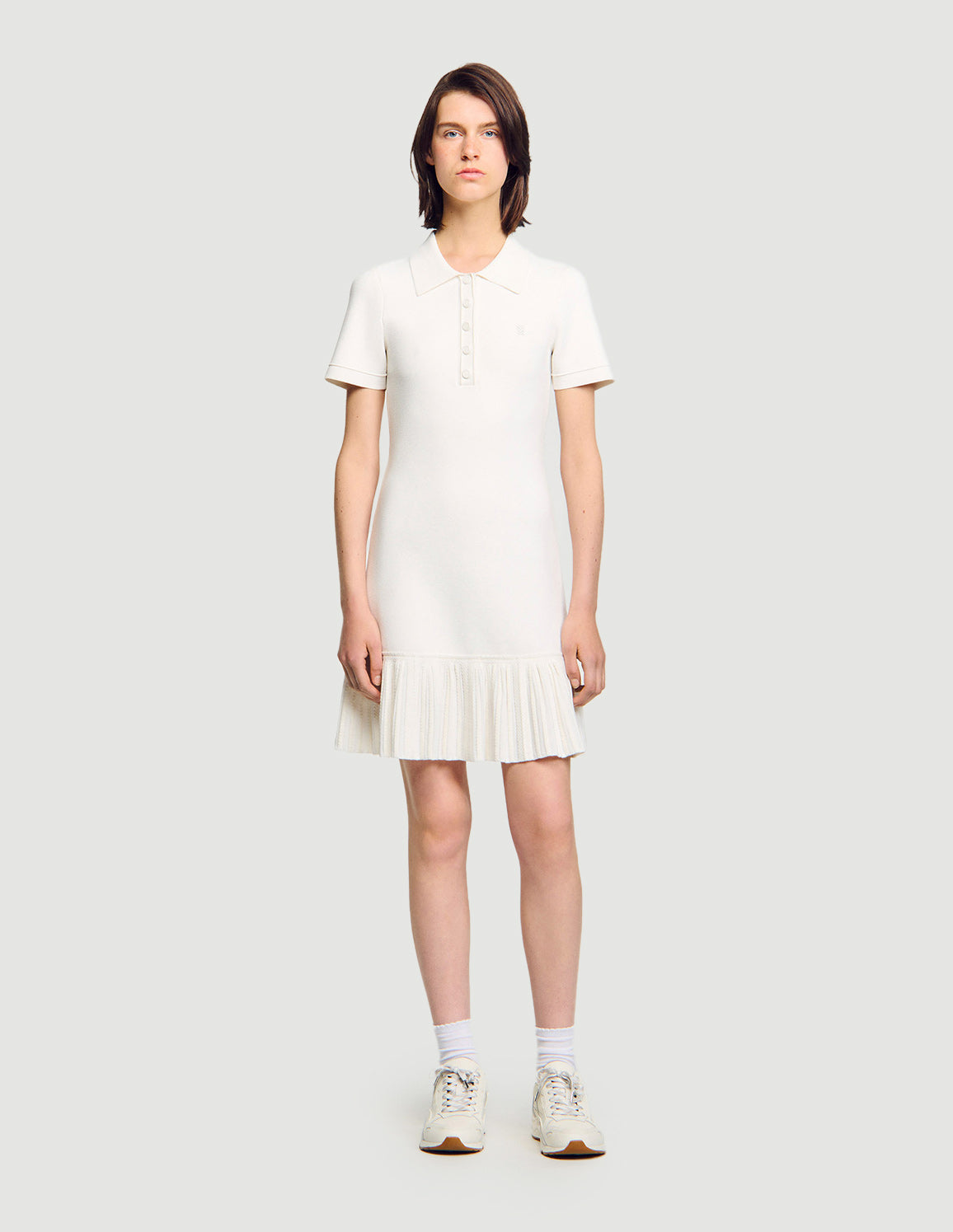 • Short knit dress with short sleeves, buttoned polo collar, and pleated skirt.