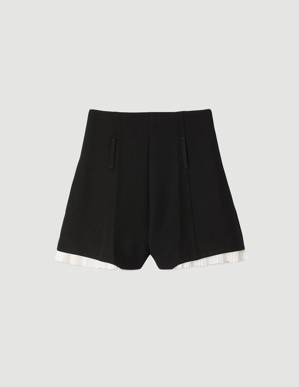 • High-waisted tailored shorts with a flared cut, featuring contrasting pleated bands at the bottom.