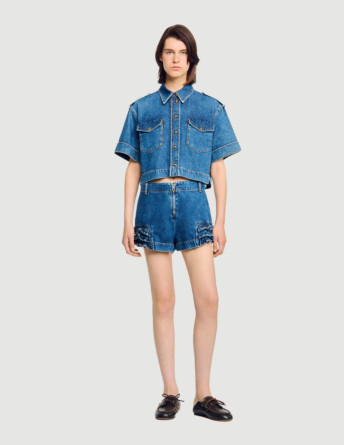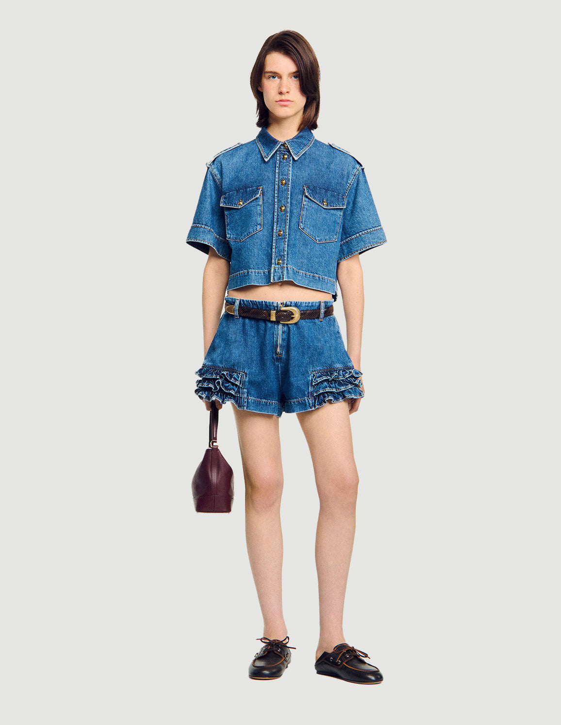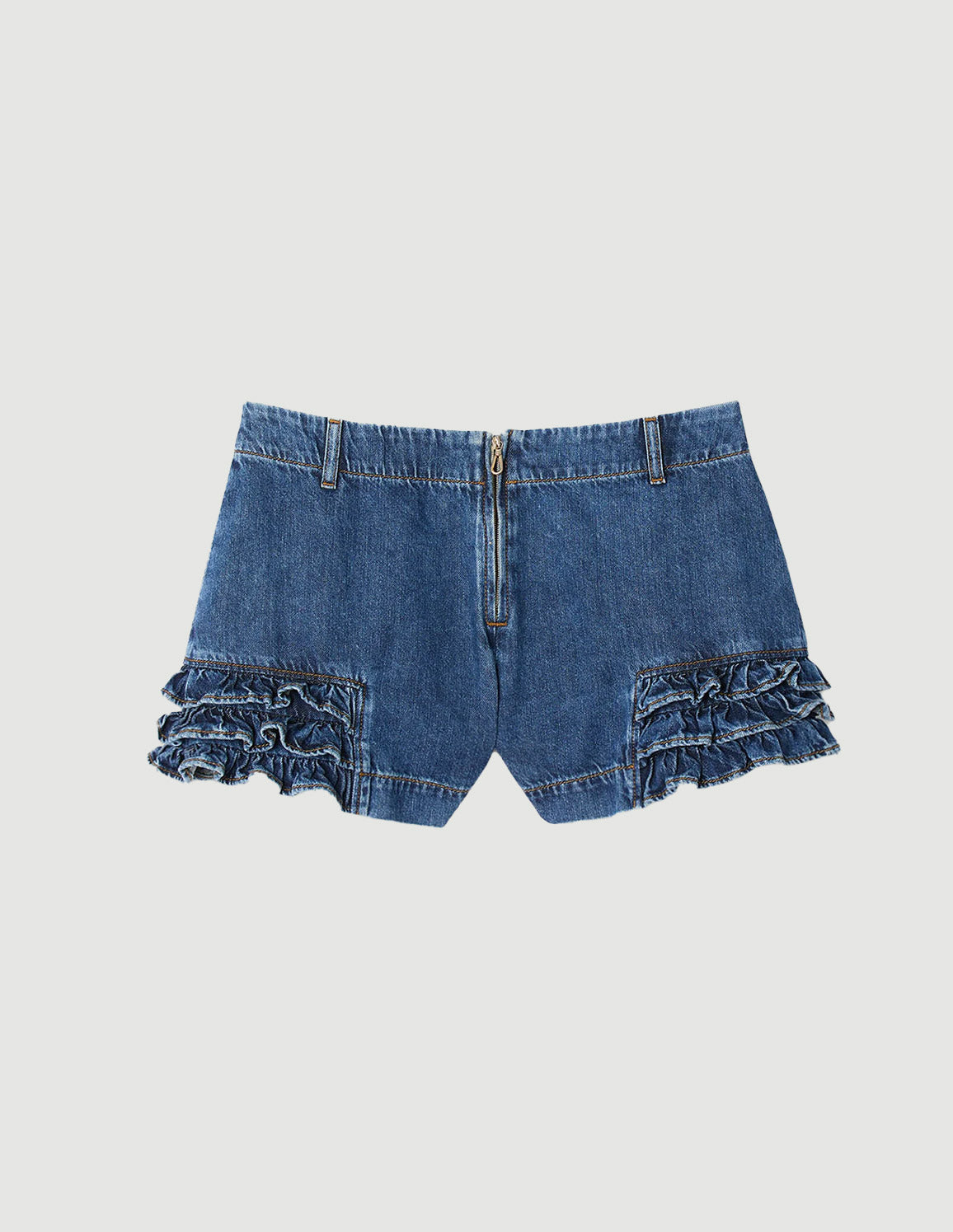• Flared denim shorts with ruffles and contrasting topstitching, featuring belt loops and a front zip fastening.