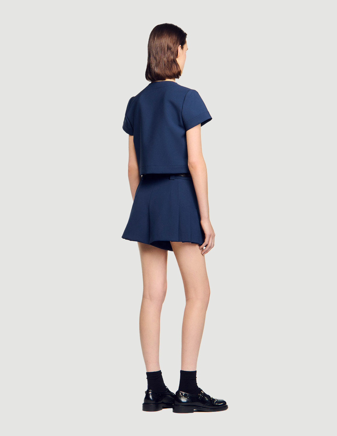 • Fine knit crop top with a round neck, short sleeves, button fastening and a rounded hem.