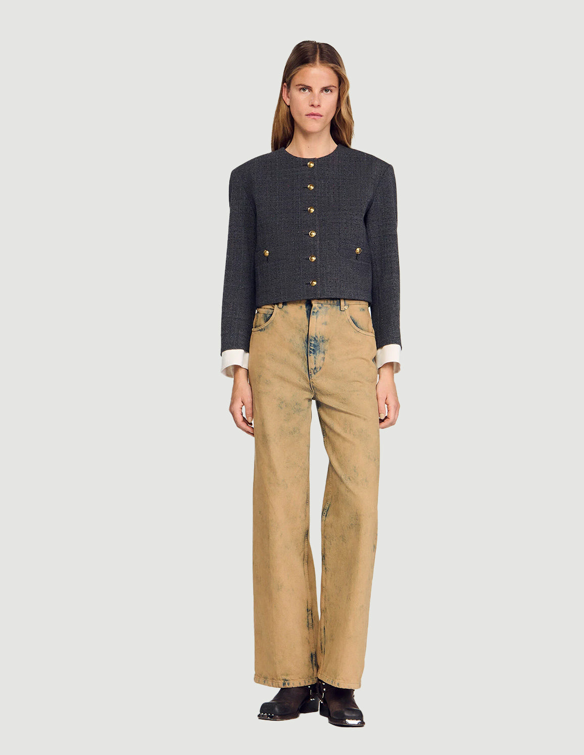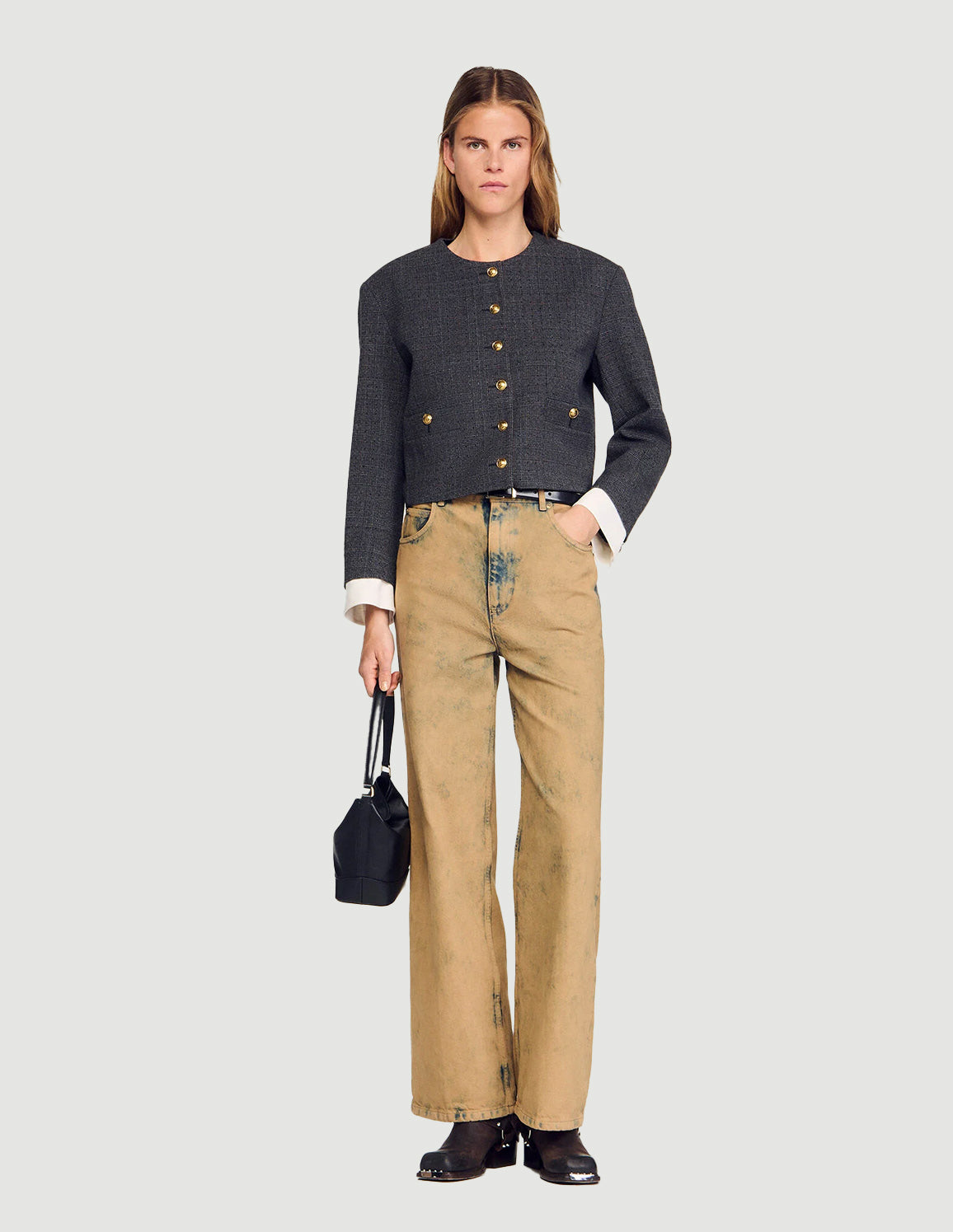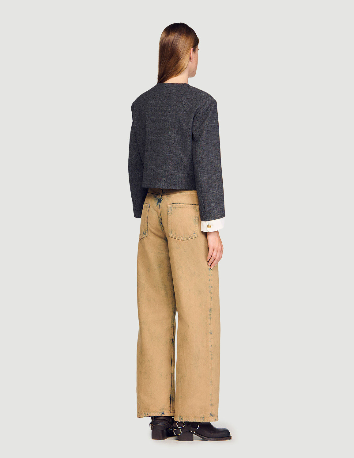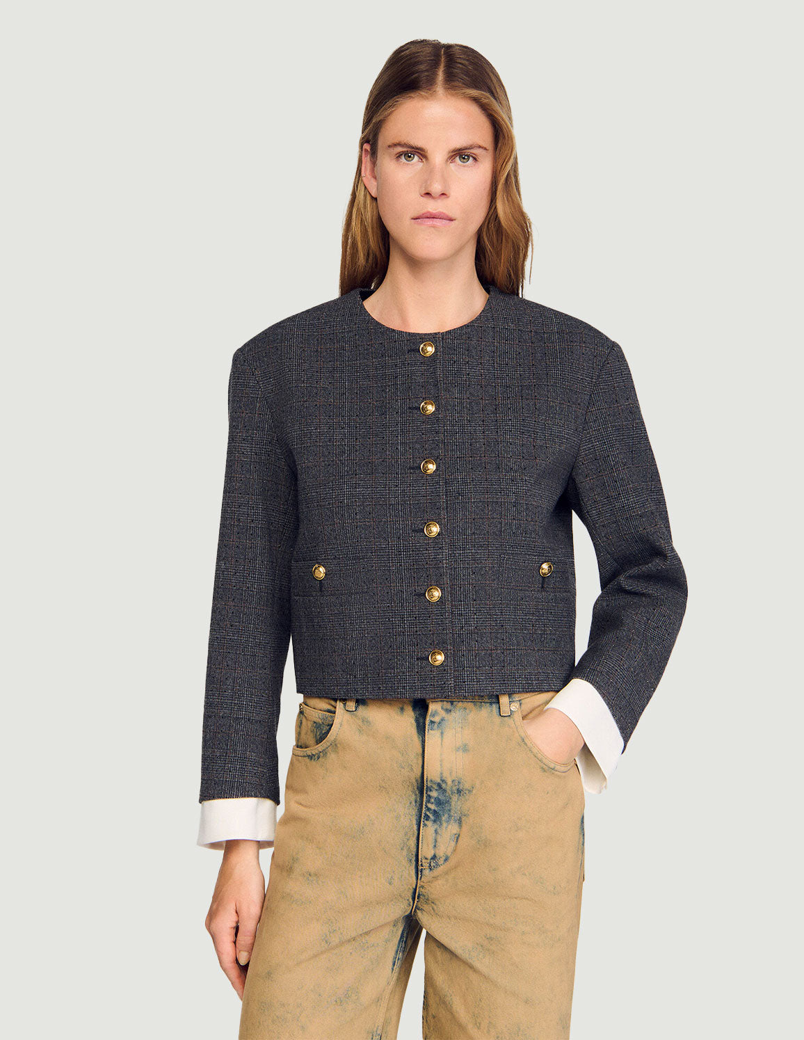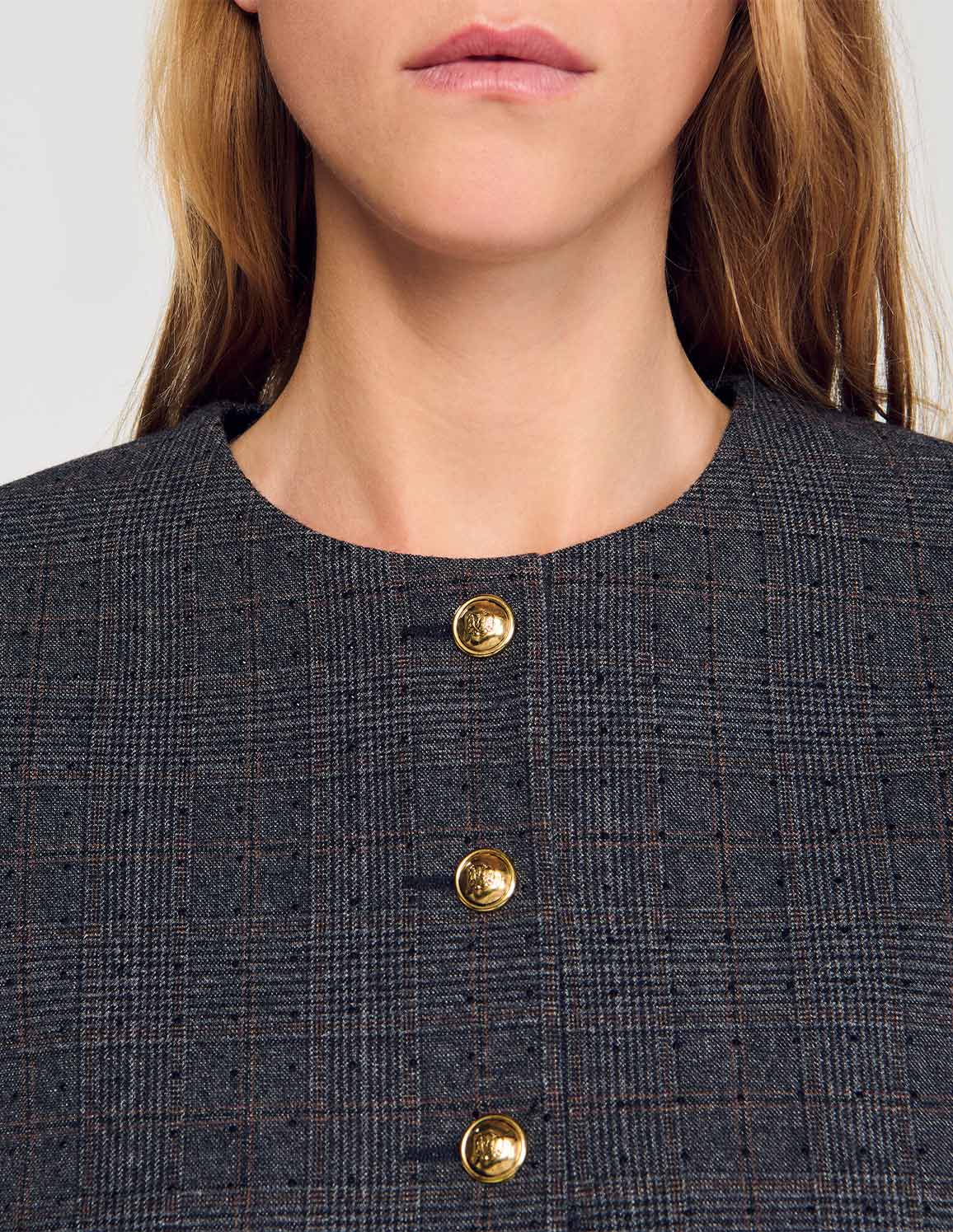 • Short, structured checked suit jacket adorned with rhinestones, featuring a round neck, long sleeves and removable contrasting cuffs fastened with a button.