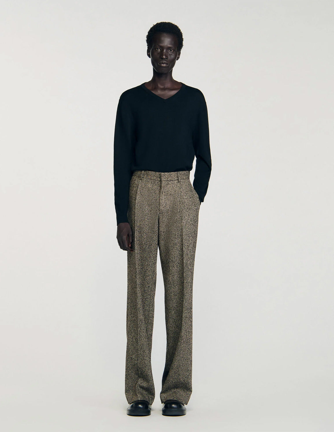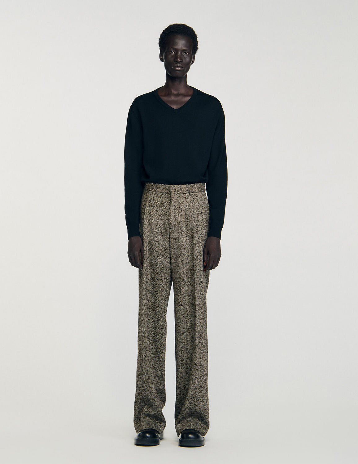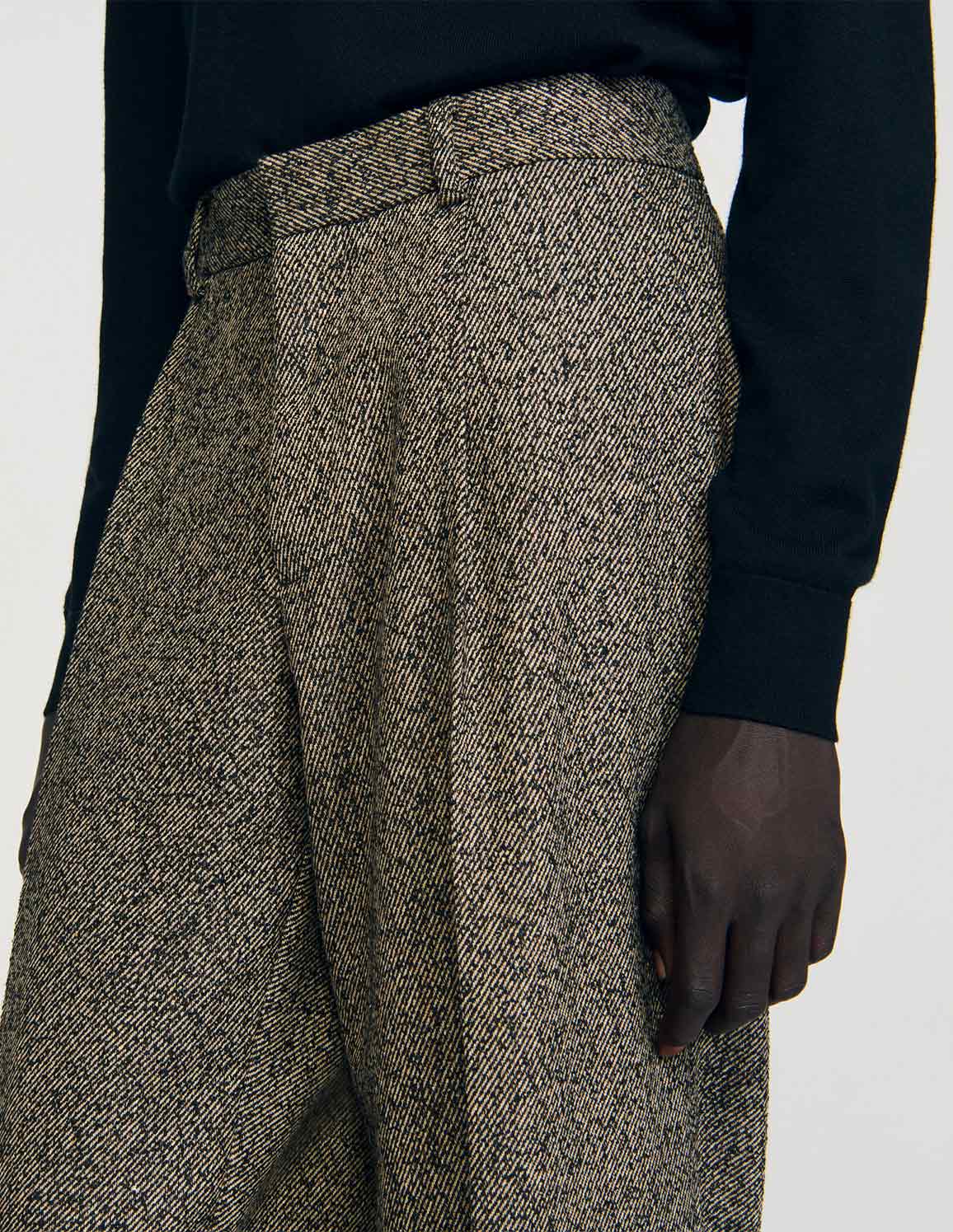 • Wide-leg wool suit trousers with front pockets and welt pockets on the back.