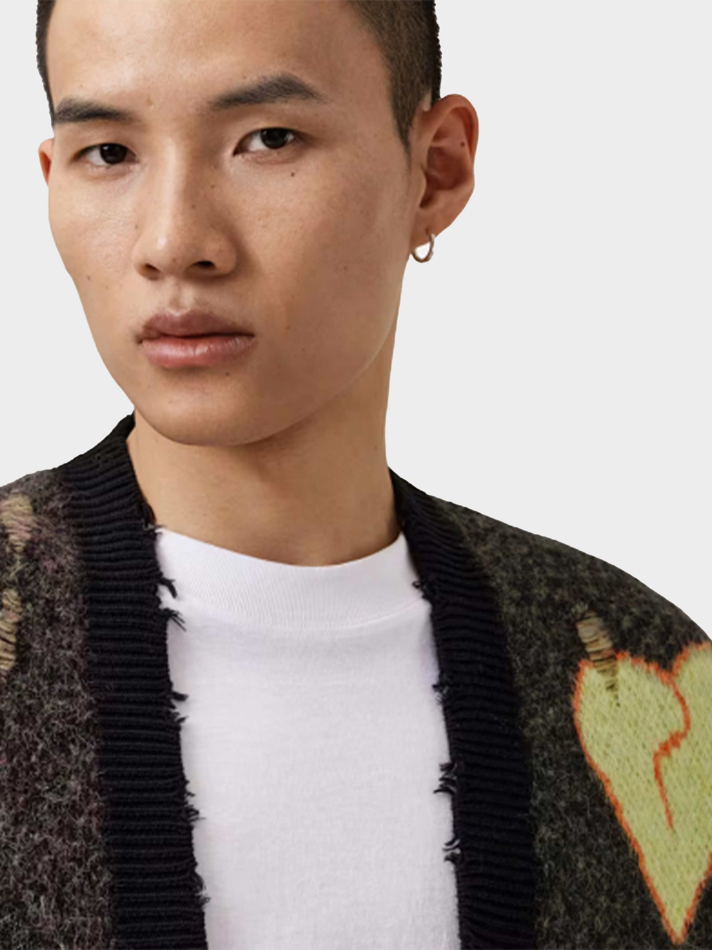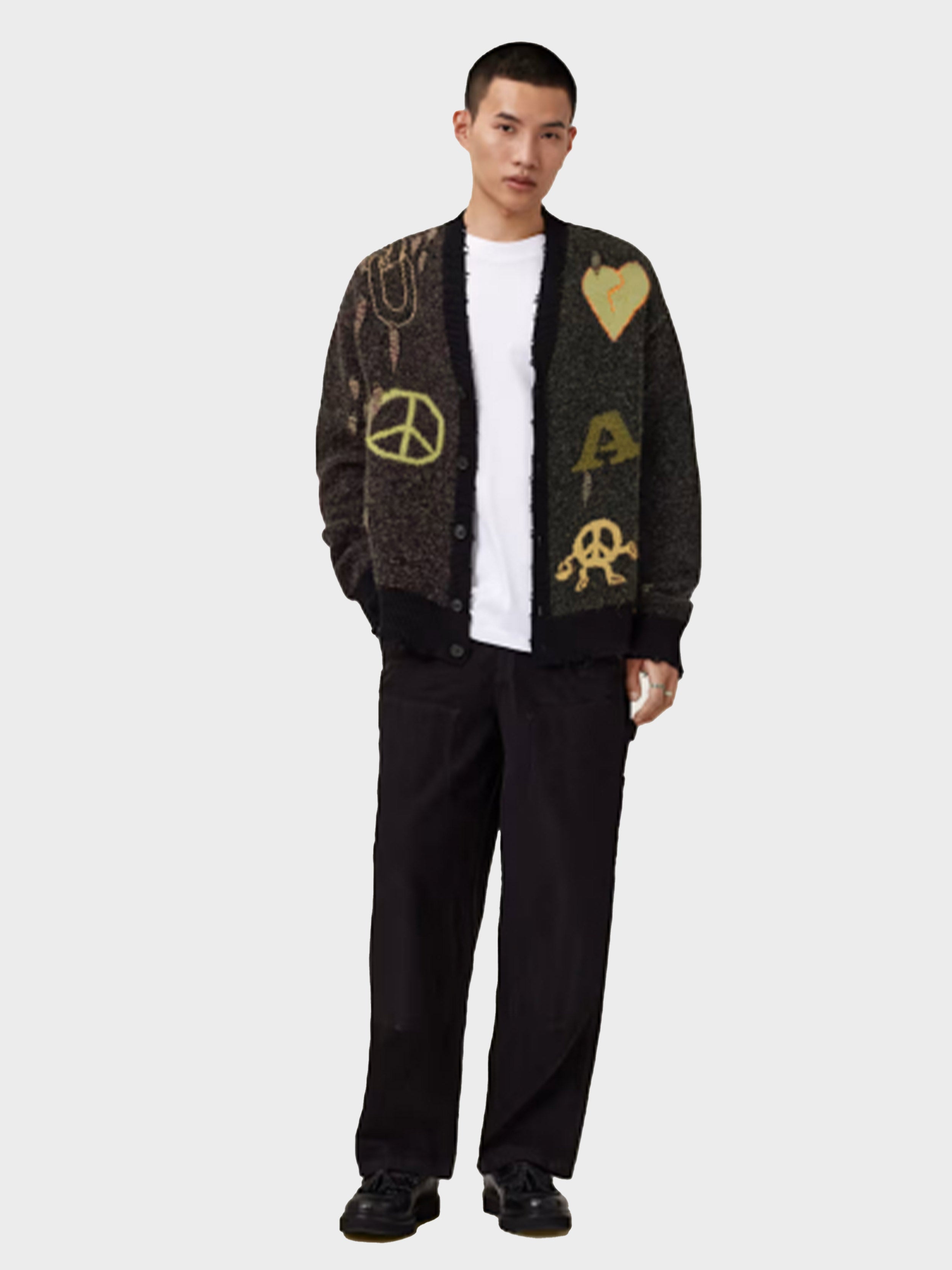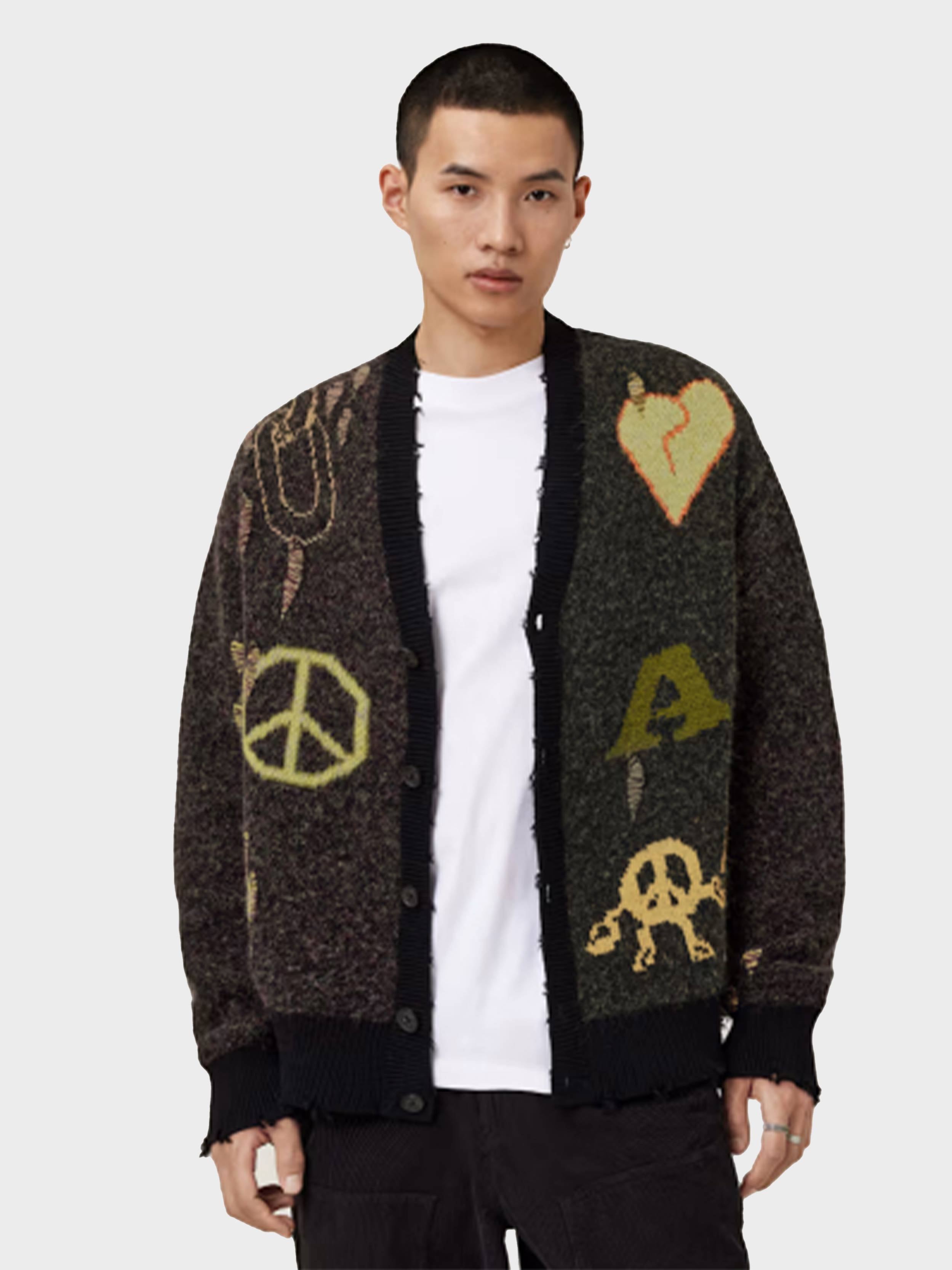 • The Emotive Cardigan is totally AllSaints (and a message to your future winter collection). Featuring all-over jacquard details – from our 'Message to our future' motif to a broken heart – on an organic cotton base that's soft and fluffy. It's relaxed, with distressed finishes – that's the AllSaints edge.
