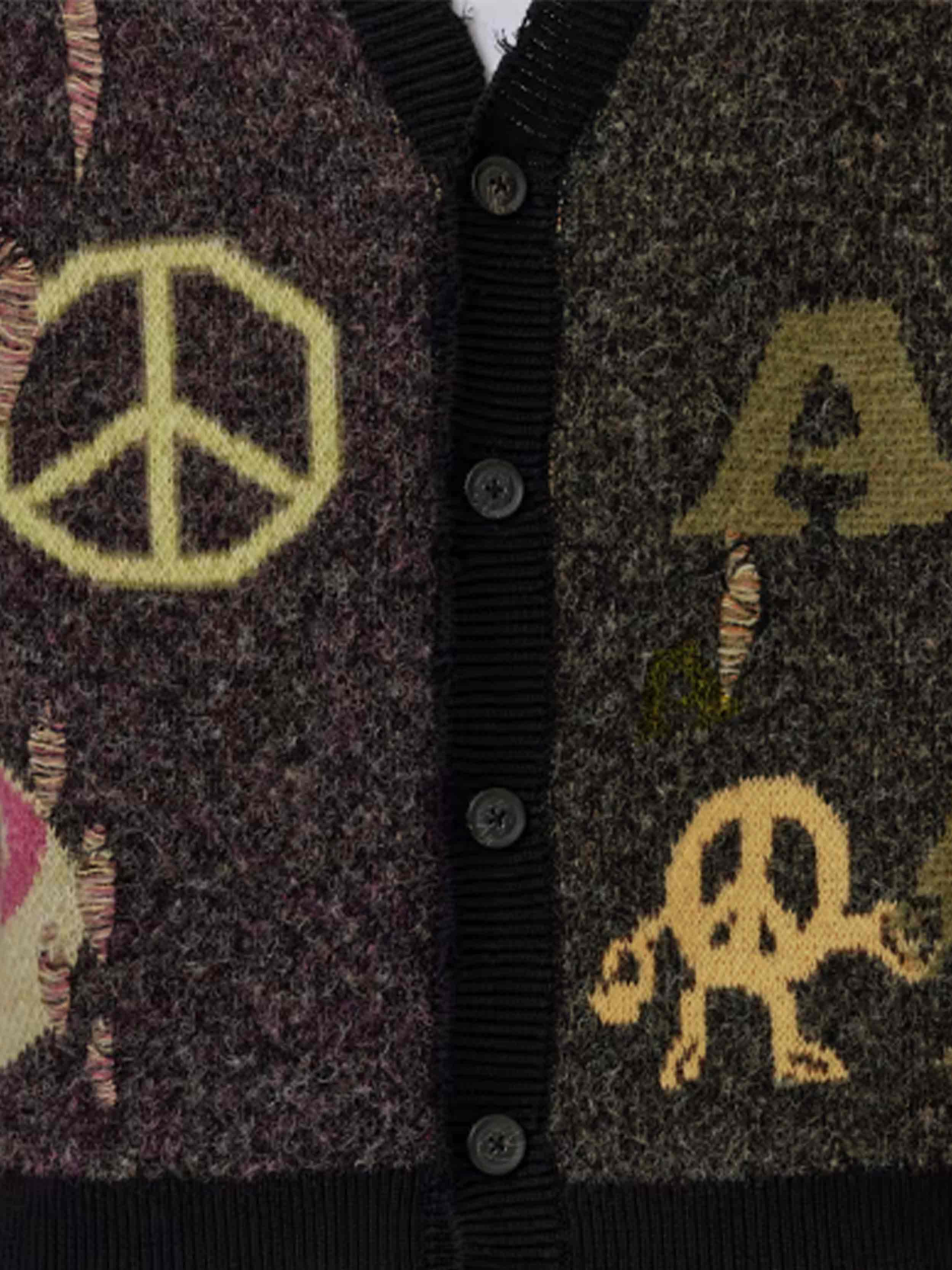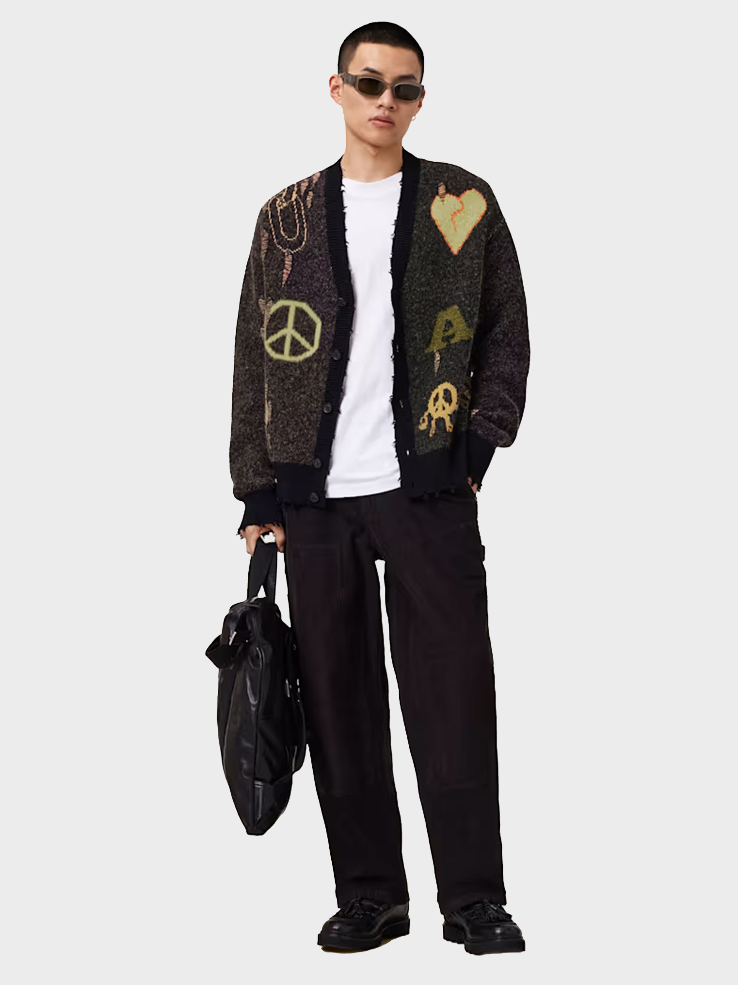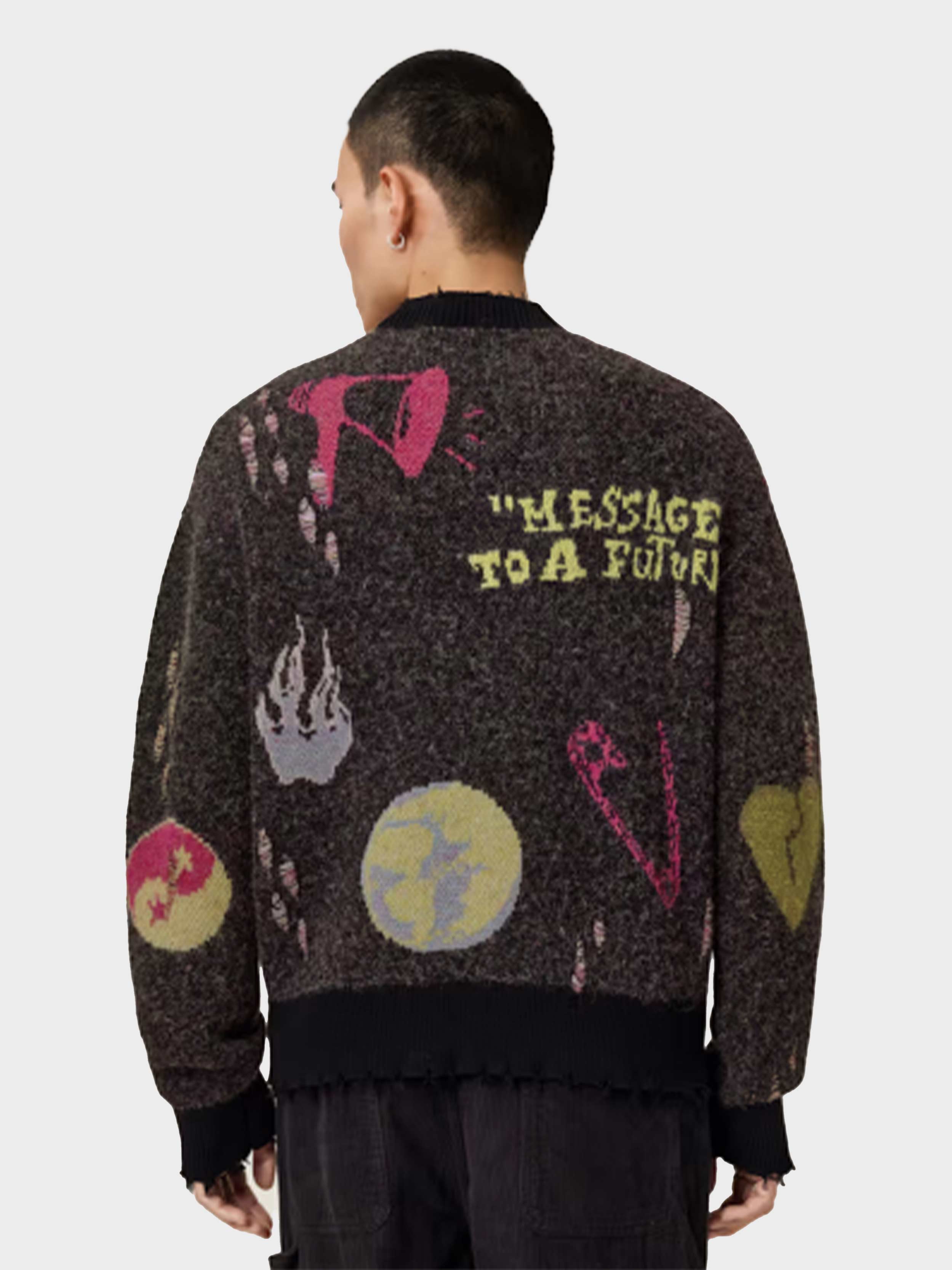 • The Emotive Cardigan is totally AllSaints (and a message to your future winter collection). Featuring all-over jacquard details – from our 'Message to our future' motif to a broken heart – on an organic cotton base that's soft and fluffy. It's relaxed, with distressed finishes – that's the AllSaints edge.