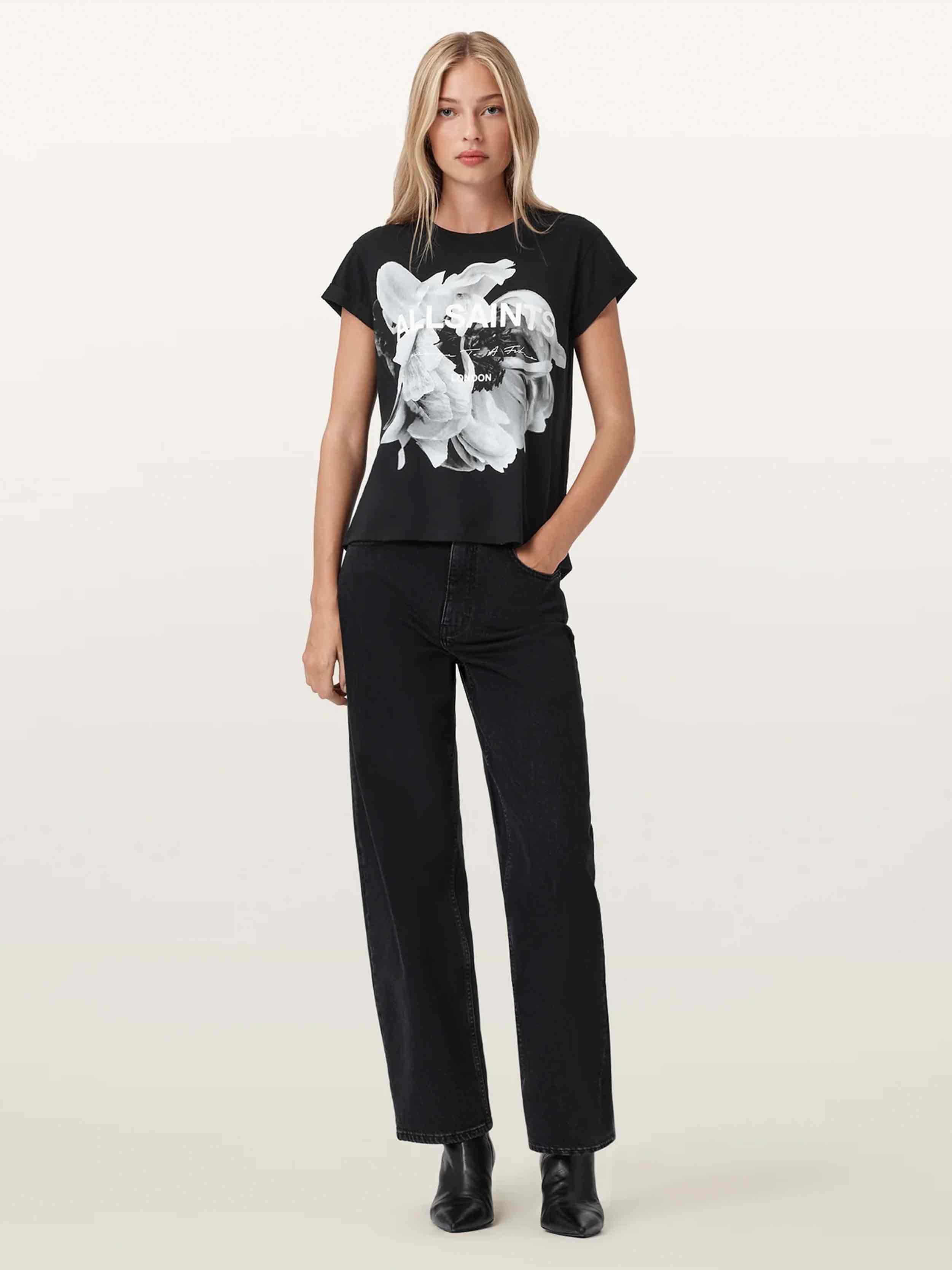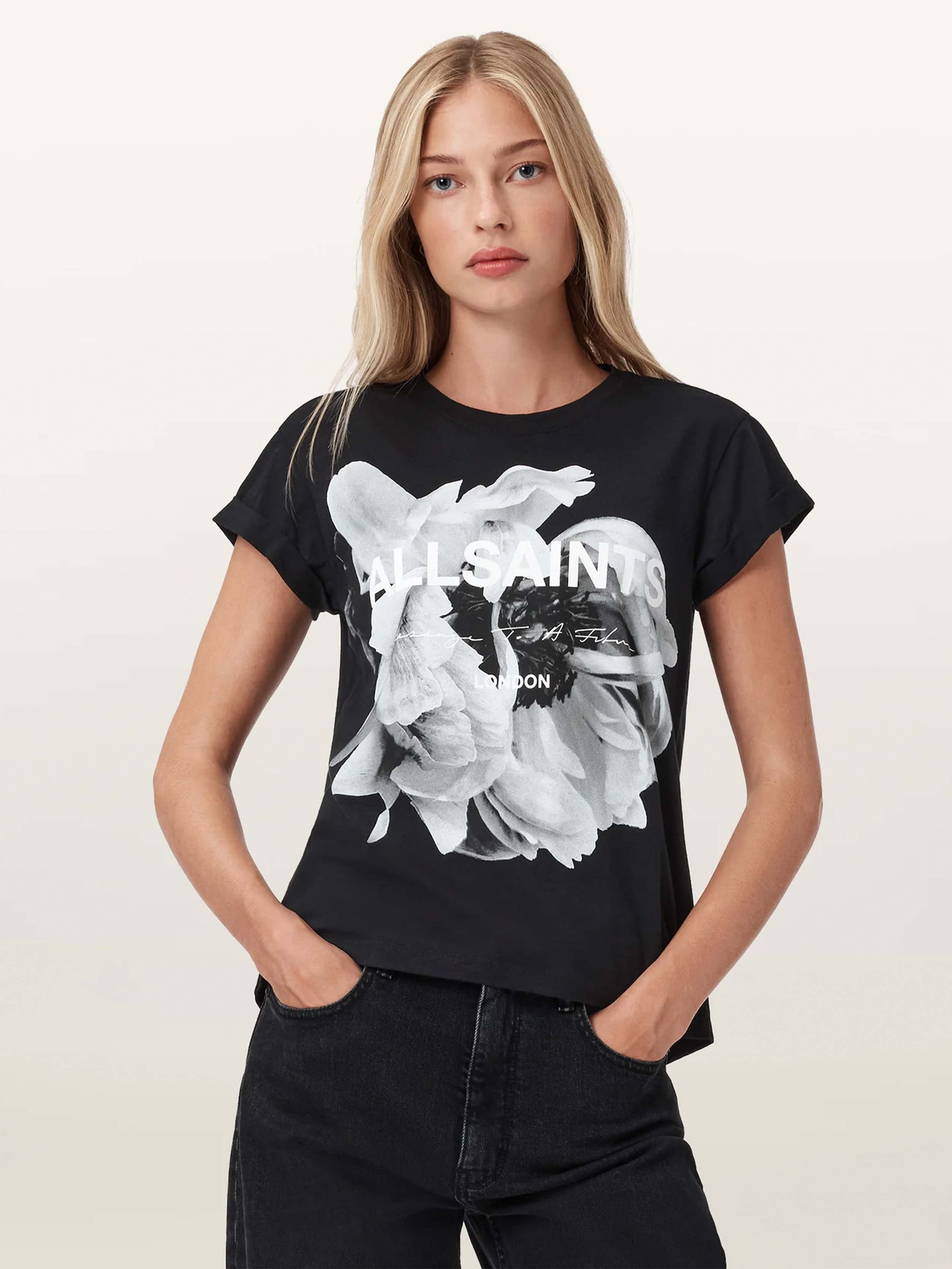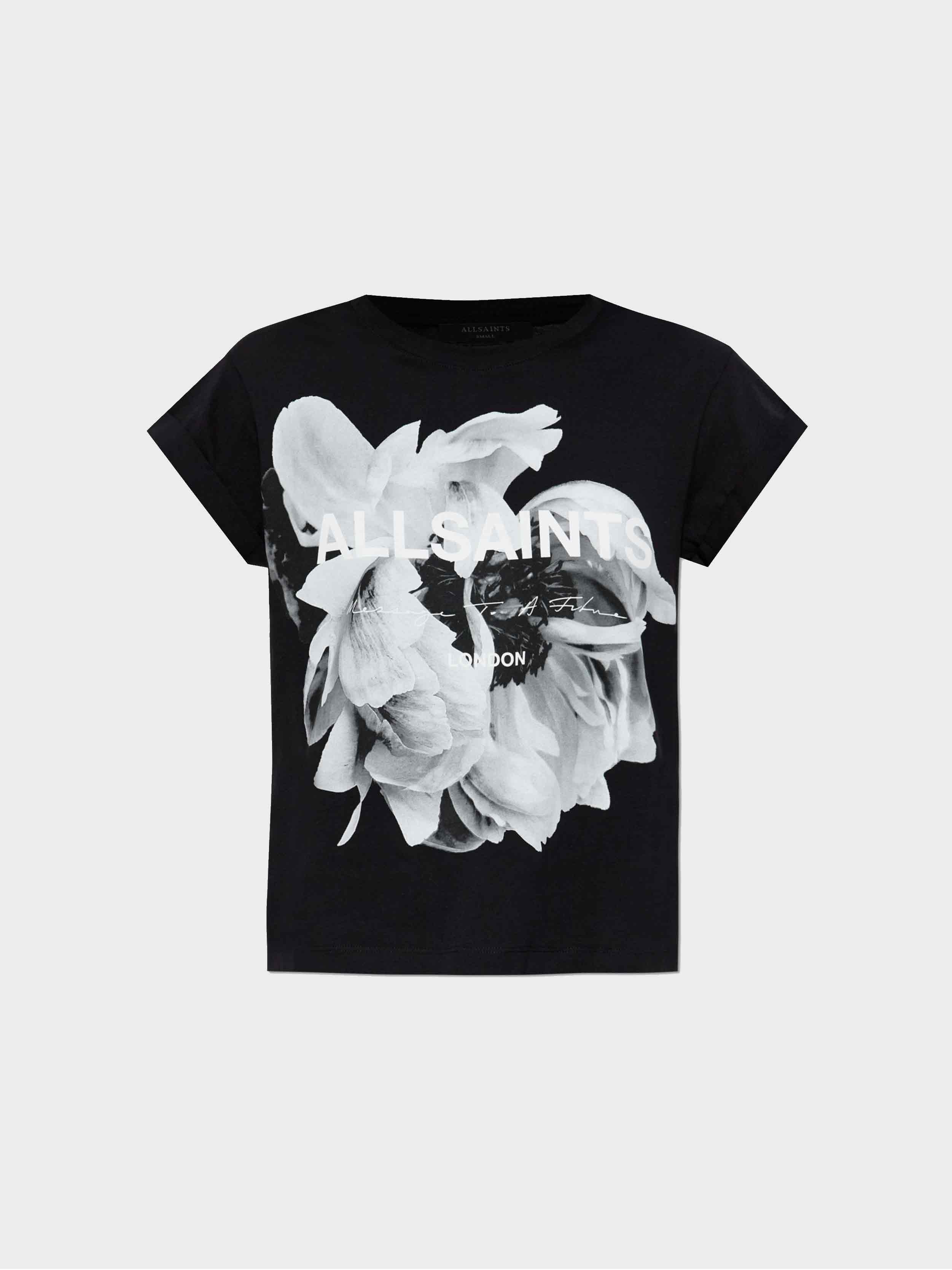 • Lena T-shirt by AllSaints is the epitome of modern elegance with an artistic flair. The classic yet slightly oversized cut harmoniously blends with short sleeves and a subtly rounded neckline, creating a sophisticated whole. The front of the shirt features a striking black and white floral print—dynamic, yet maintained in a subdued palette, making a statement of individuality. The dominant detail is the bold ALLSAINTS inscription, emphasizing the brand's prestige and the unique character of the design.