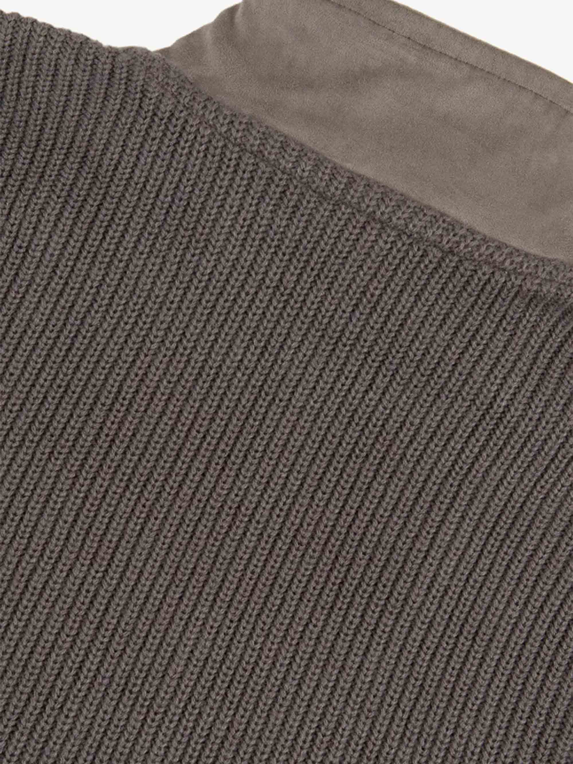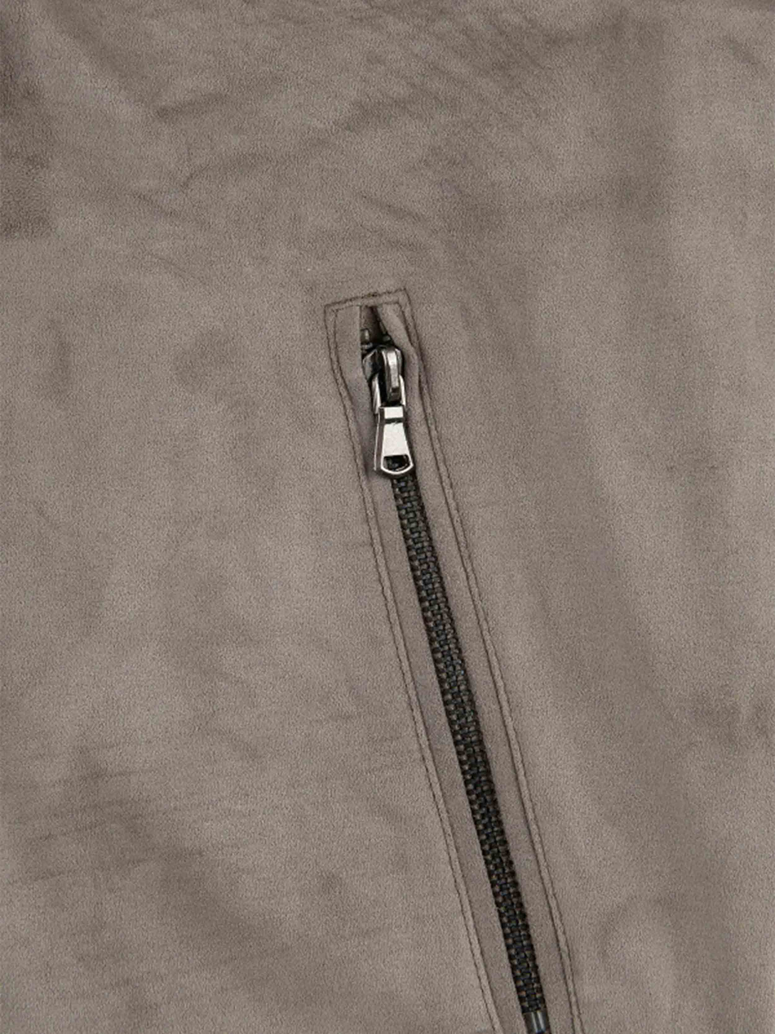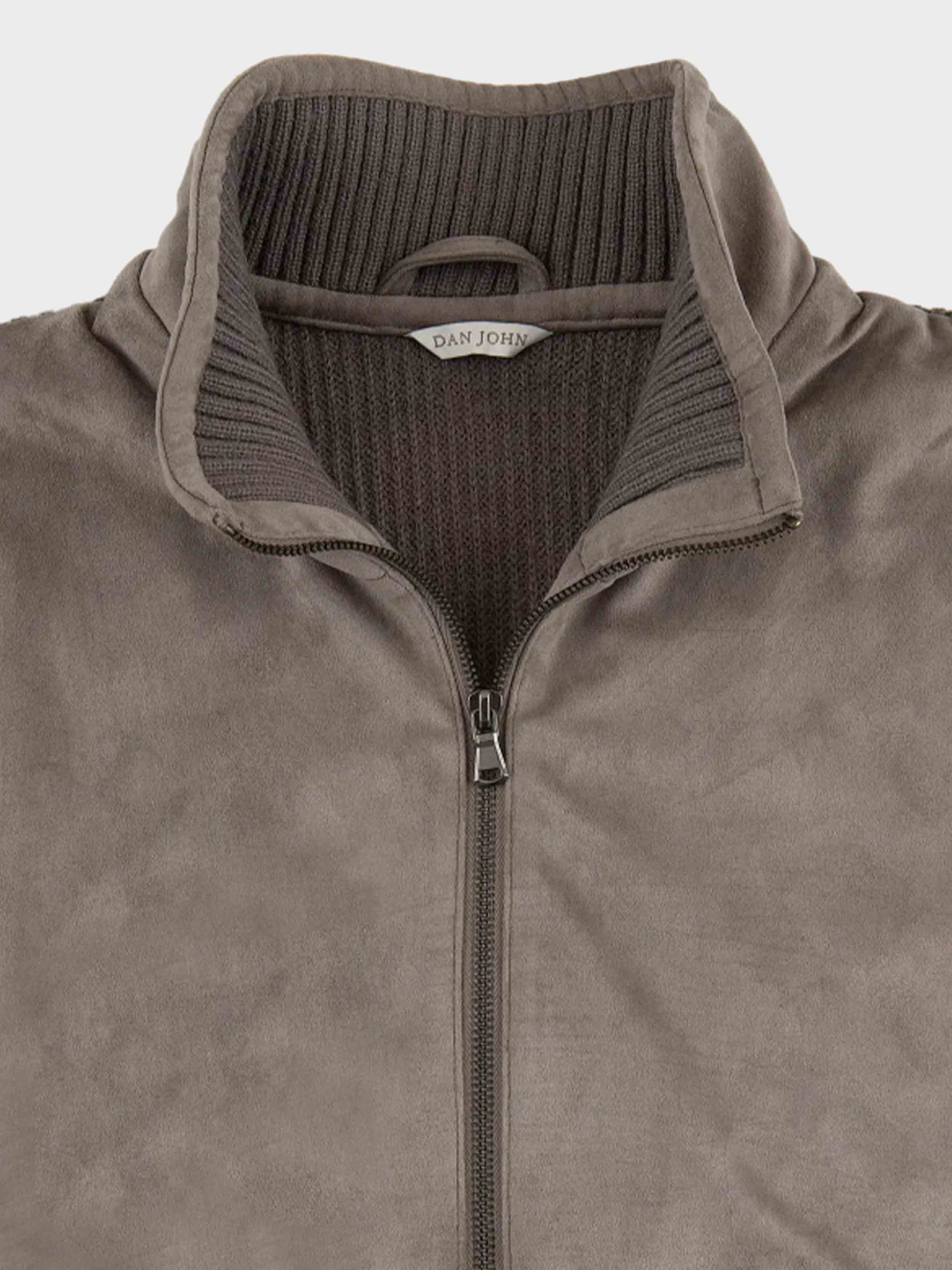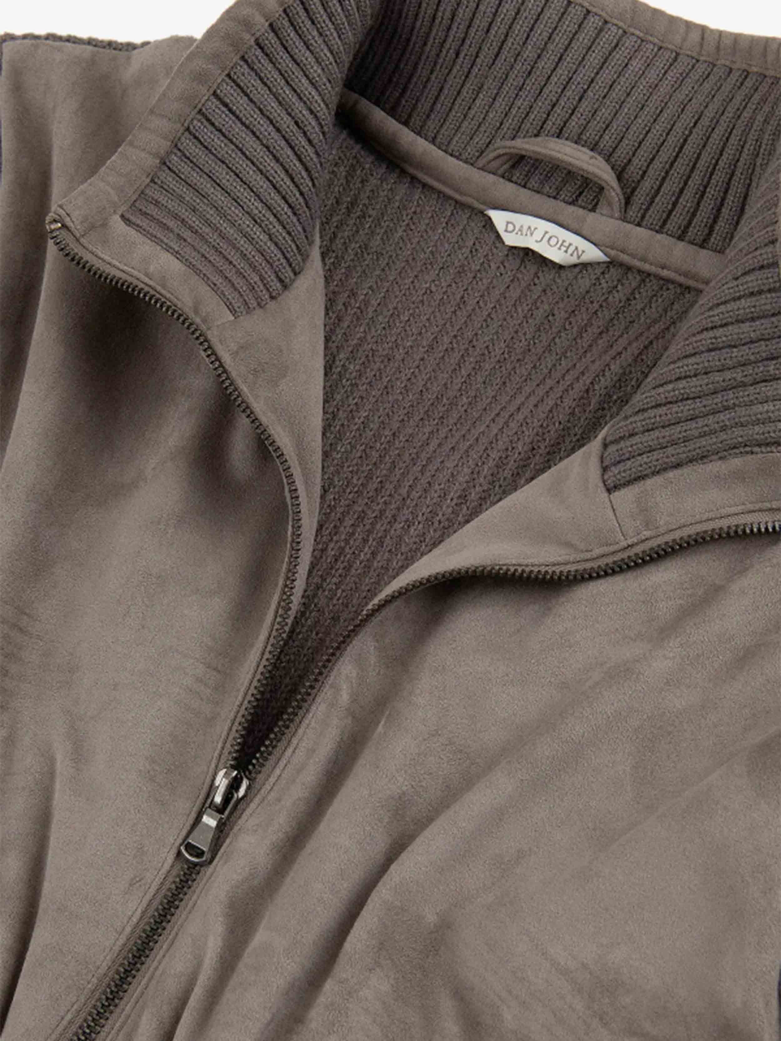 • Two-tone knit and faux suede bomber jacket with a high neck and side zip pockets.
