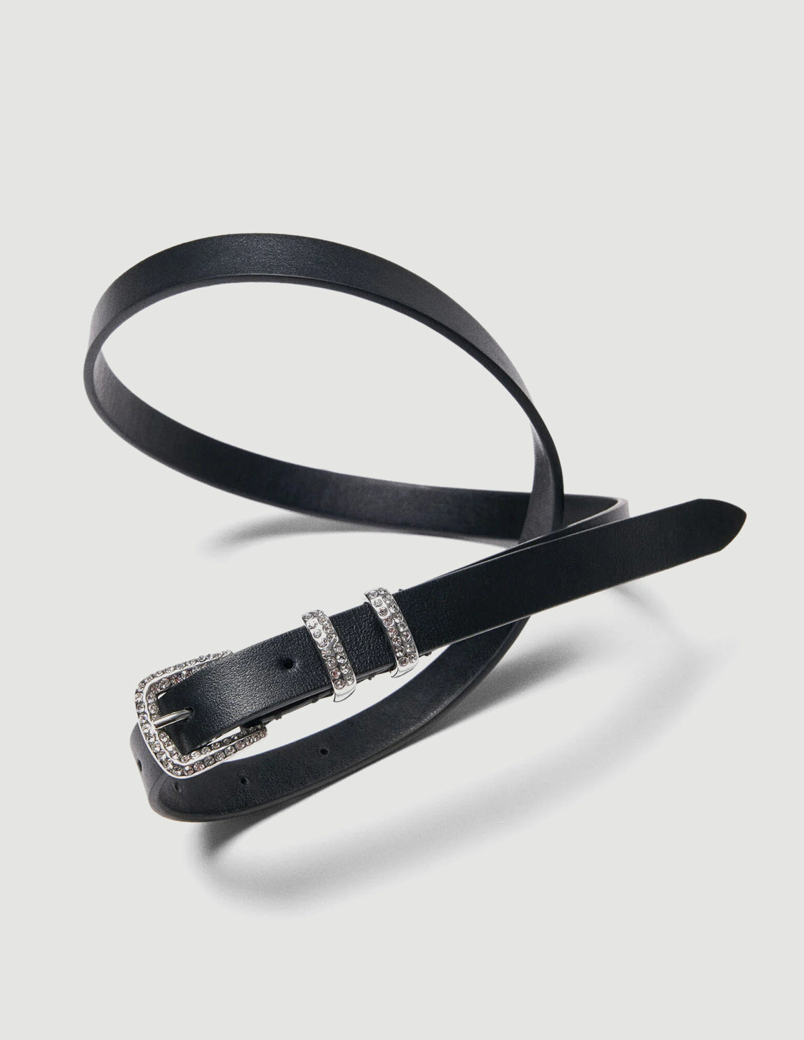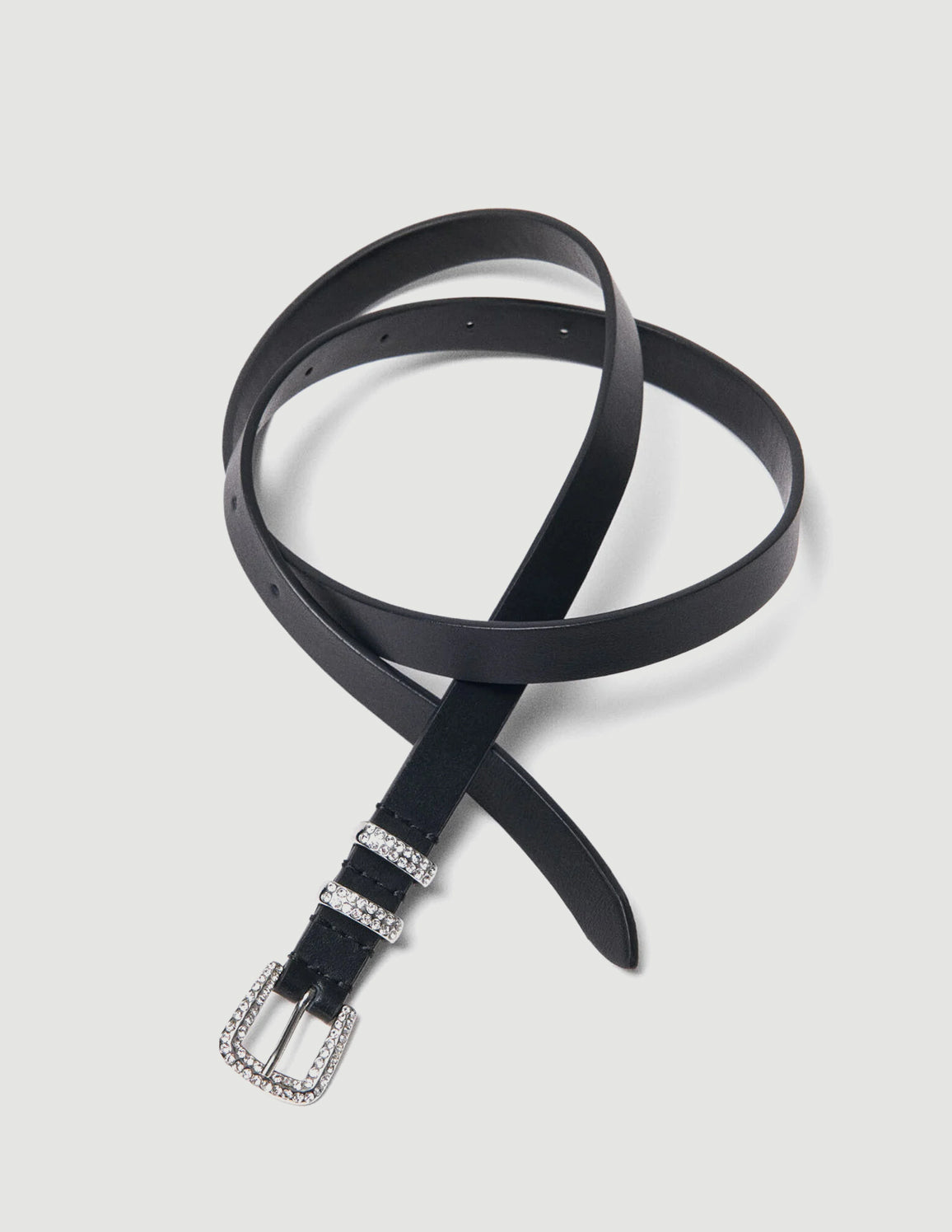• This slim belt adds a sparkling touch to your silhouette. Adorned with crystal rhinestones on its silver-tone metal buckle and loops, this statement belt is the must-have accessory for this season. Easy to adjust, it can be worn over a fitted black dress, with a flared skirt or with tailored trousers.