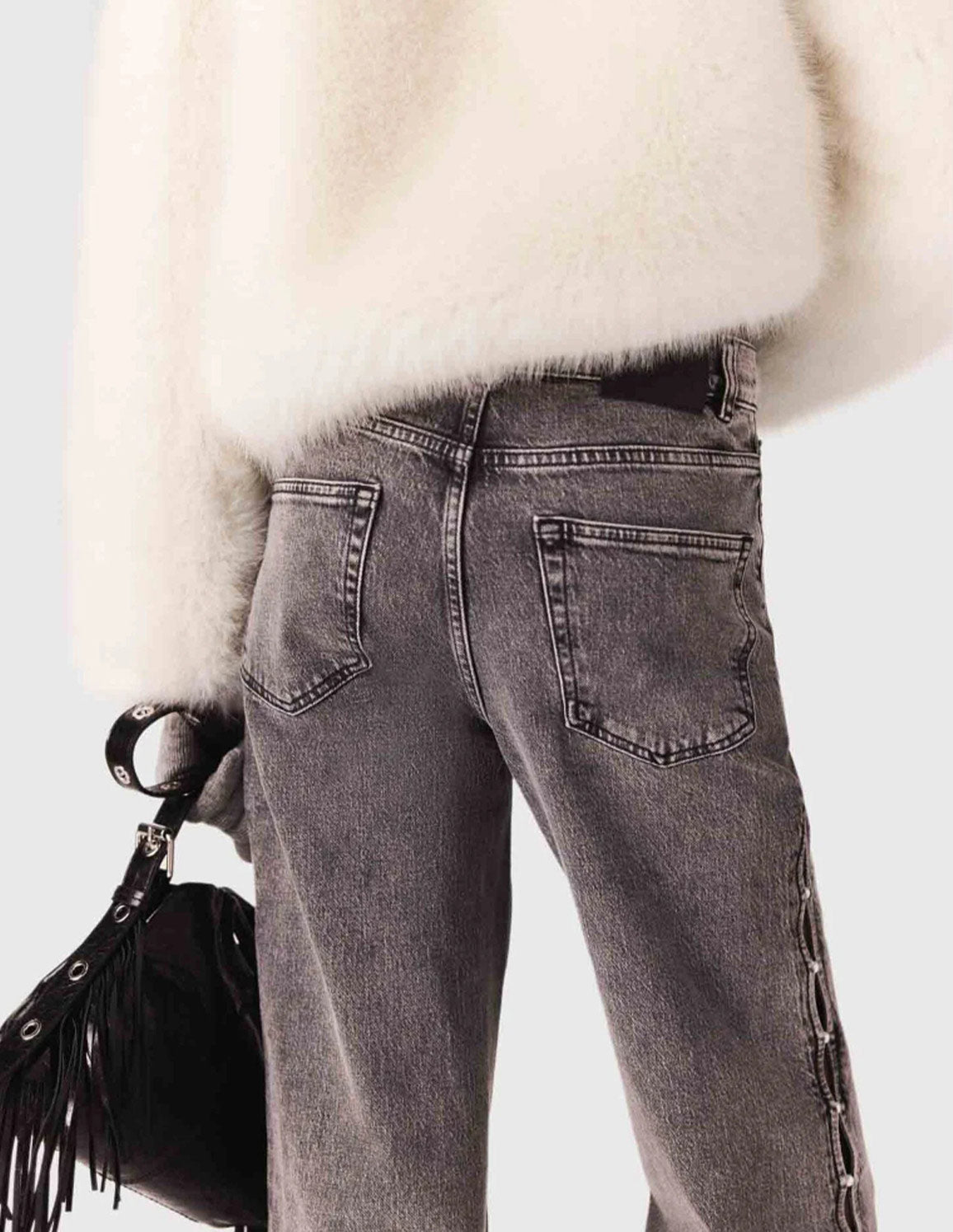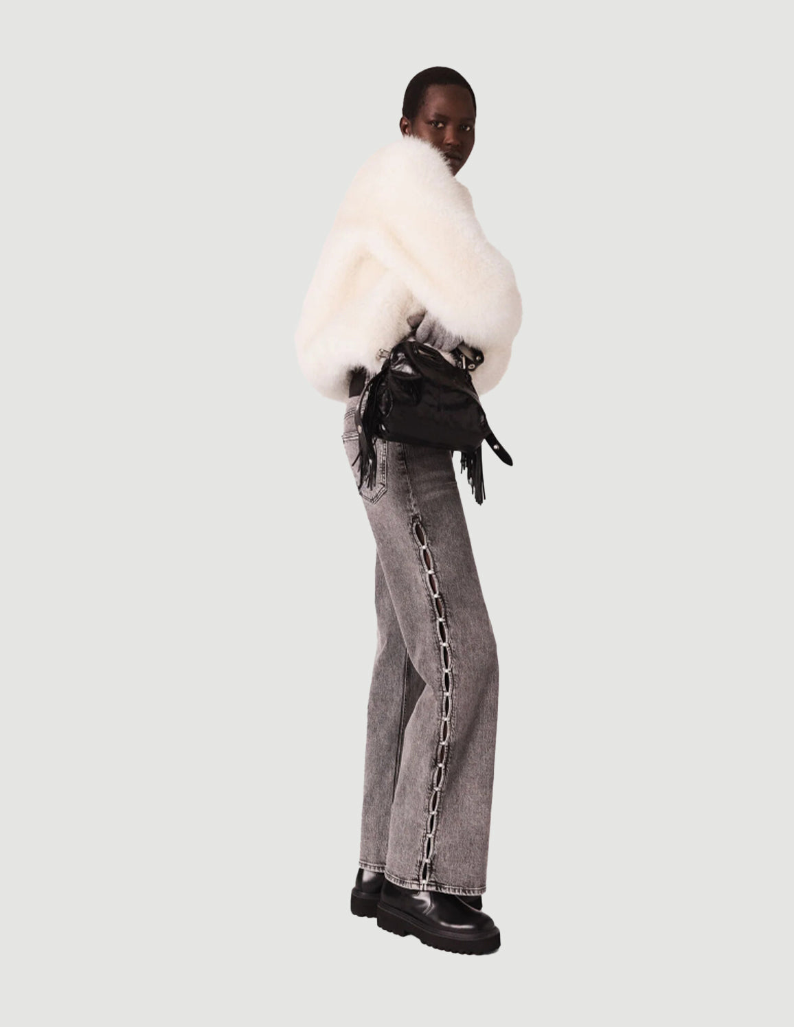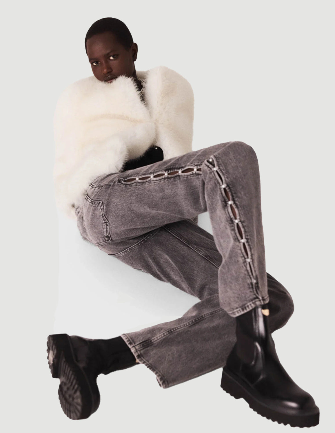 • These statement jeans are revisited with cutouts on the sides and an original detail. Pearly beads are revealed, elevating this must-have piece. Complete the look with a faux fur jacket and the season's key accessories: a fringed bag and leather boots.