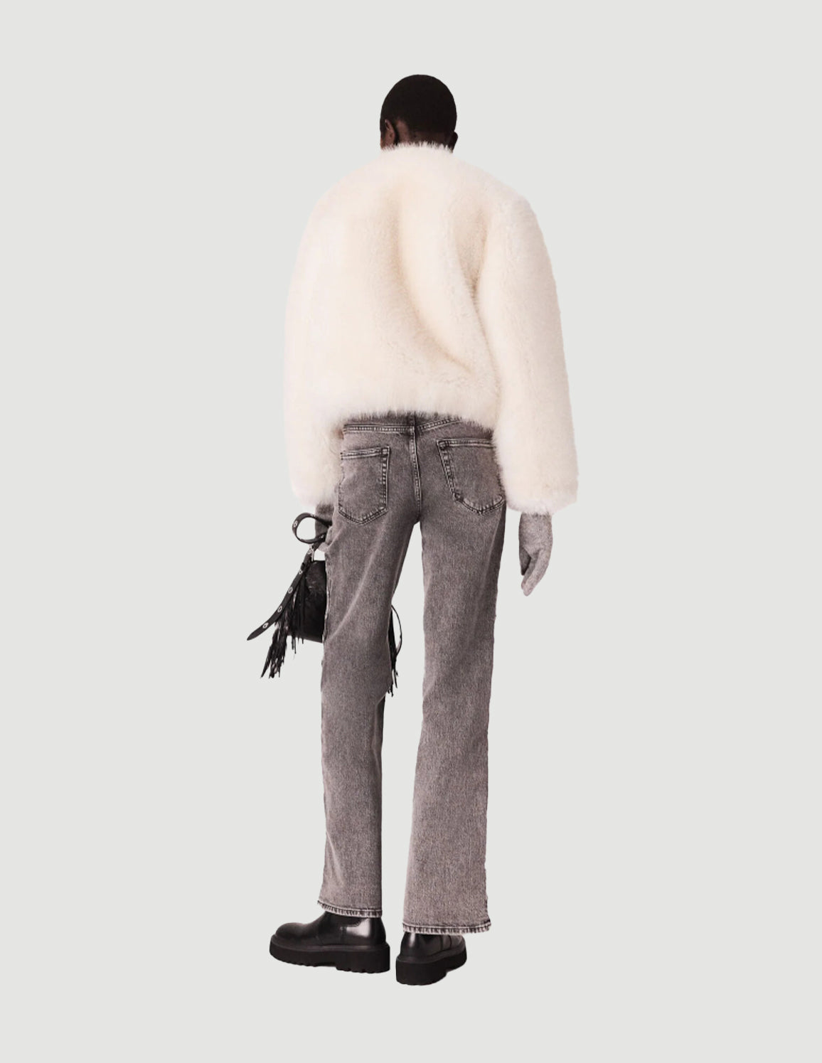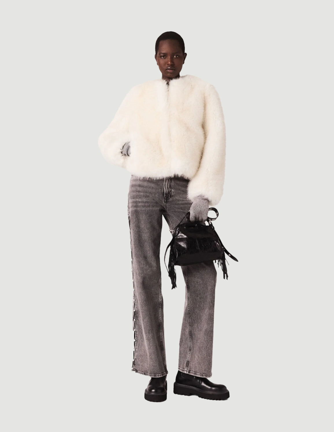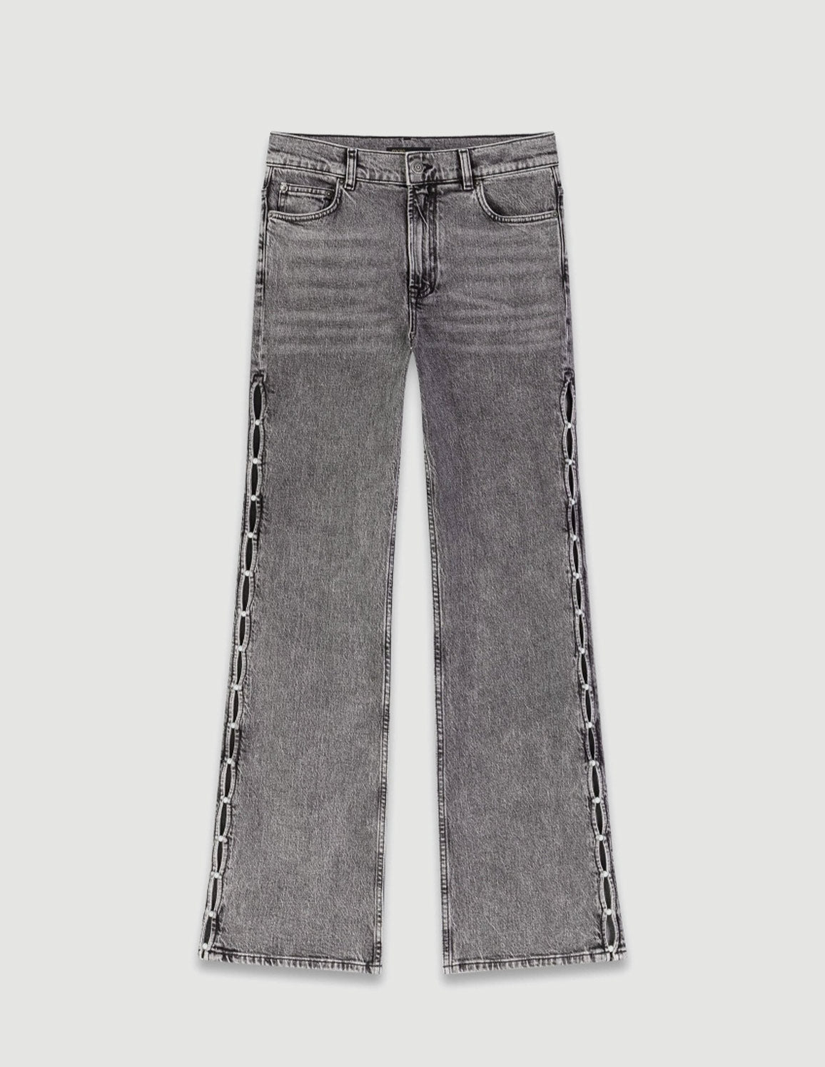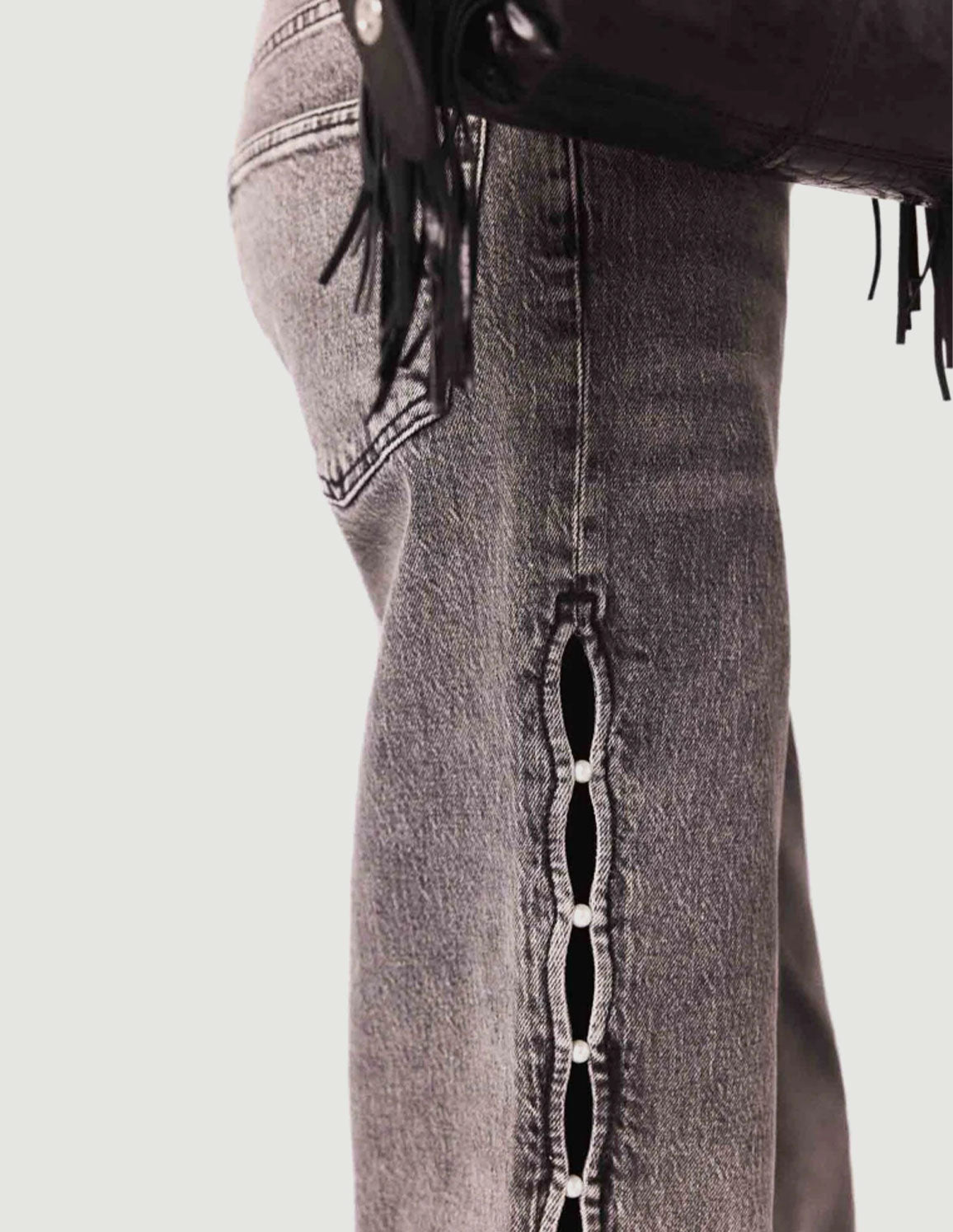 • These statement jeans are revisited with cutouts on the sides and an original detail. Pearly beads are revealed, elevating this must-have piece. Complete the look with a faux fur jacket and the season's key accessories: a fringed bag and leather boots.