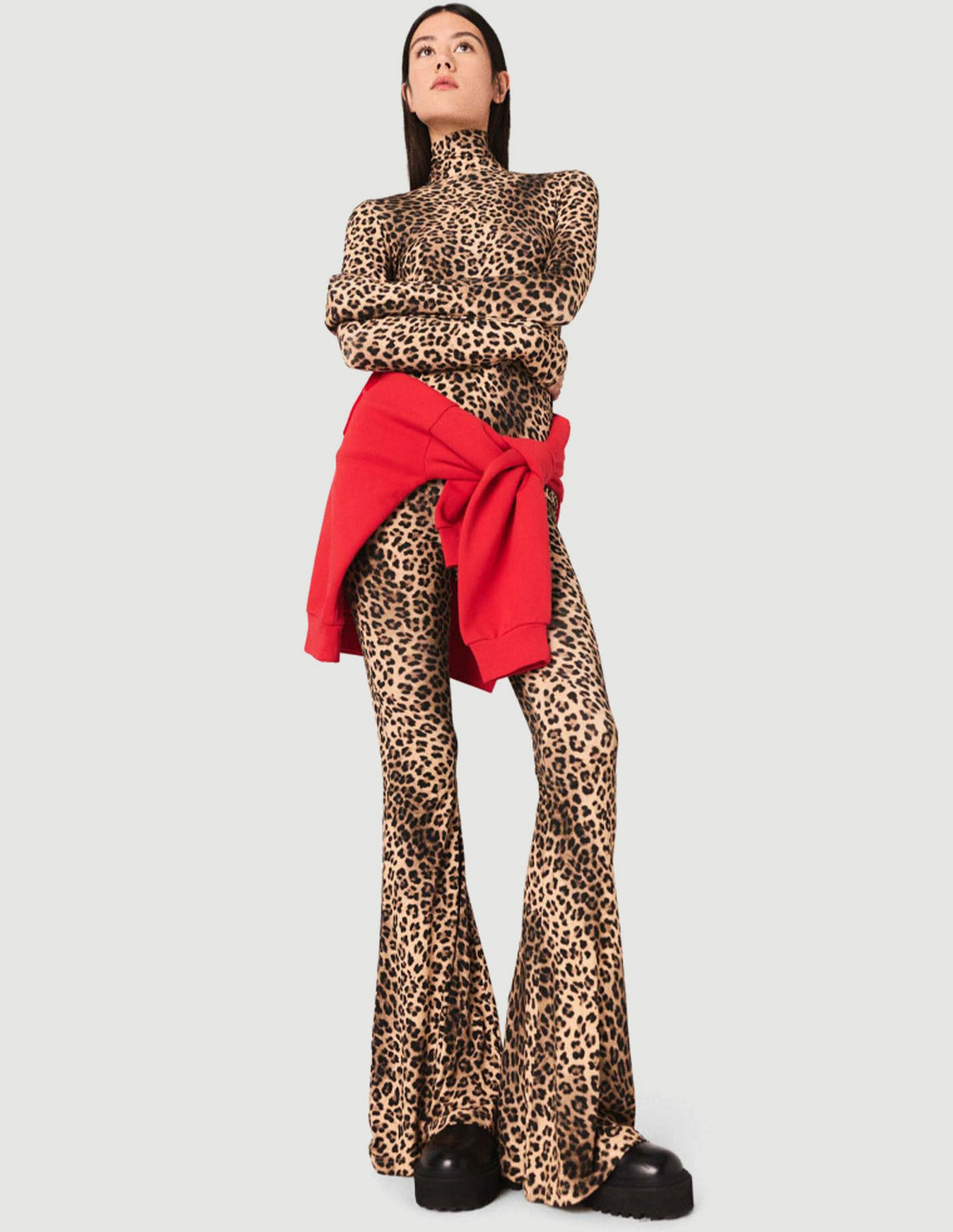 • With its flared cut, these leggings modernise the leopard print for a feminine and urban silhouette. Worn close to the body, it pairs perfectly with a matching turtleneck for a coordinated effect. Tied with a red sweatshirt at the waist and paired with chunky boots, it reveals its full streetwear energy.