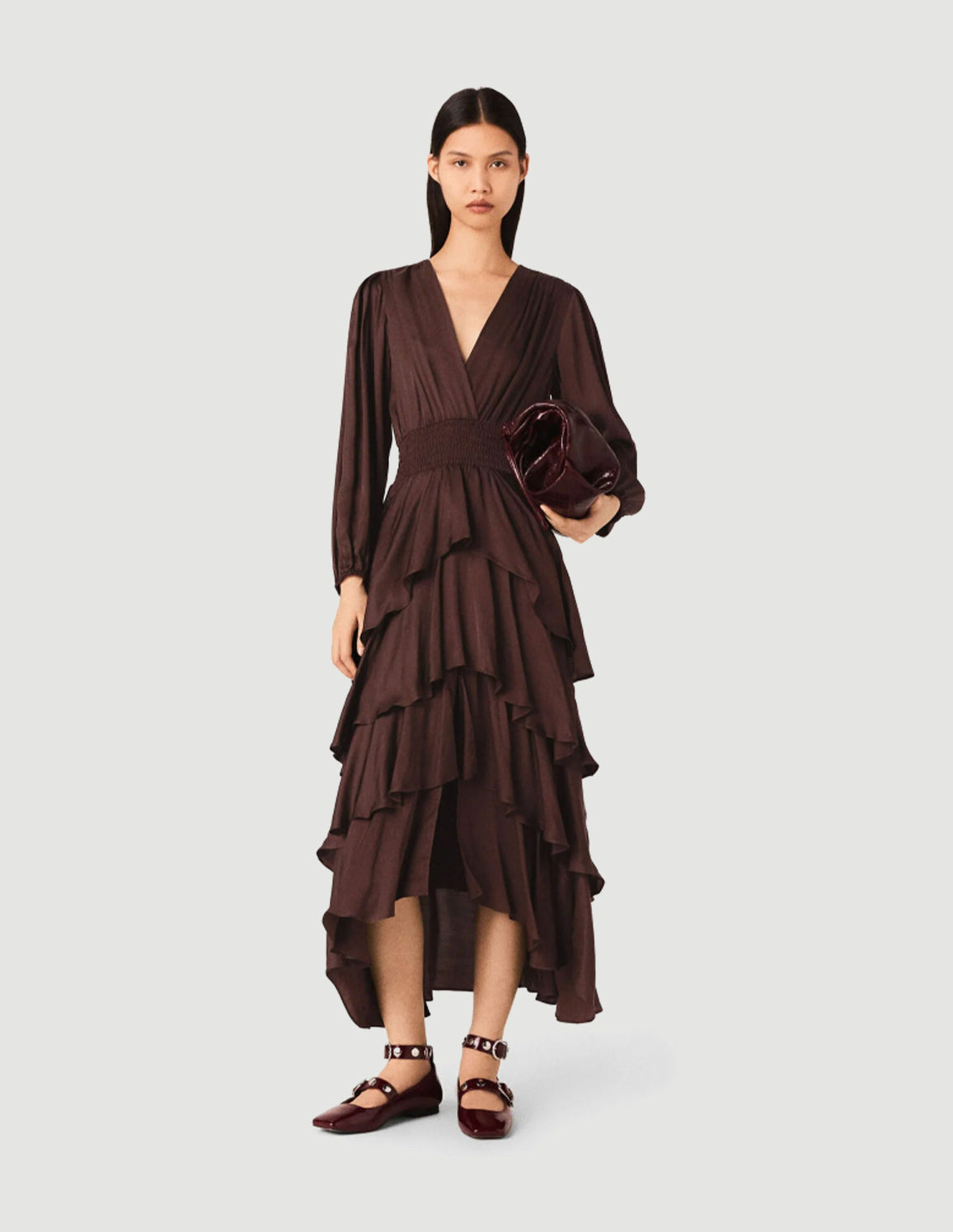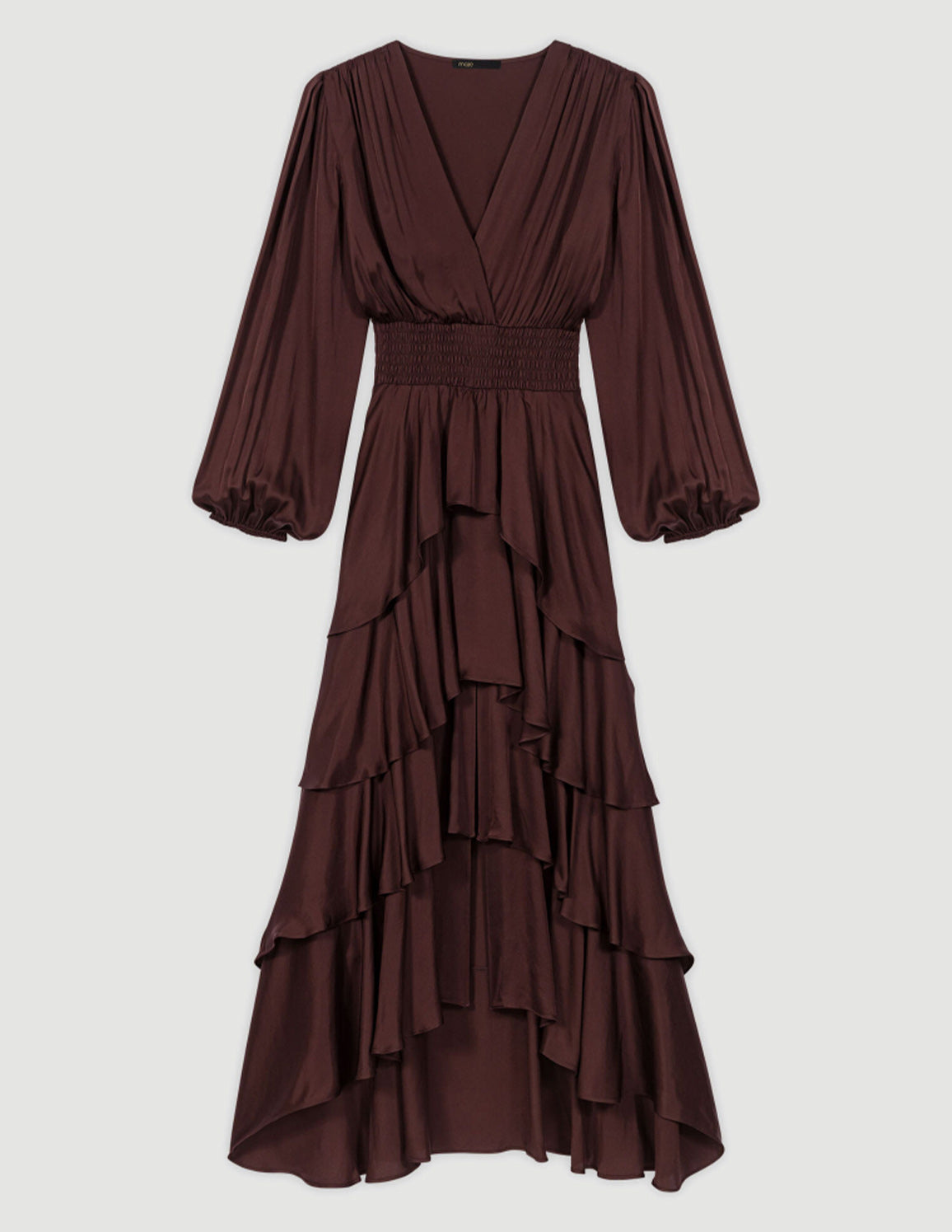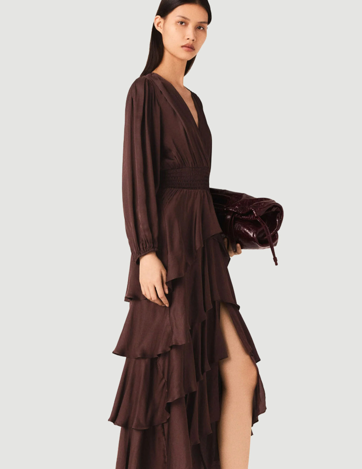 • Cascading ruffles and satin-effect fabric for a flowing, structured silhouette. This maxi dress plays on the contrast between a subtle sheen and ruffled details, true to the Maje DNA. The cross-over neckline defines the top perfectly, while the smocked waist and supple sleeves ensure a comfortable and elegant fit. The front slit and asymmetrical hem accentuate the movement.