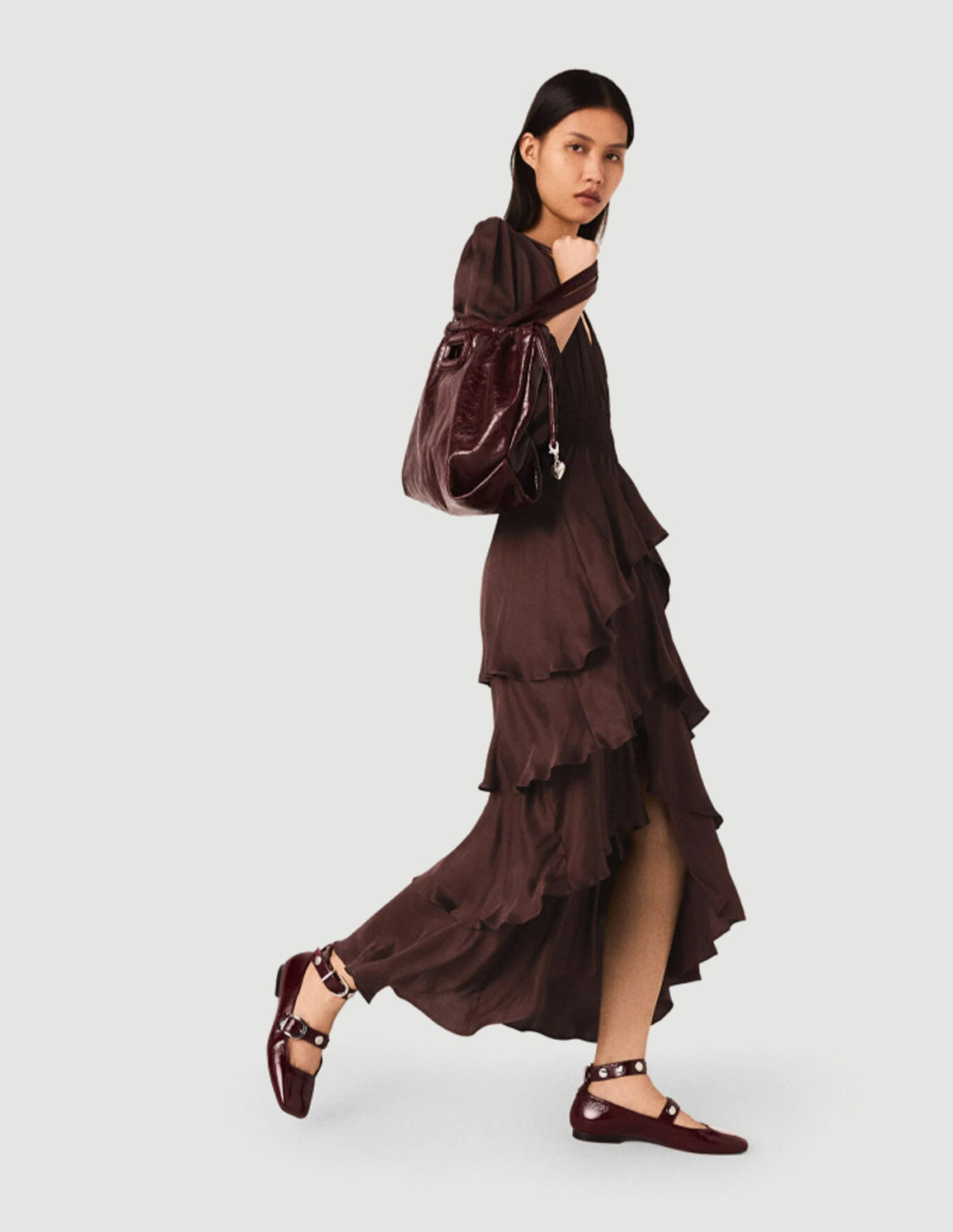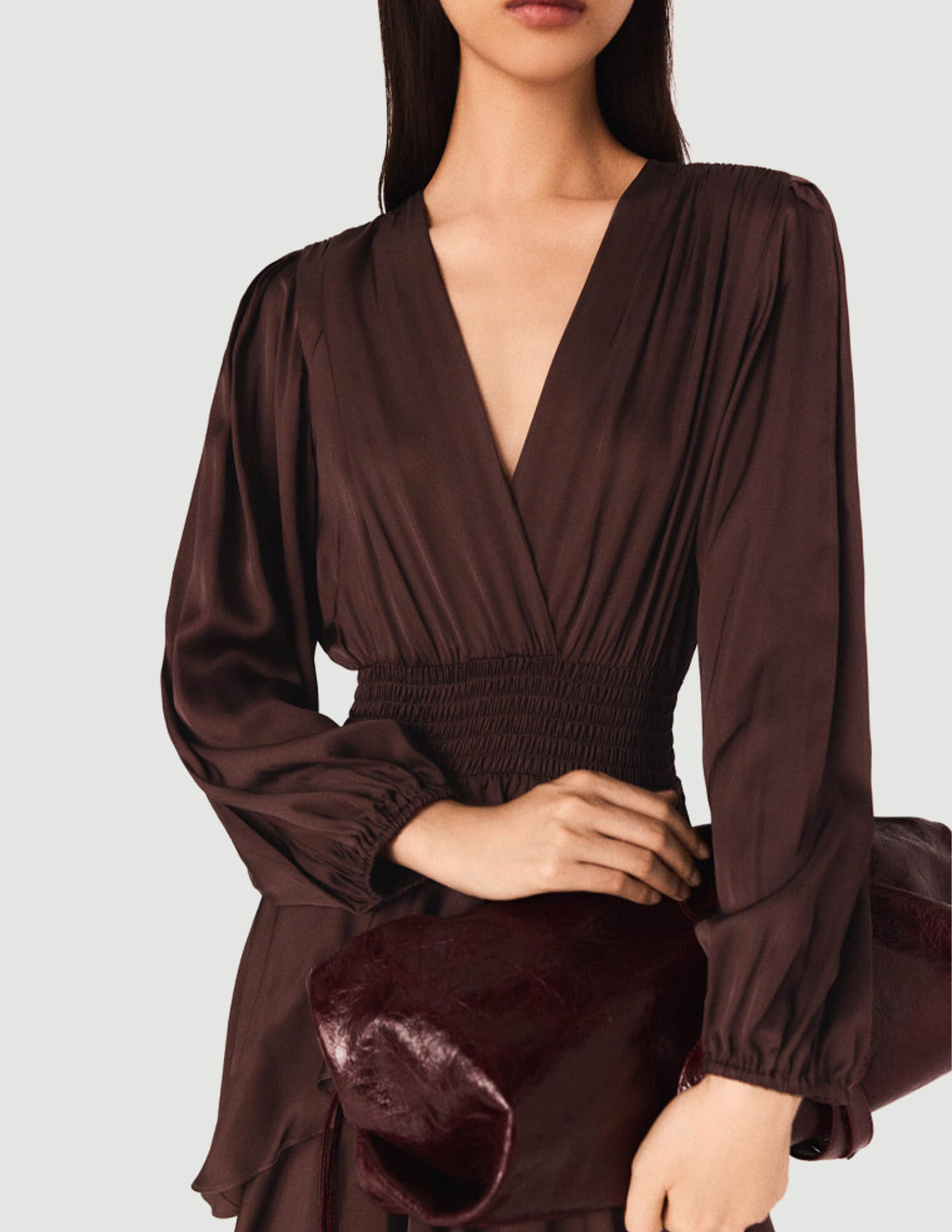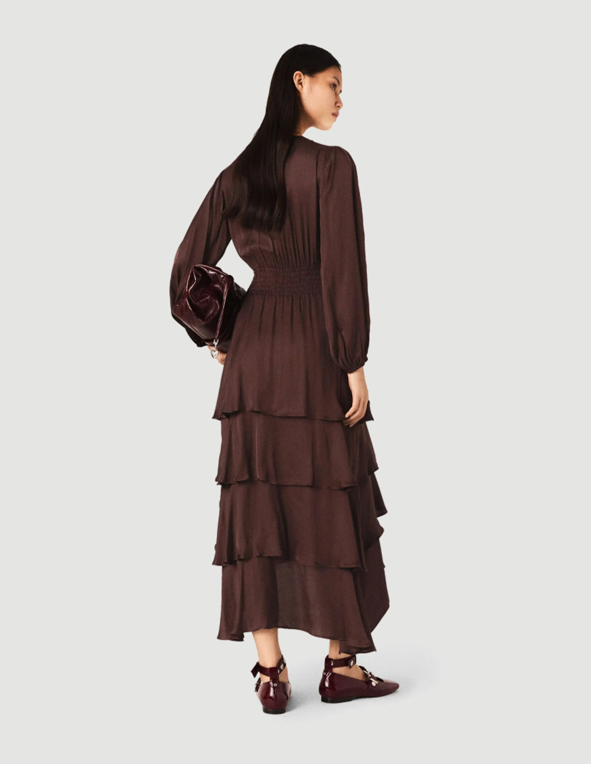 • Cascading ruffles and satin-effect fabric for a flowing, structured silhouette. This maxi dress plays on the contrast between a subtle sheen and ruffled details, true to the Maje DNA. The cross-over neckline defines the top perfectly, while the smocked waist and supple sleeves ensure a comfortable and elegant fit. The front slit and asymmetrical hem accentuate the movement.
