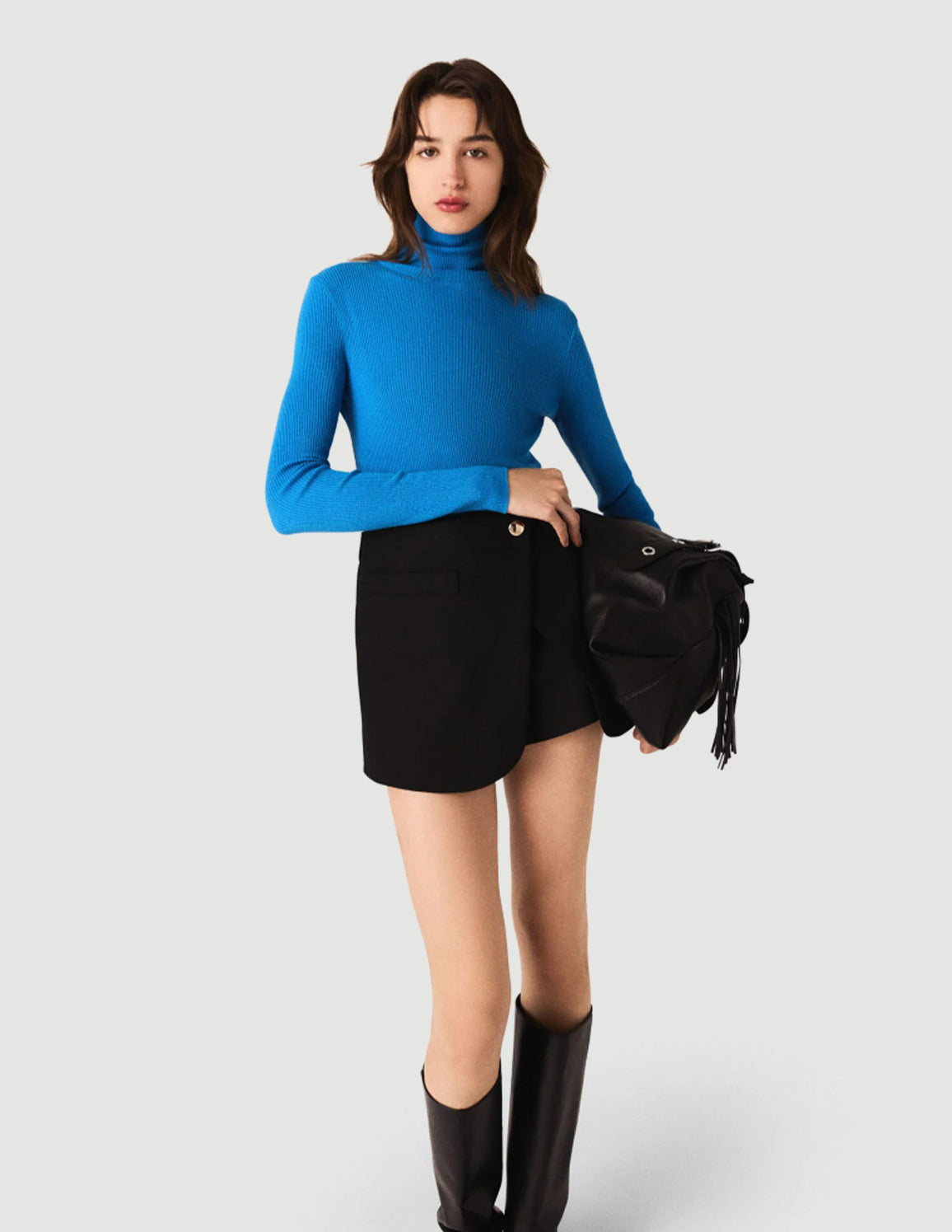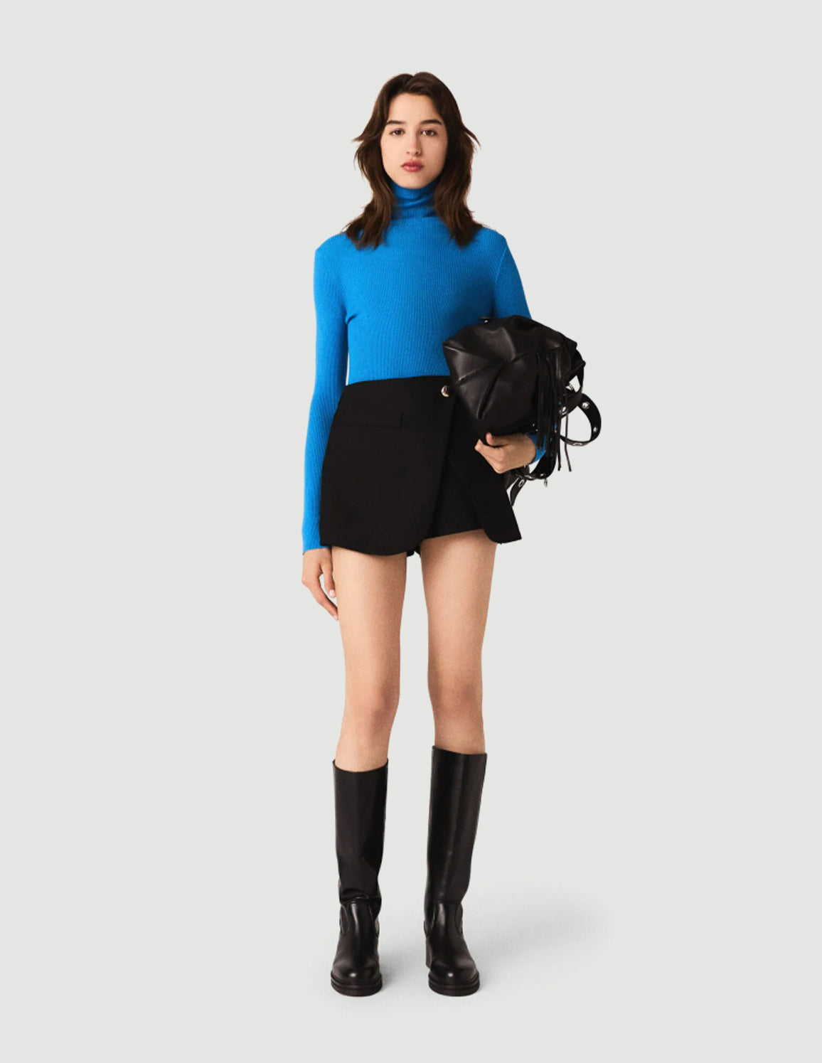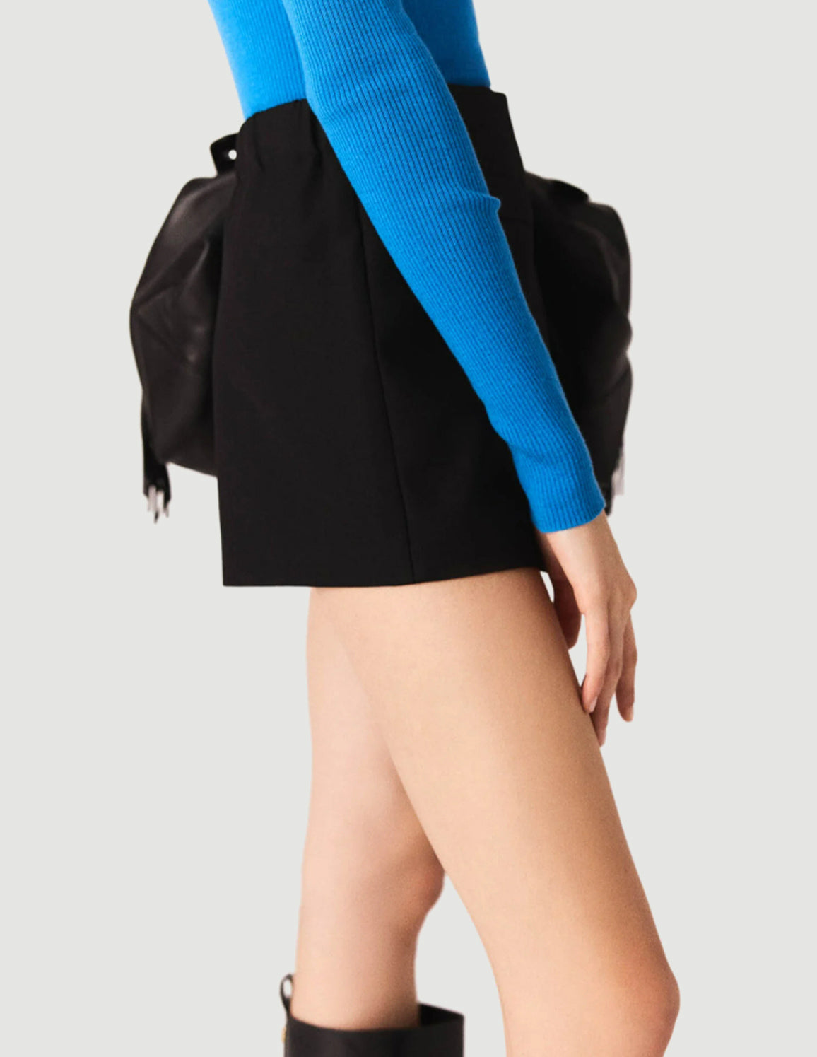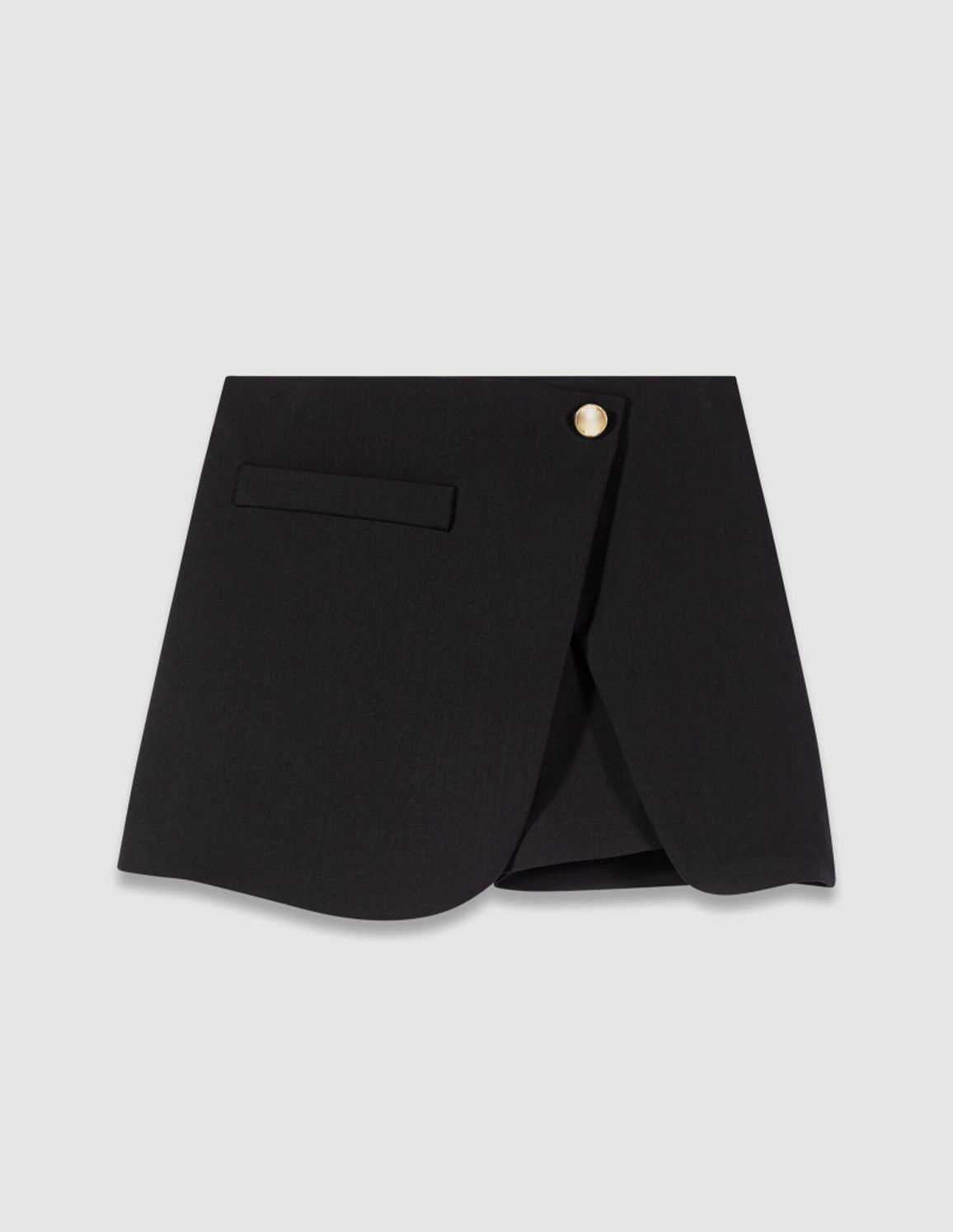 • A cross between structured tailoring and a graphic silhouette, these black layered-effect shorts are a bold new take on the mini skirt. Their asymmetrical panel adds movement and modernity, accentuated by a fitted waist and a discreet button detail. The overall look evokes a metropolitan elegance, designed for playing with contrasting styles.