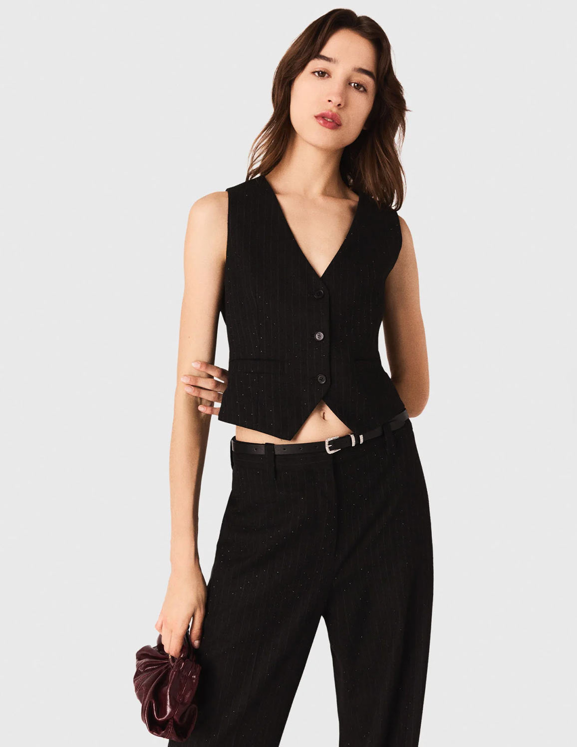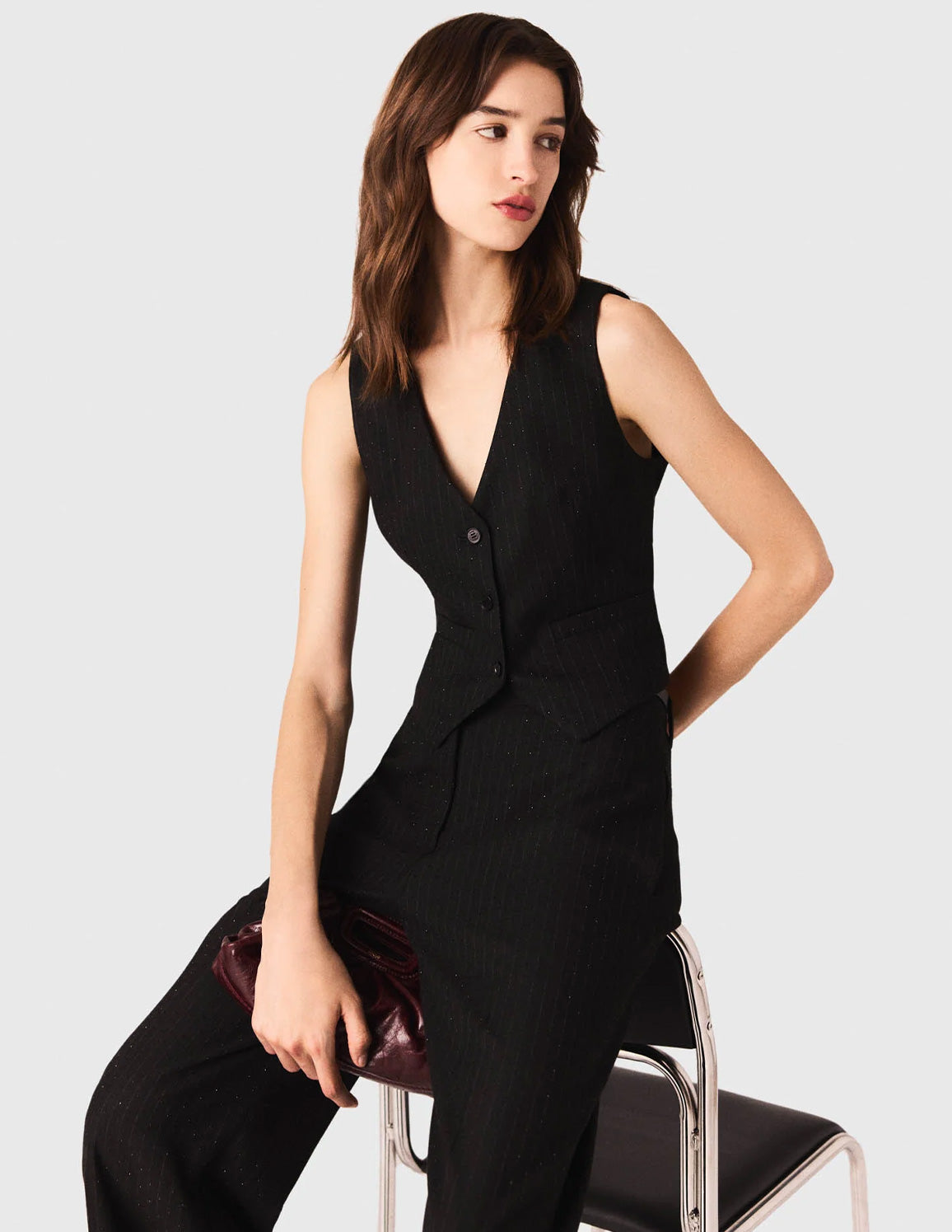• A blend of sharp tailoring and subtle sparkle, this sleeveless jacket reinterprets the codes of suiting. The fine diamanté pinstripes add a luxurious touch, while its tailored fit flatters the silhouette. A belt detail at the back and side pockets add a practical touch.